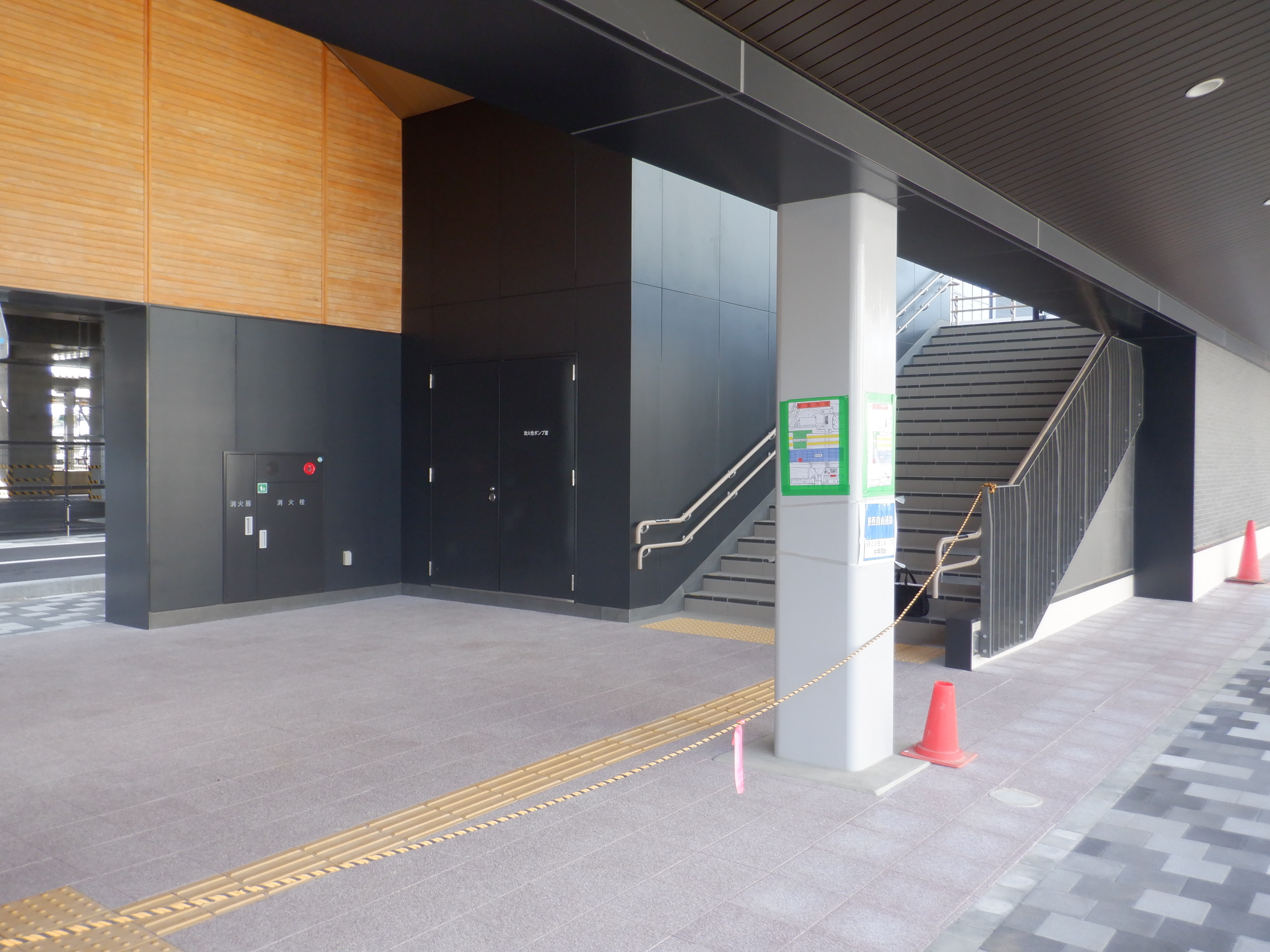 東口側の自由通路出入口の手すりの案内は隠されています。