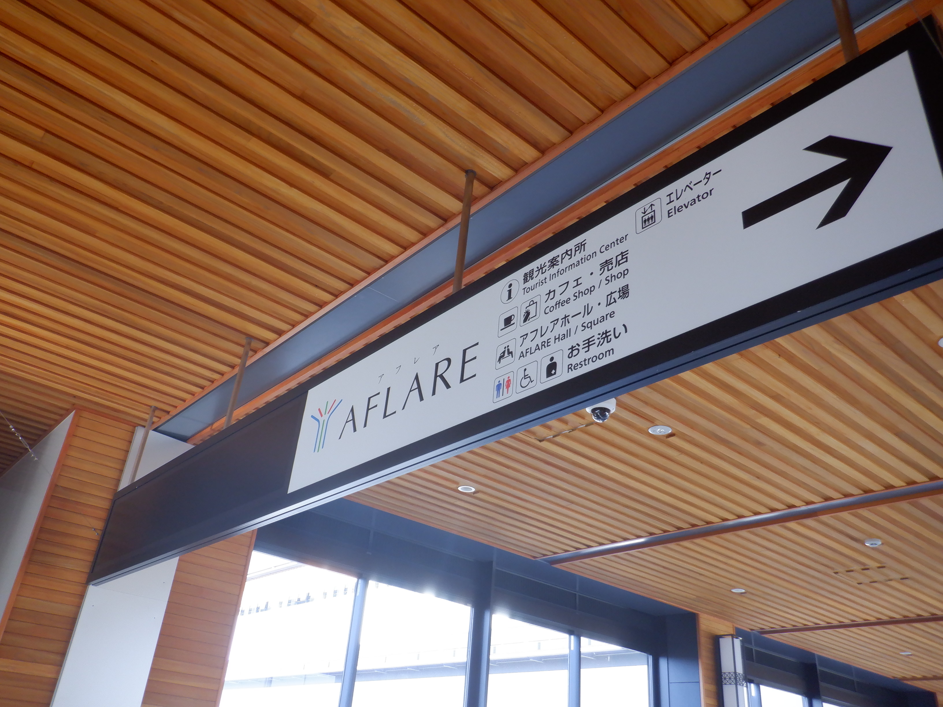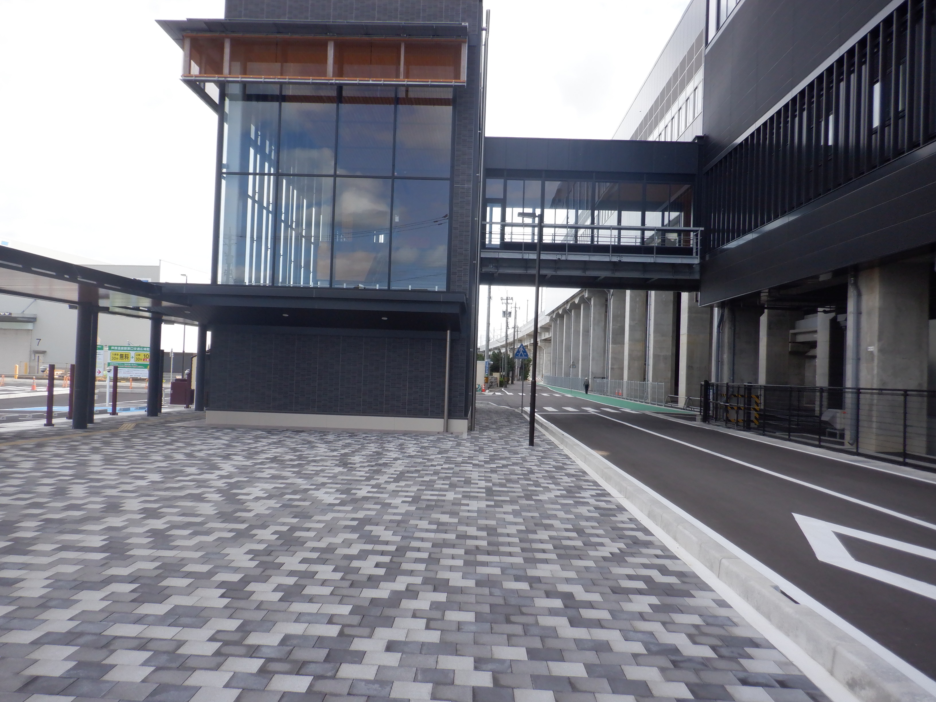 道路の反対側から自由通路の出入口とアフレア。