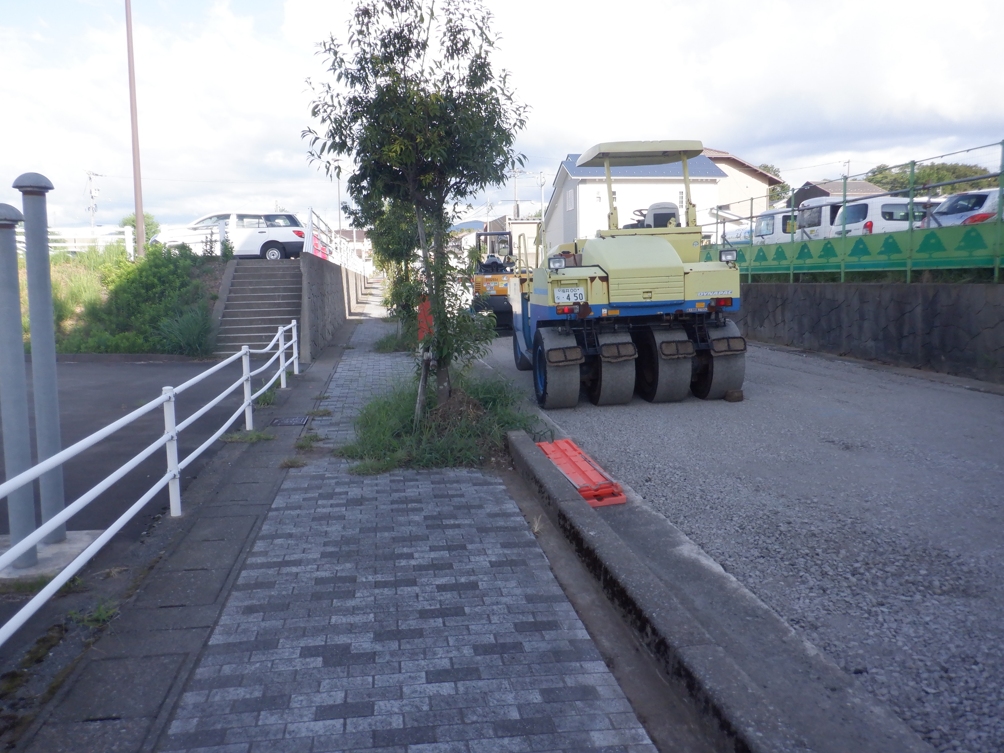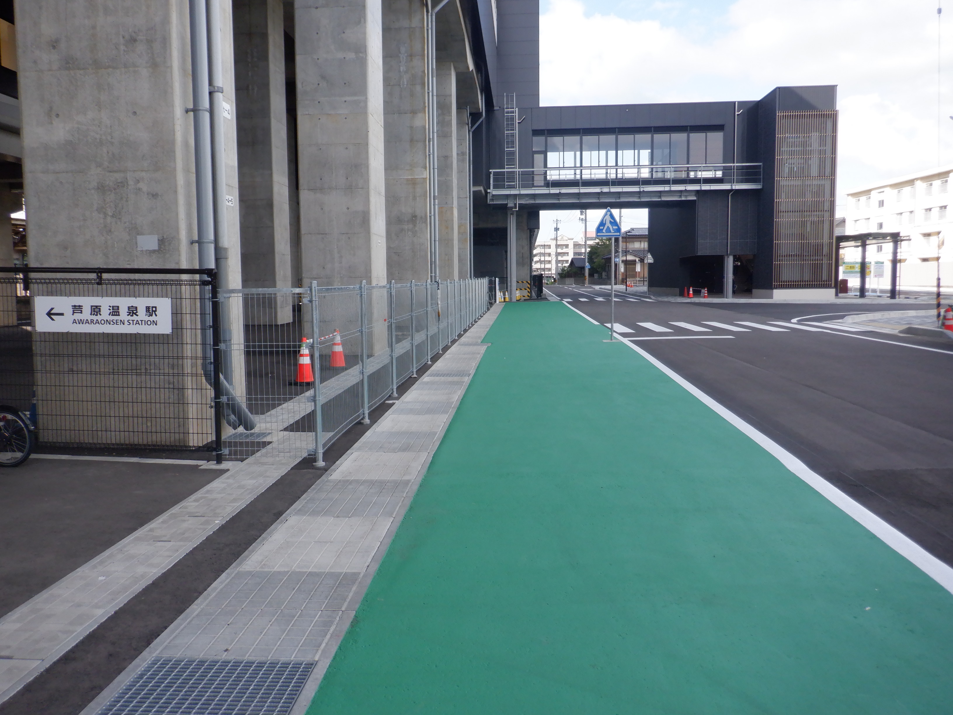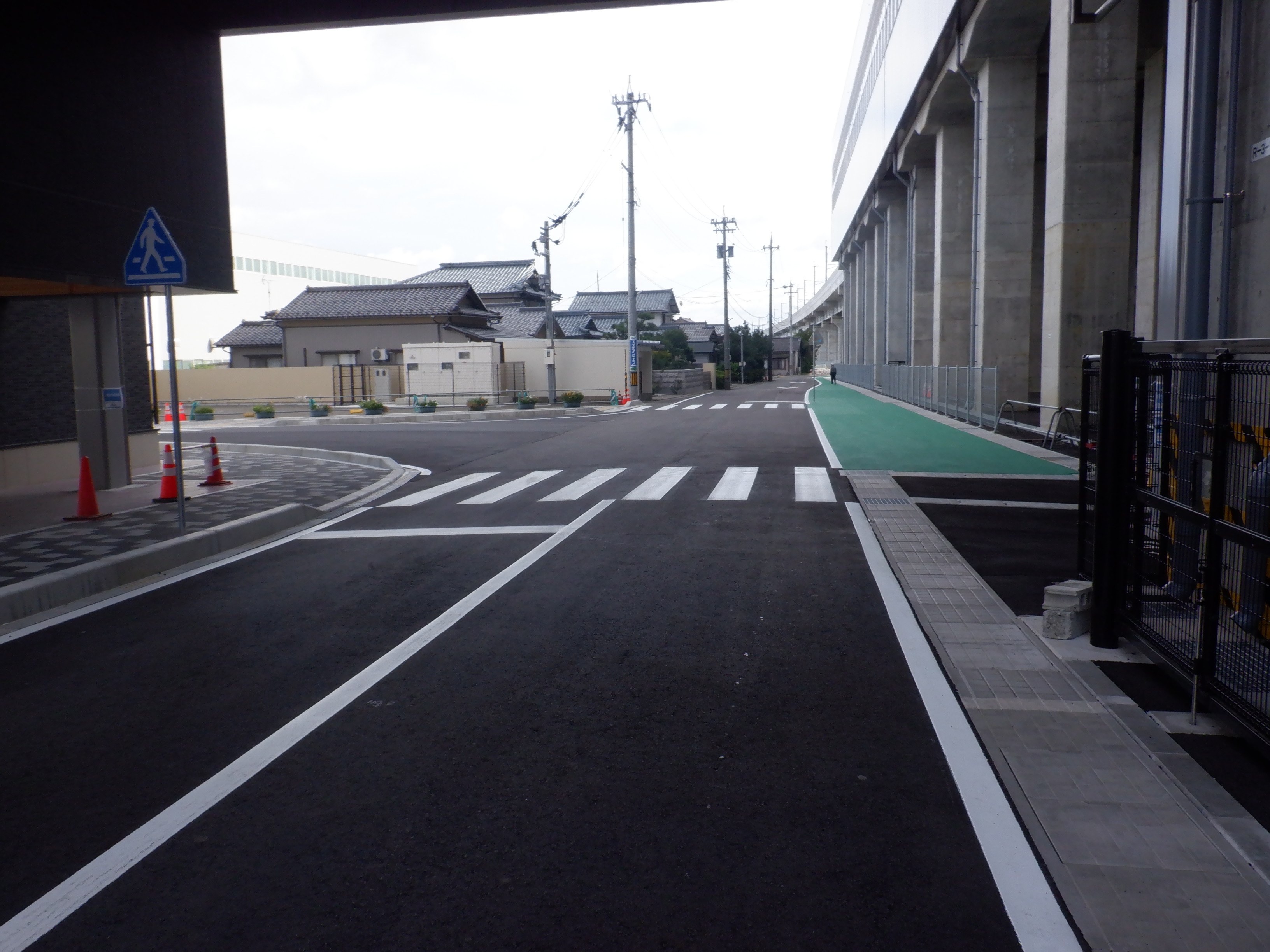東口に出たところ。歩道となる部分が緑色に塗装されました。