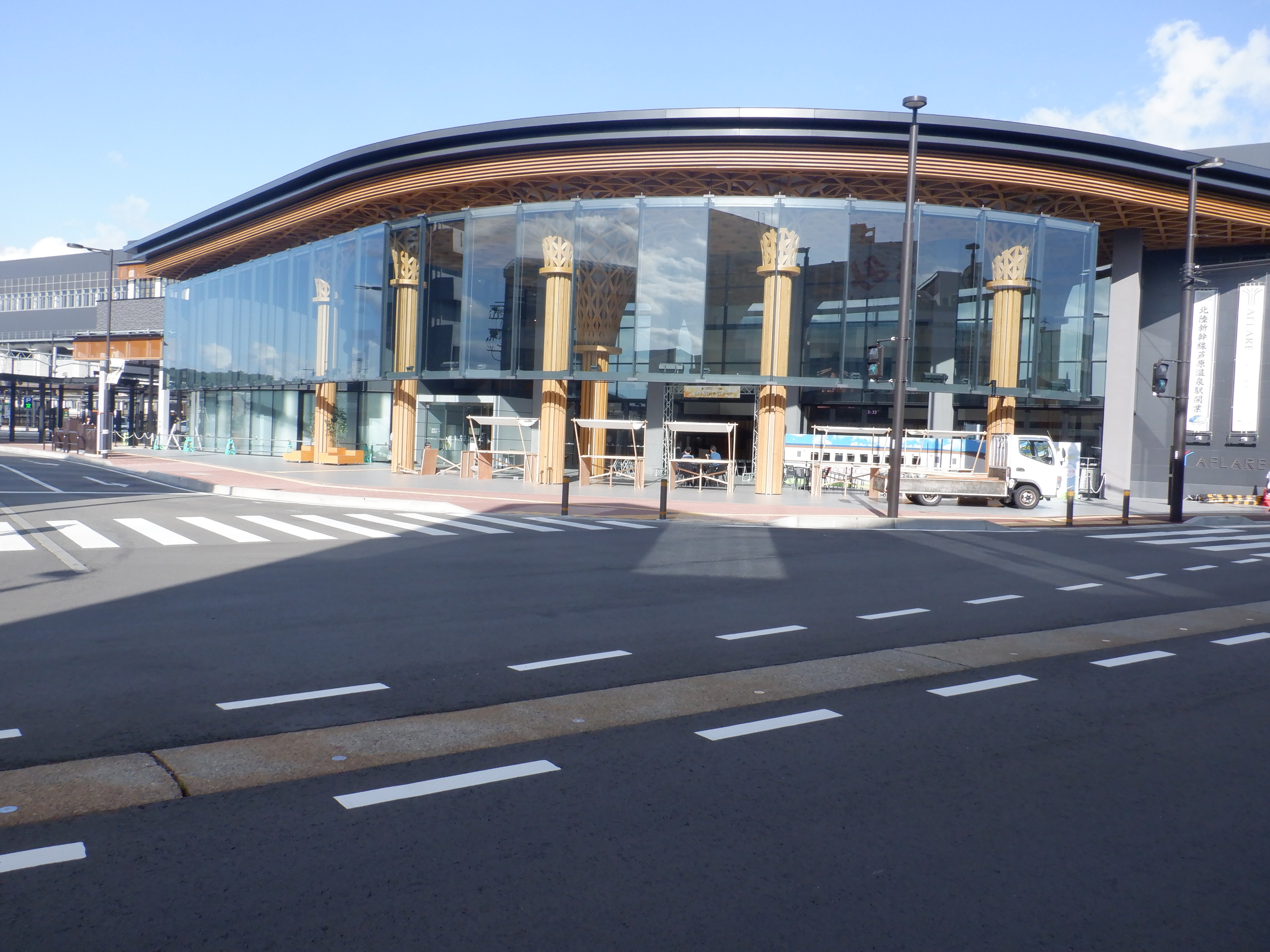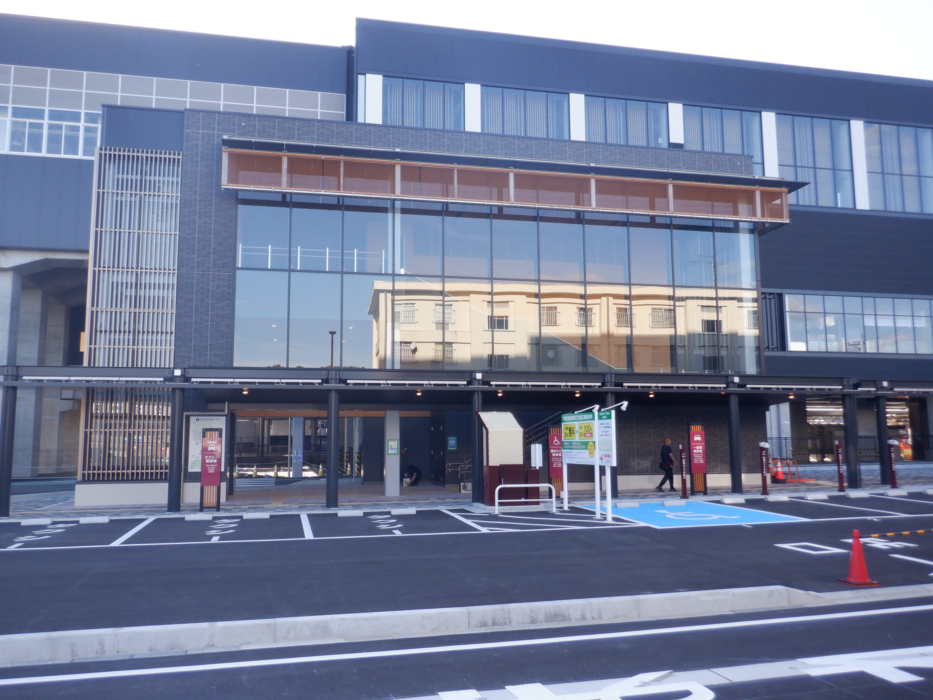 西口の新幹線駅舎と交通広場。