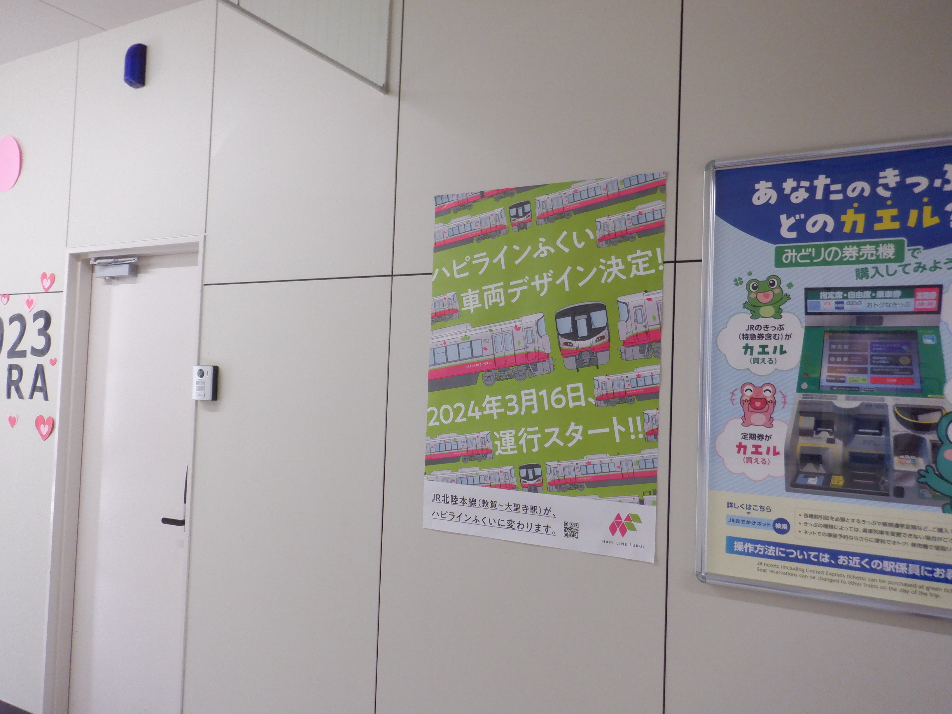 券売機とハピラインふくいのポスター。