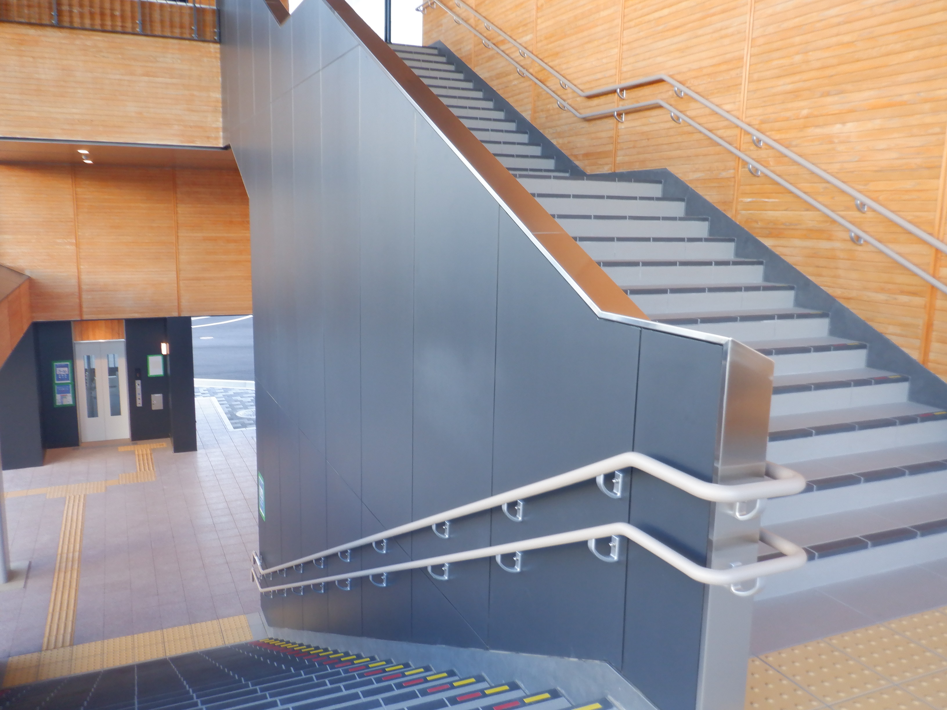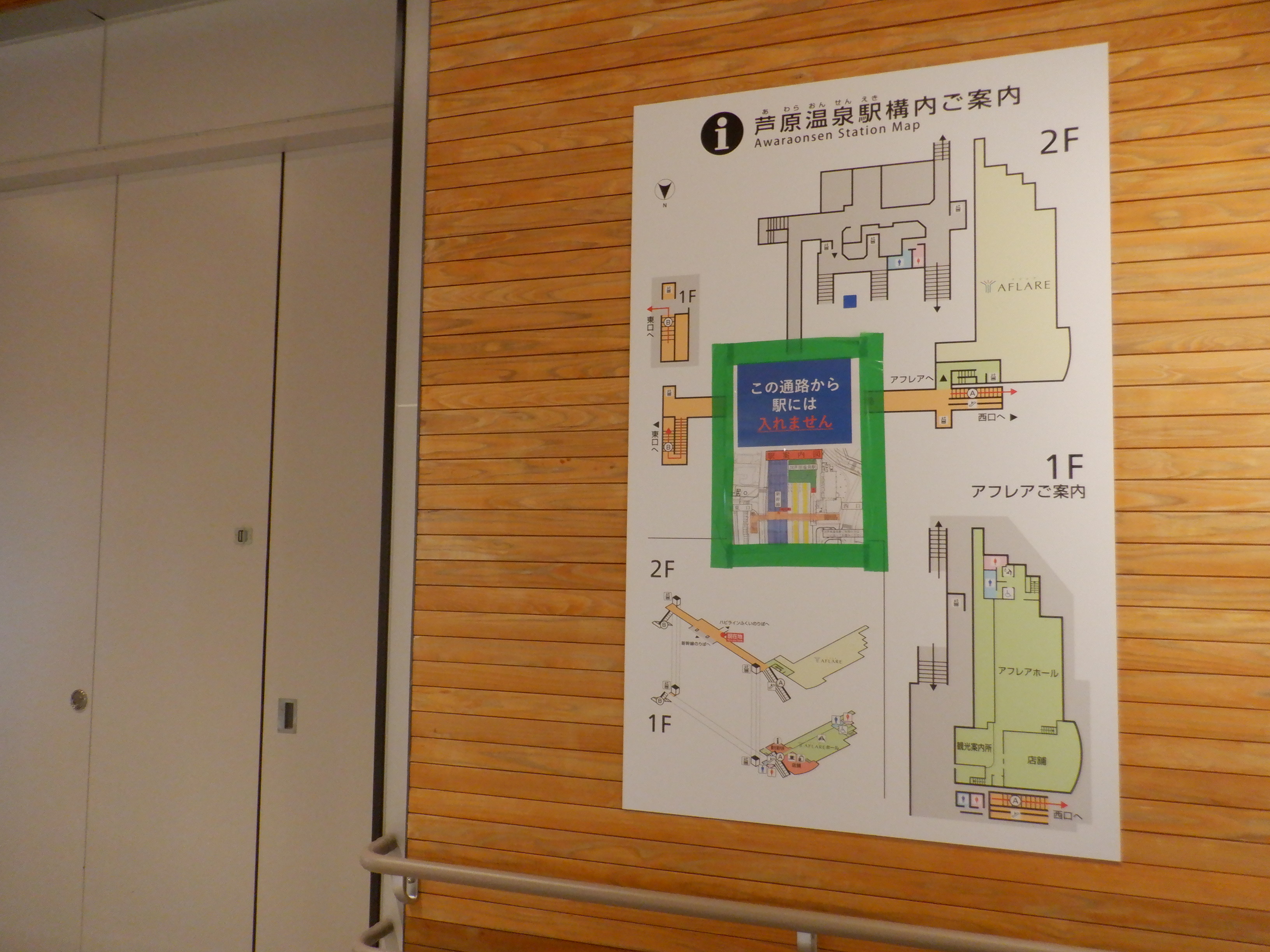 西口側の自由通路出入口の手すりの案内も隠されています。