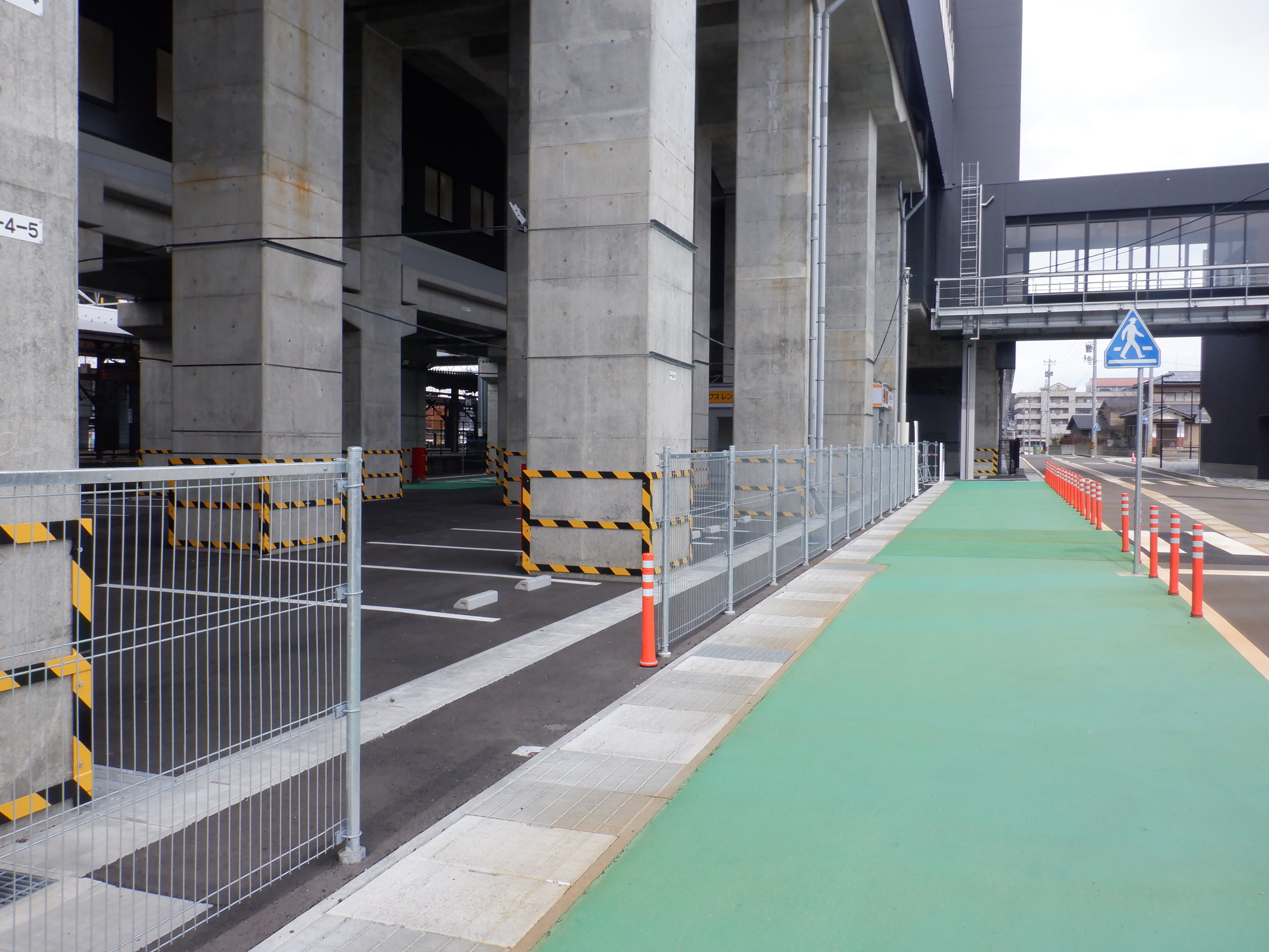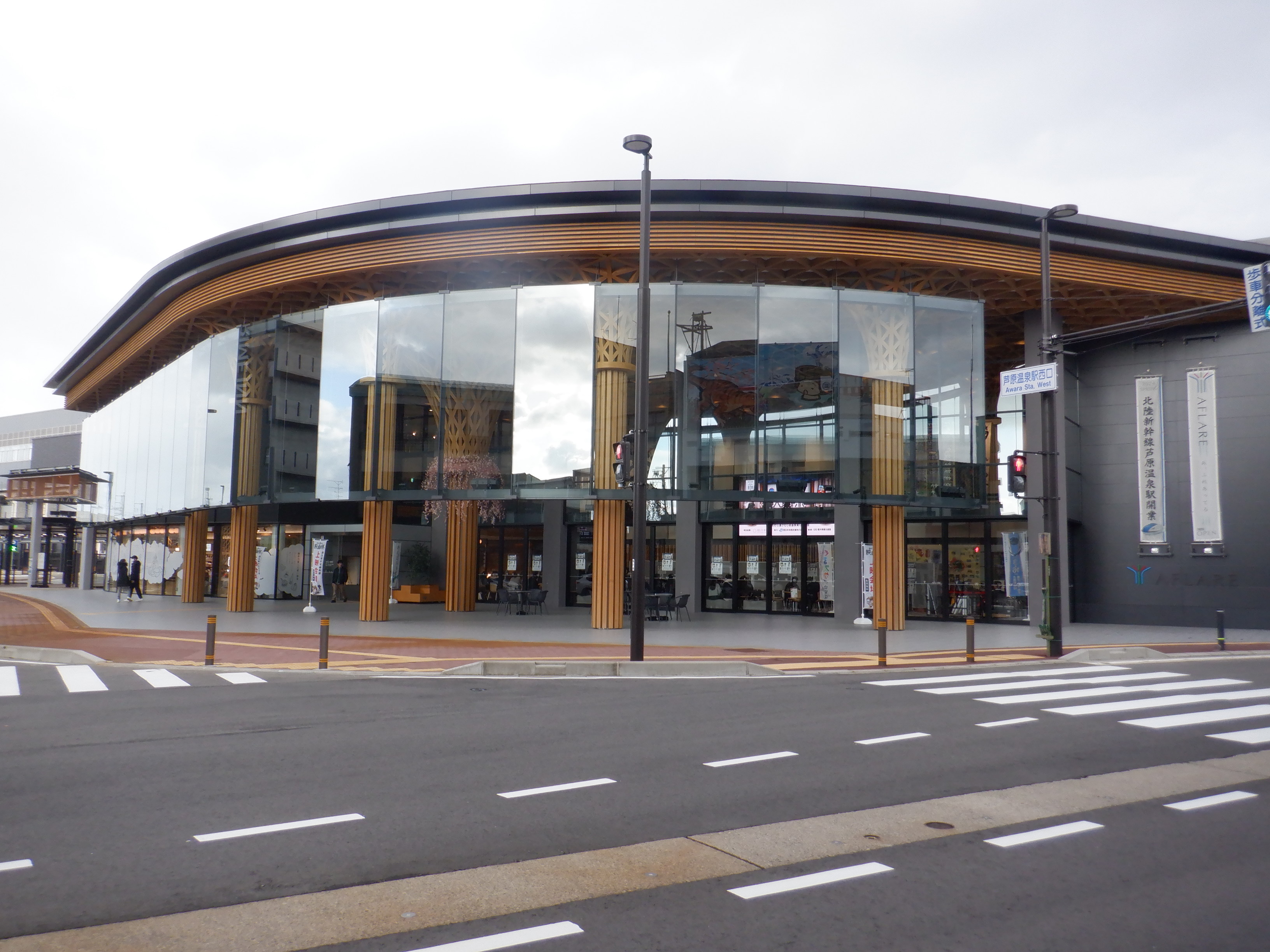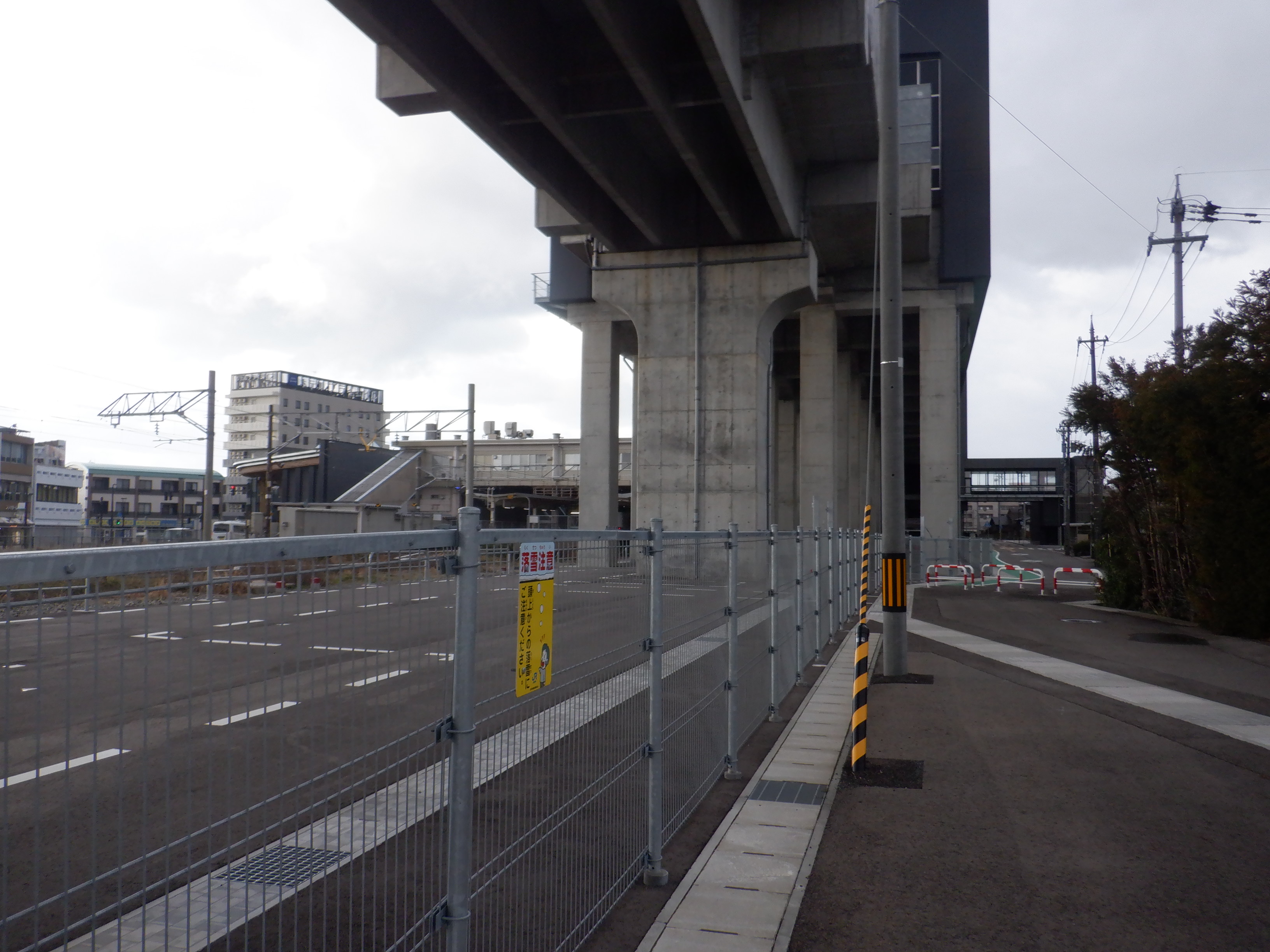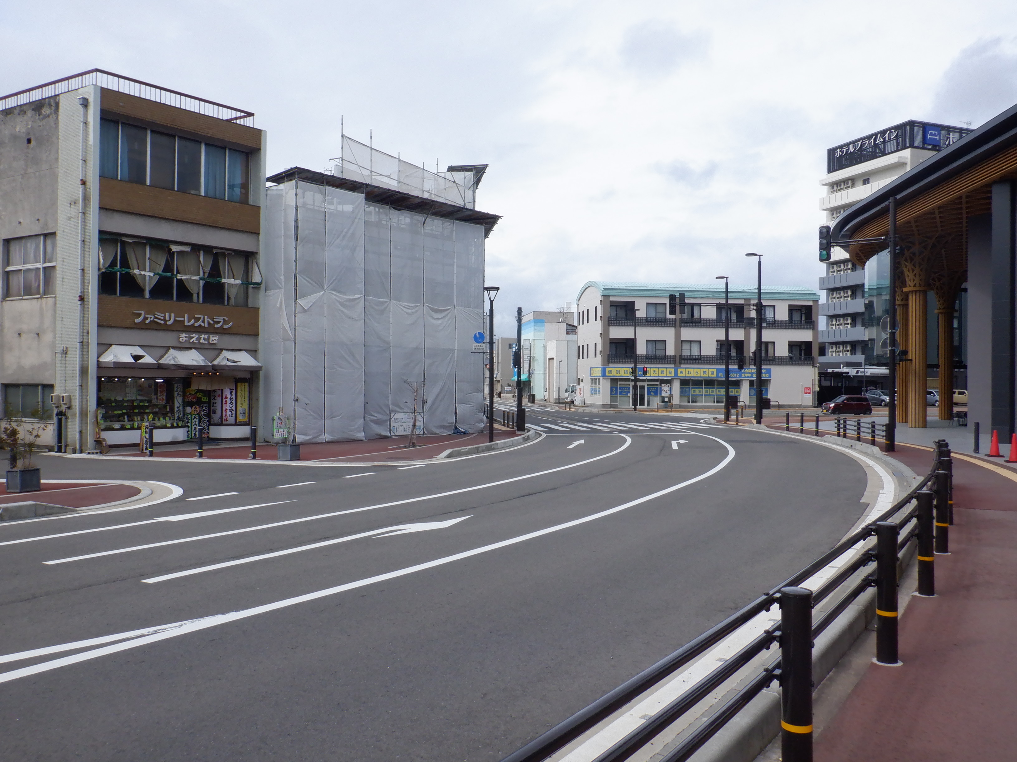 囲いがされていた駅前の飲食店だったところ。新幹線開業を前に閉店し、表を整備して誤解を与えない形になったようです。