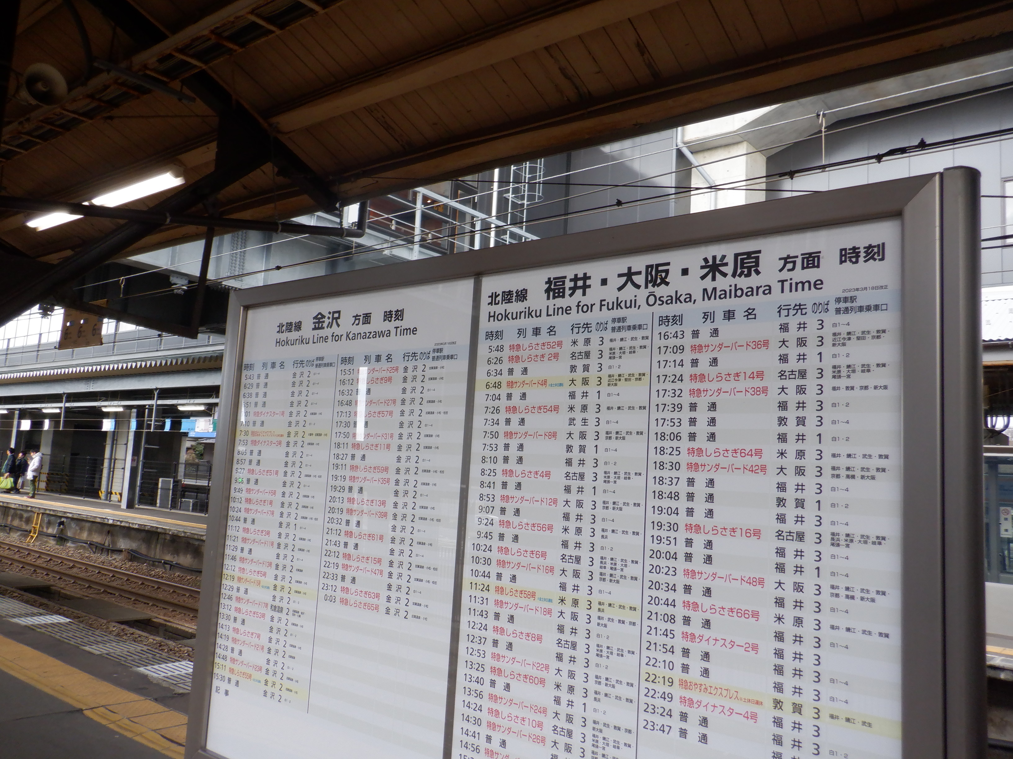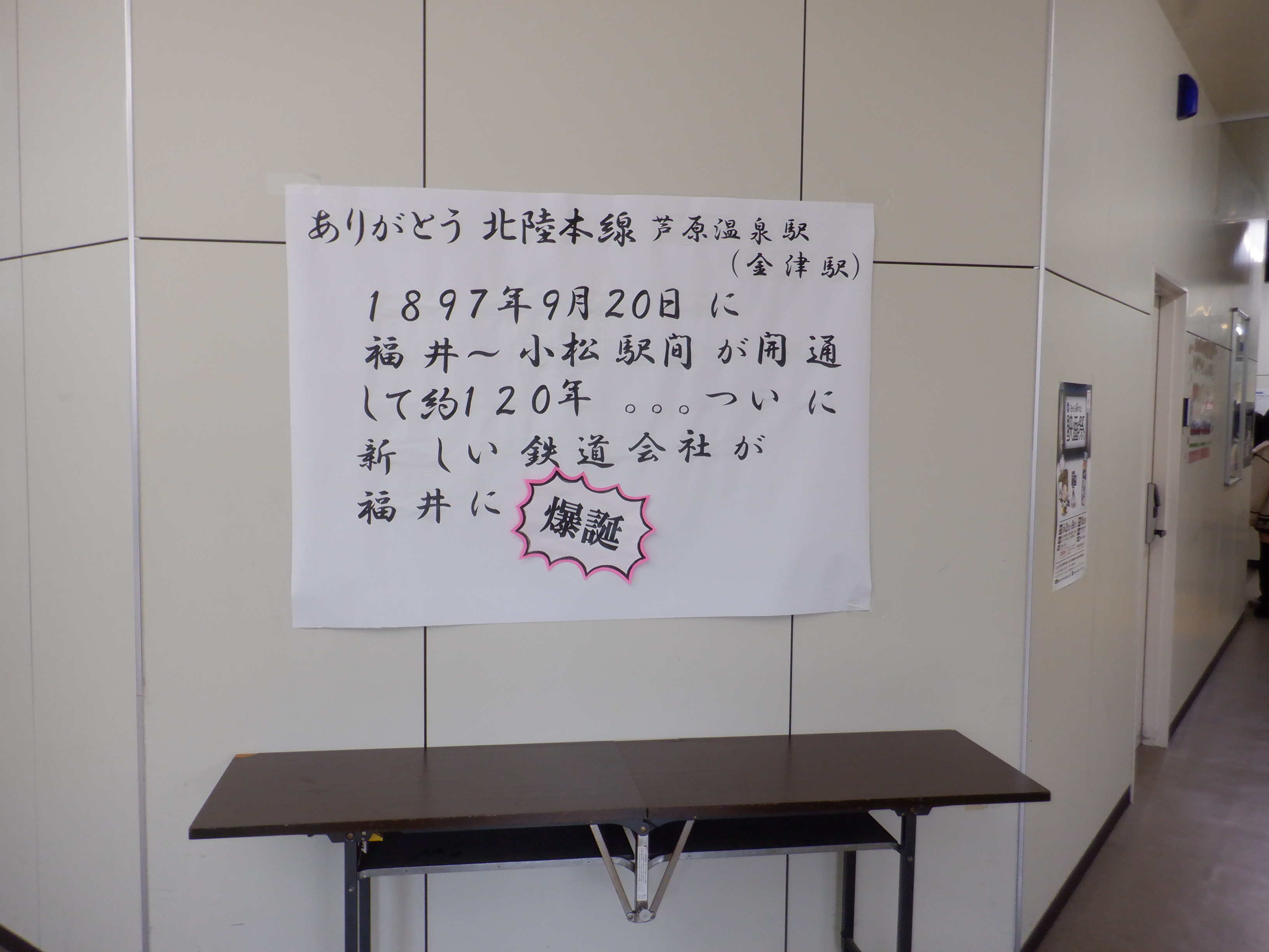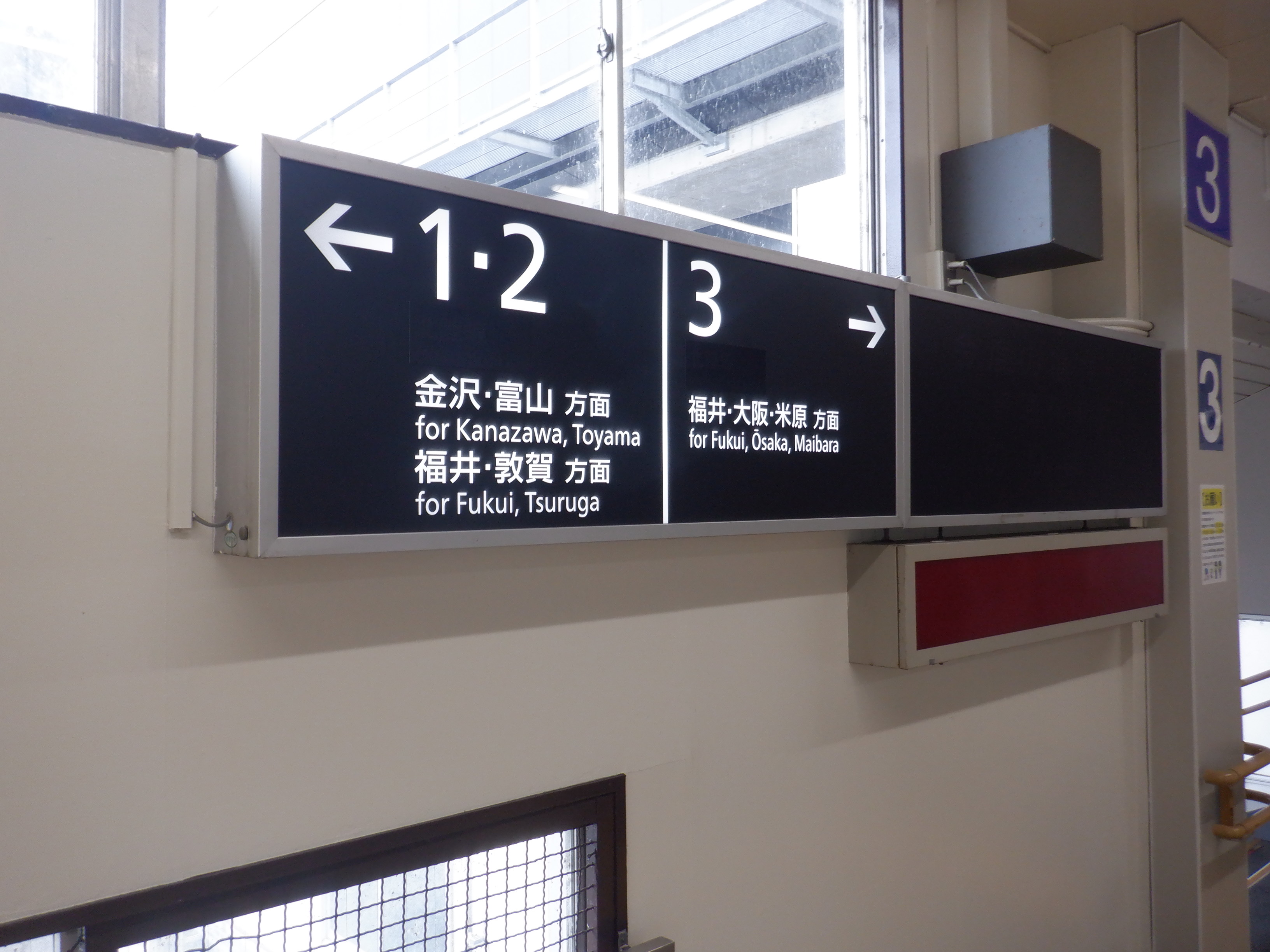 ホームや改札口の発車標の「北陸線」の表示が消されていましたが、これは前回以前もそうだったようです。その他、移管に向けた準備が進んでいます。