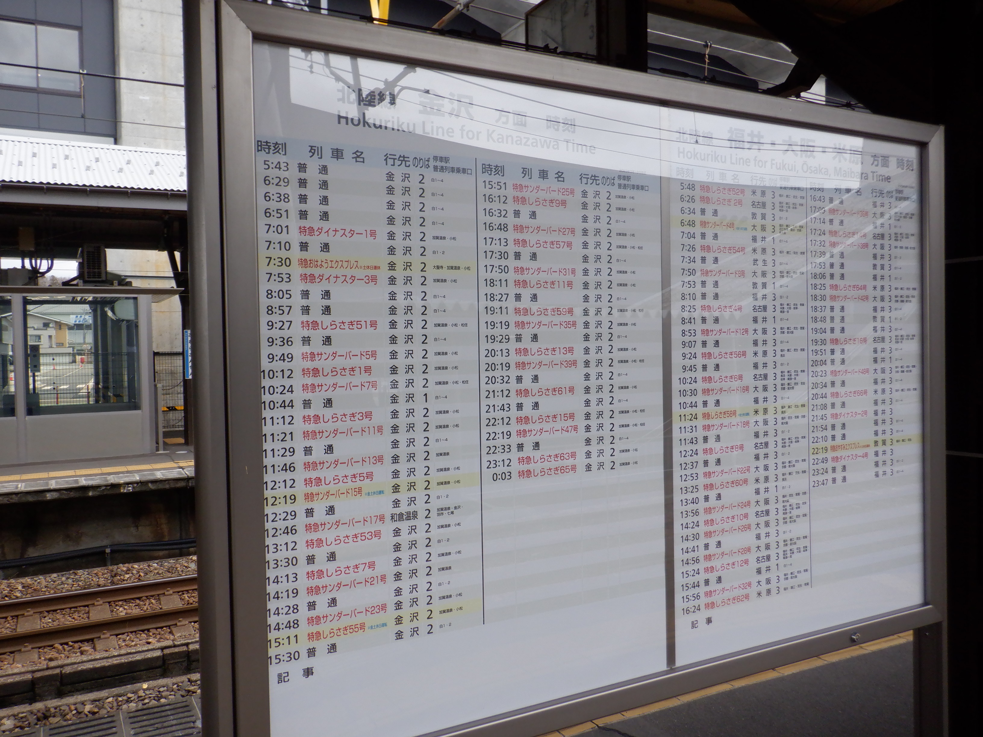 3番のりばの発車標。前回気づかなかったのですが、「北陸線」の表示が隠されています。なお、4番のりばの表示が隠されているのは4番のりばが撤去される時です。