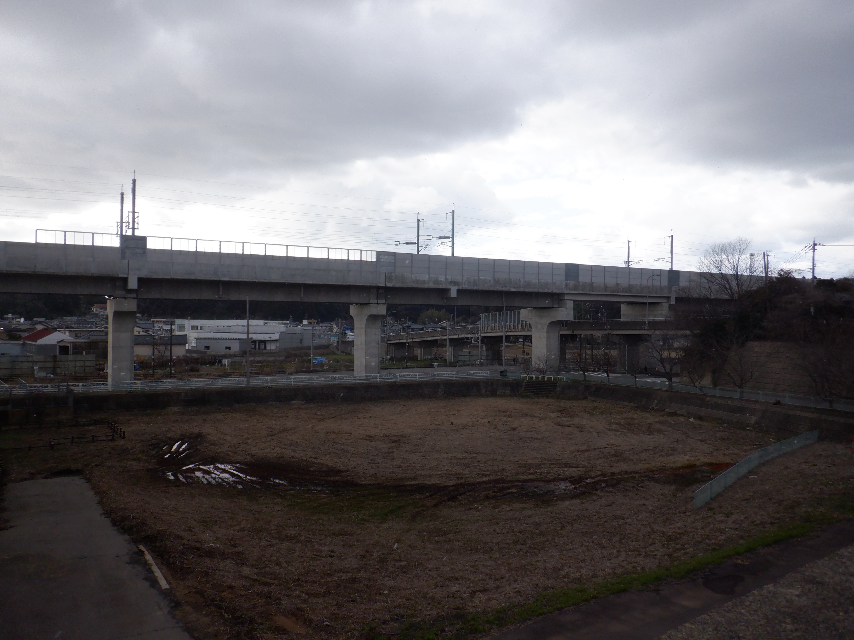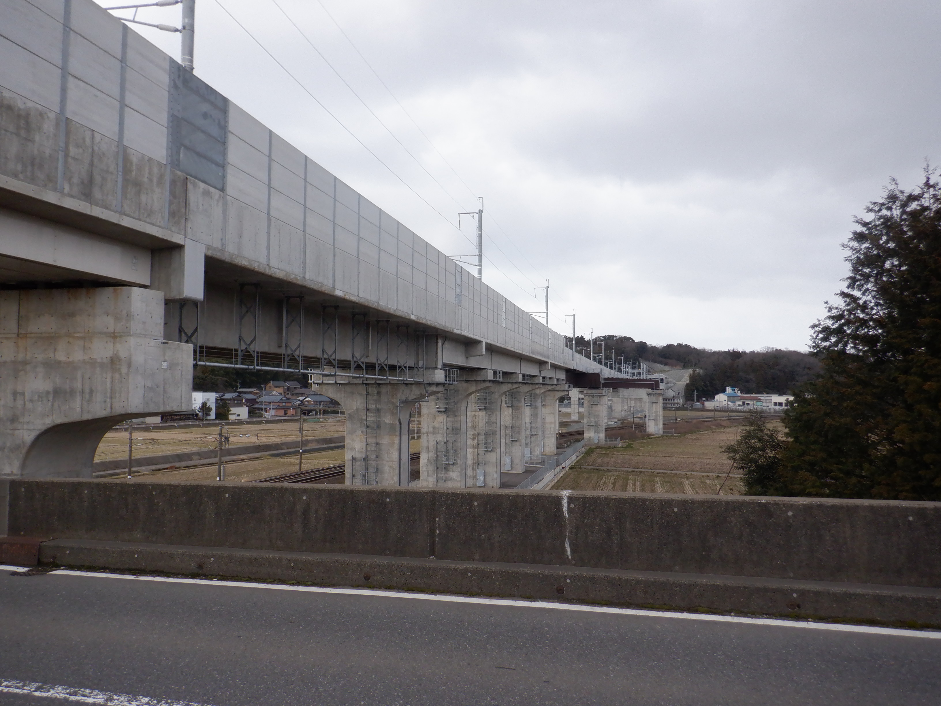 新しい道の出入口のスーパーの前。新幹線開業日の交通規制が予告されていました。