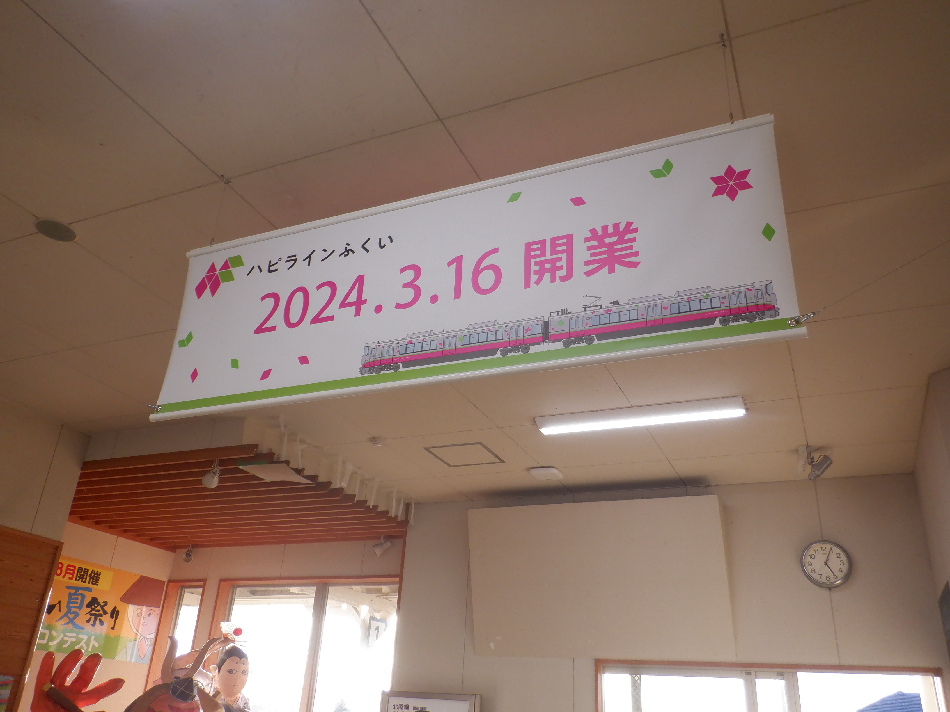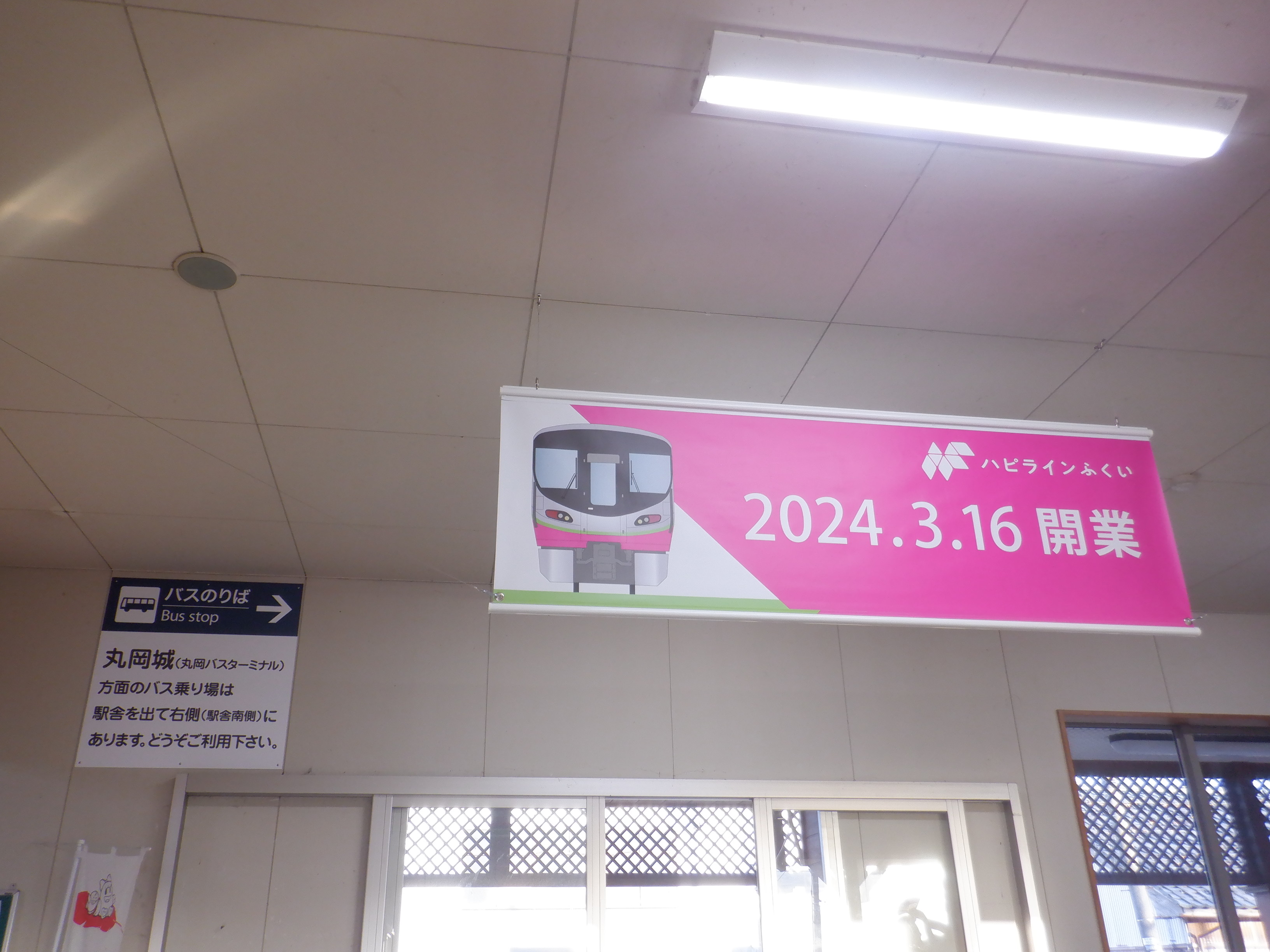 駅舎内の吊り下げられているハピラインふくいの案内。