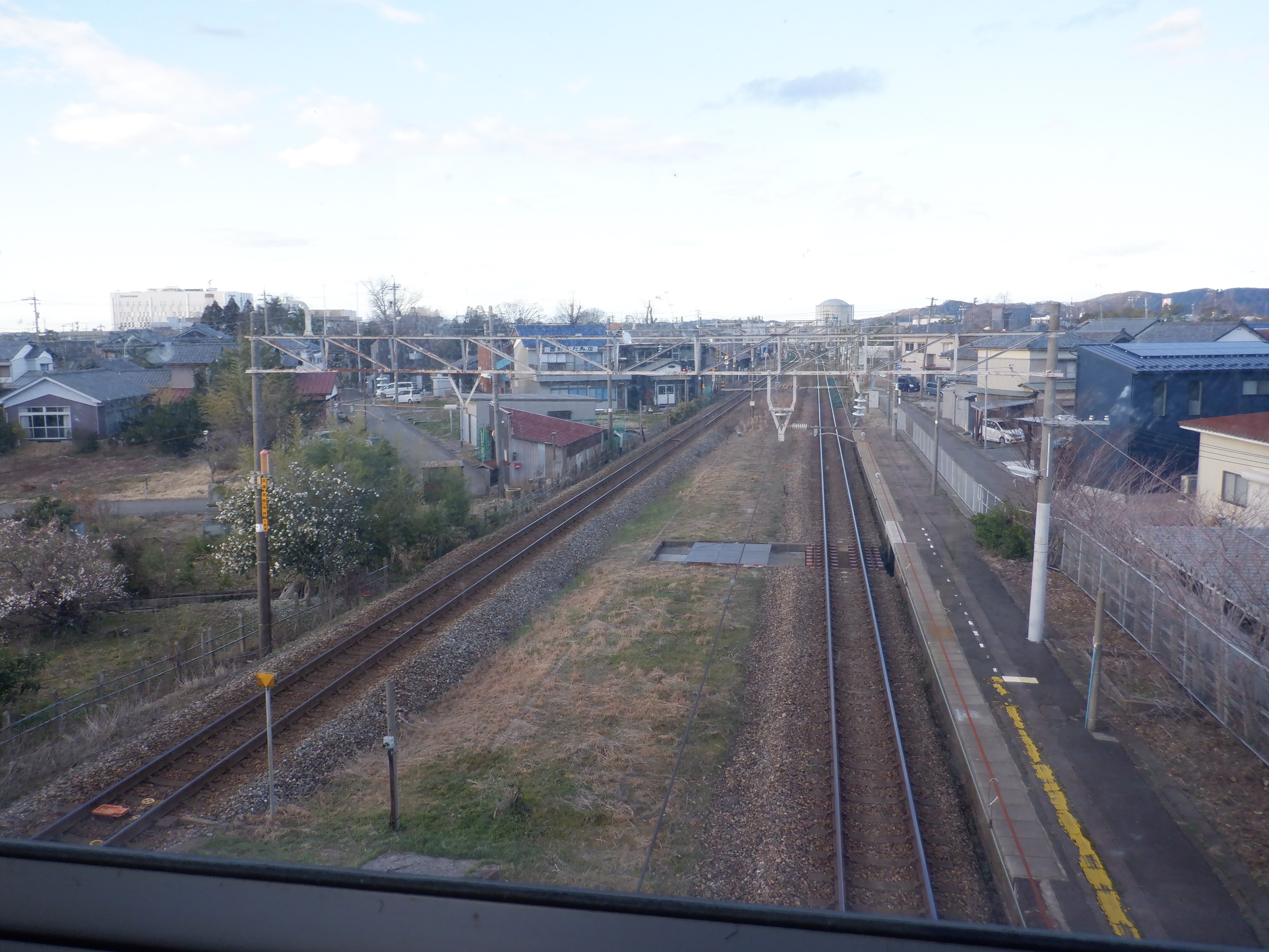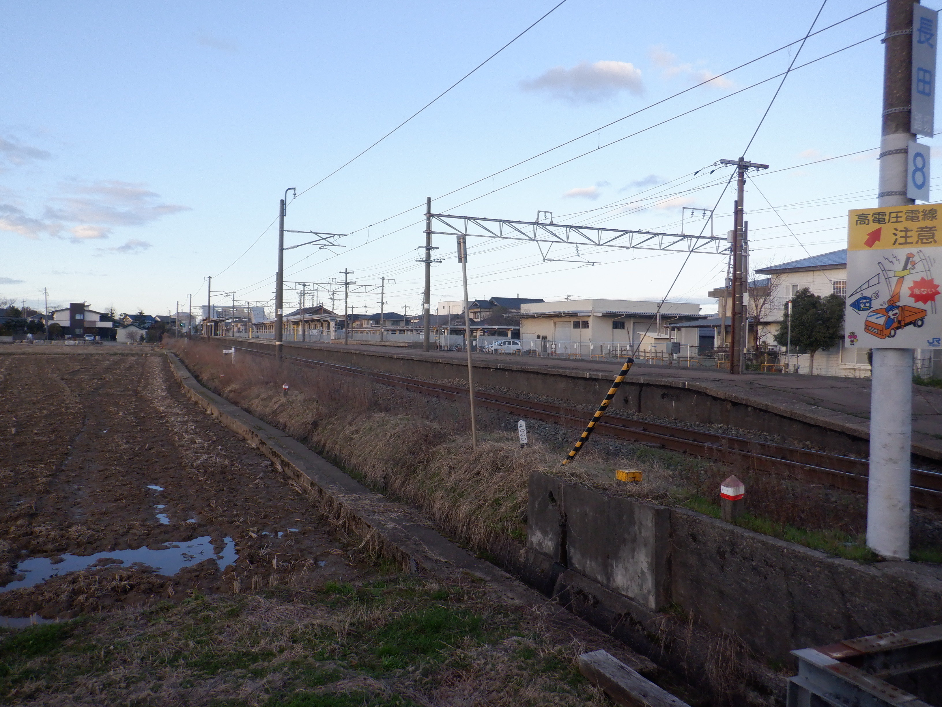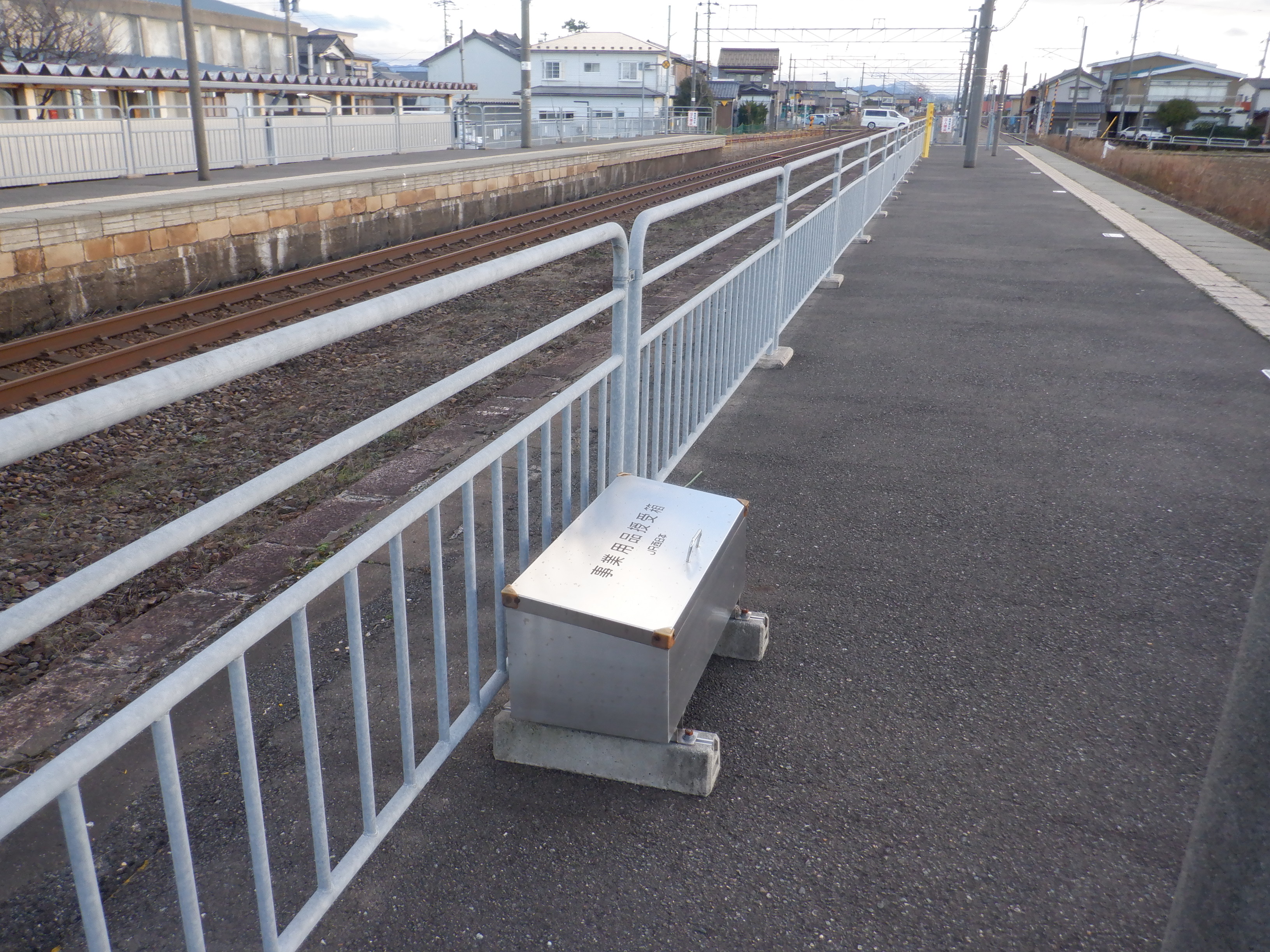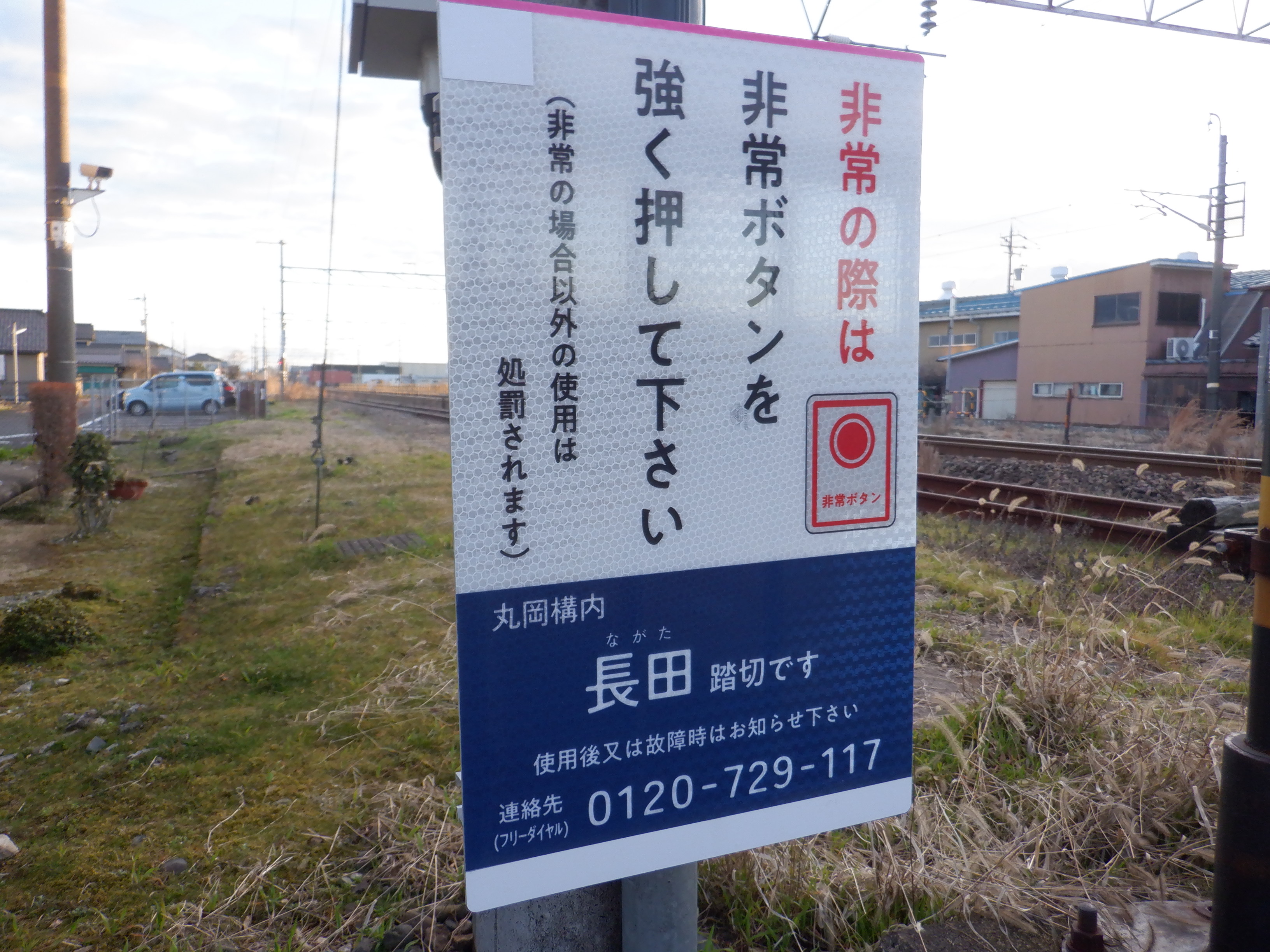 春江駅側の踏切付近。非常ボタンの案内がハピラインふくいのものになっていました。