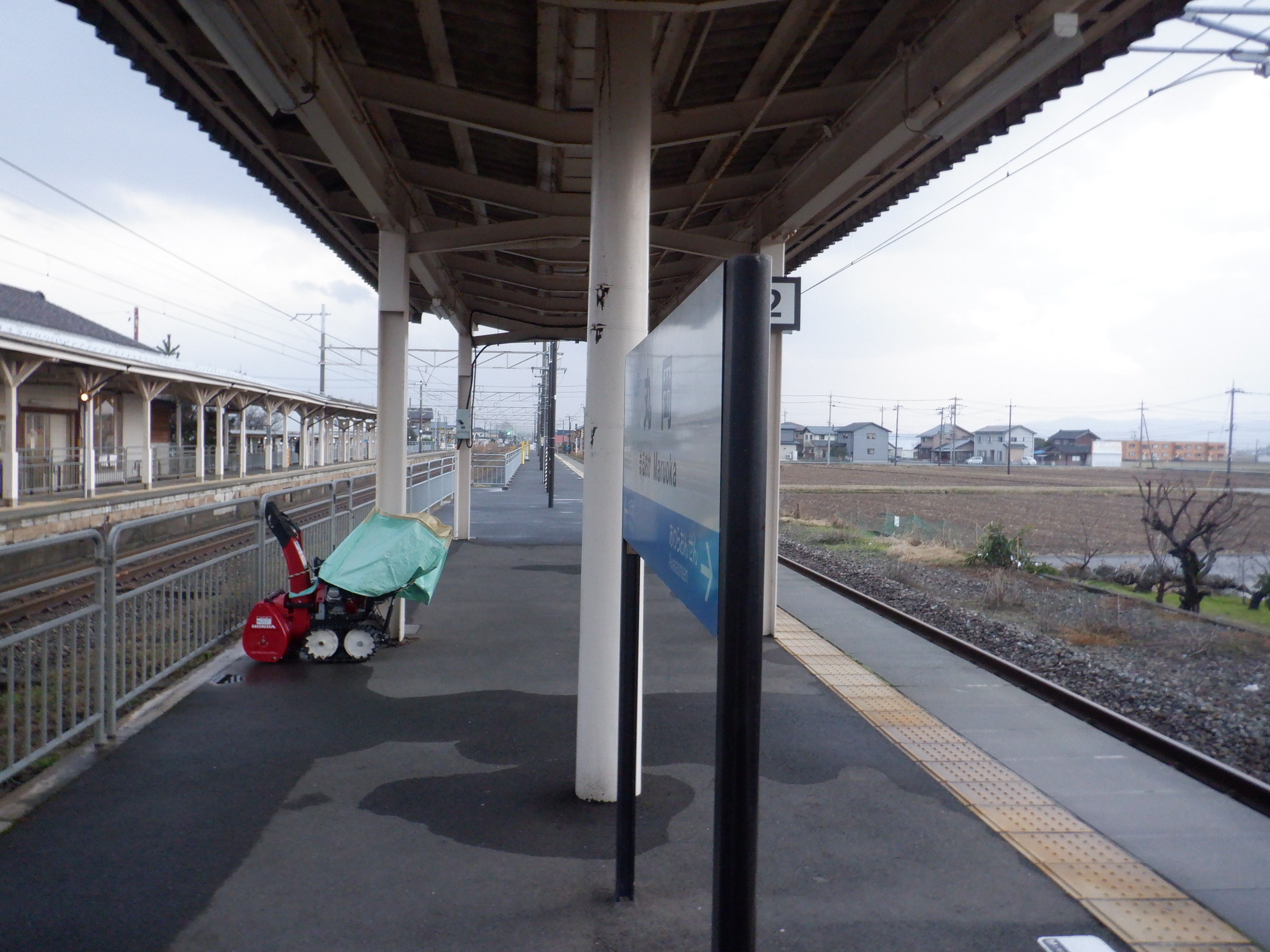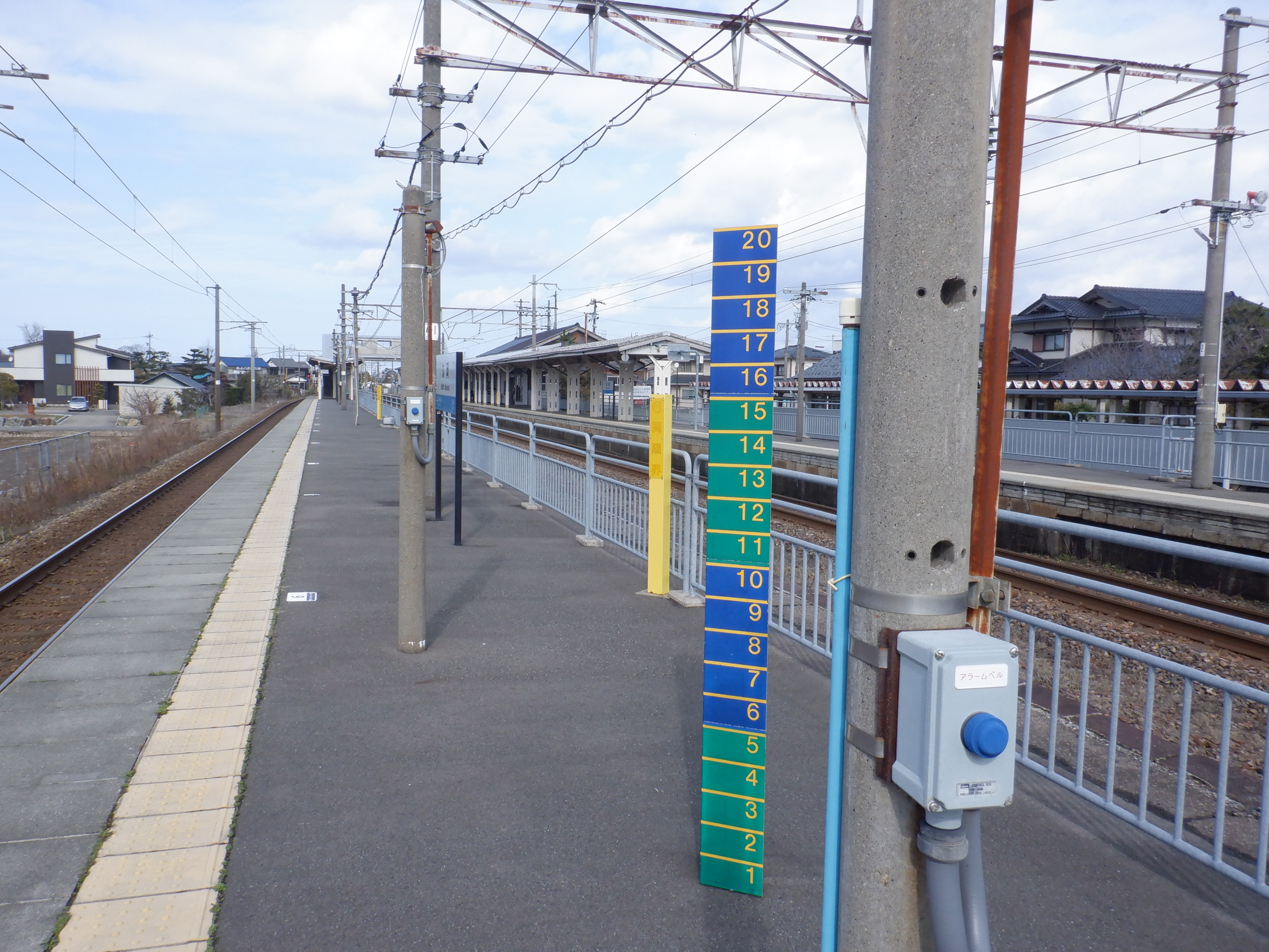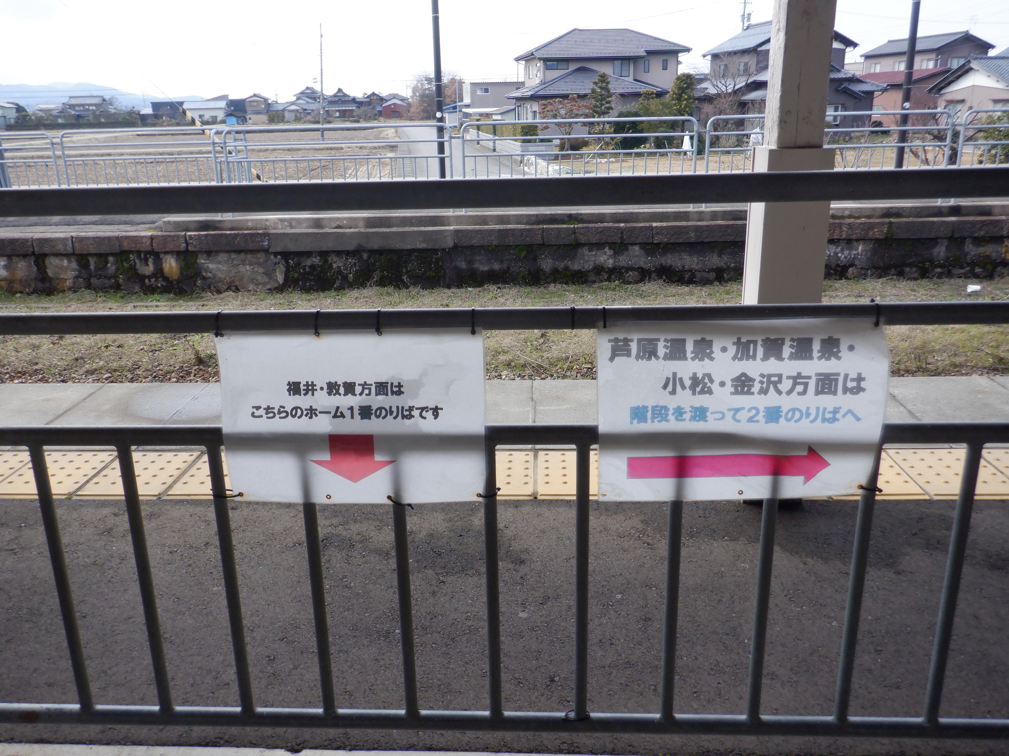 3月になりました。各駅名標ともハピラインふくいの駅名標か白い板の上にシールでJRの駅名標が貼られています。第一種駅名標のJRロゴはこの時点でも残っていました。
