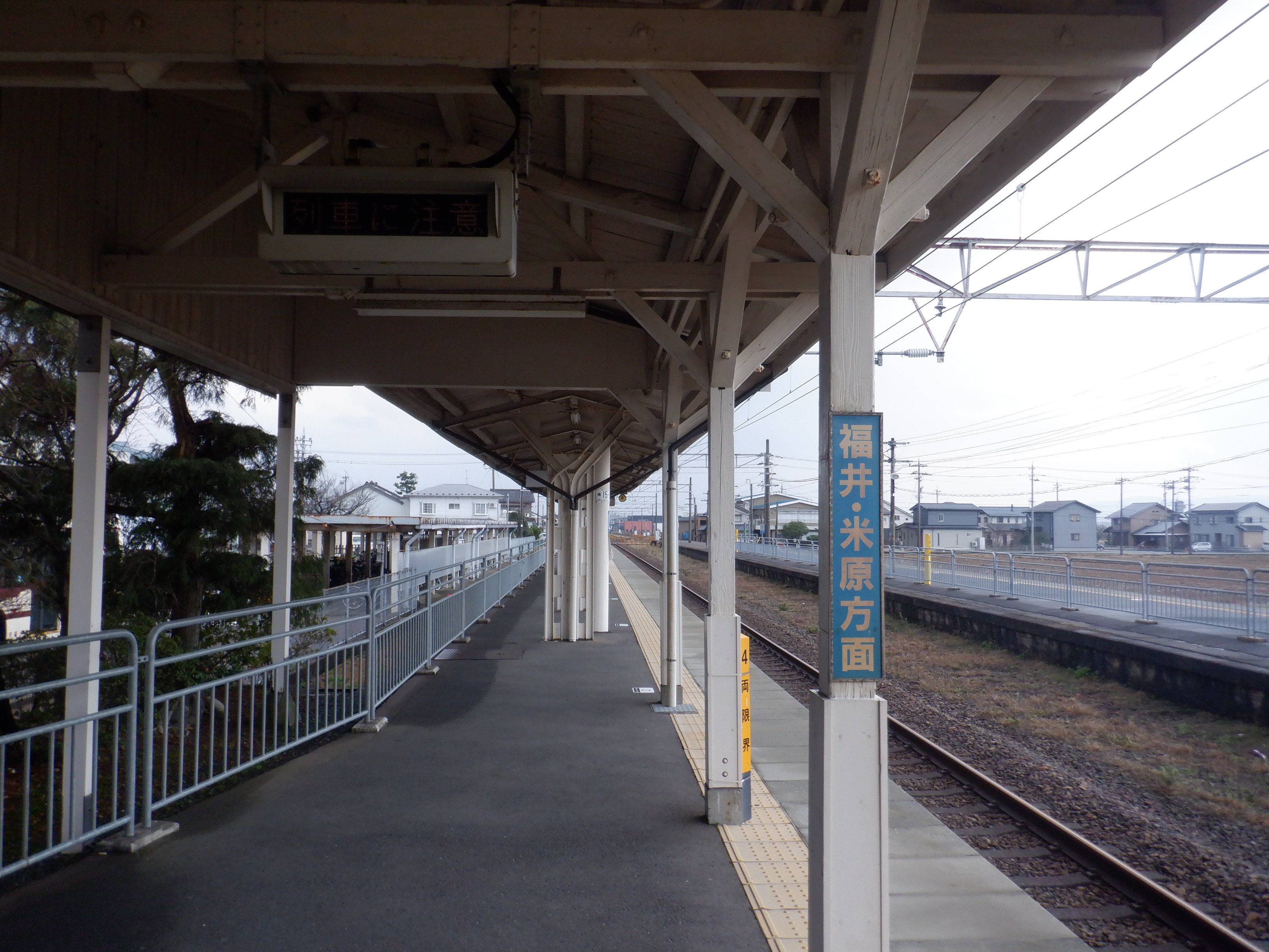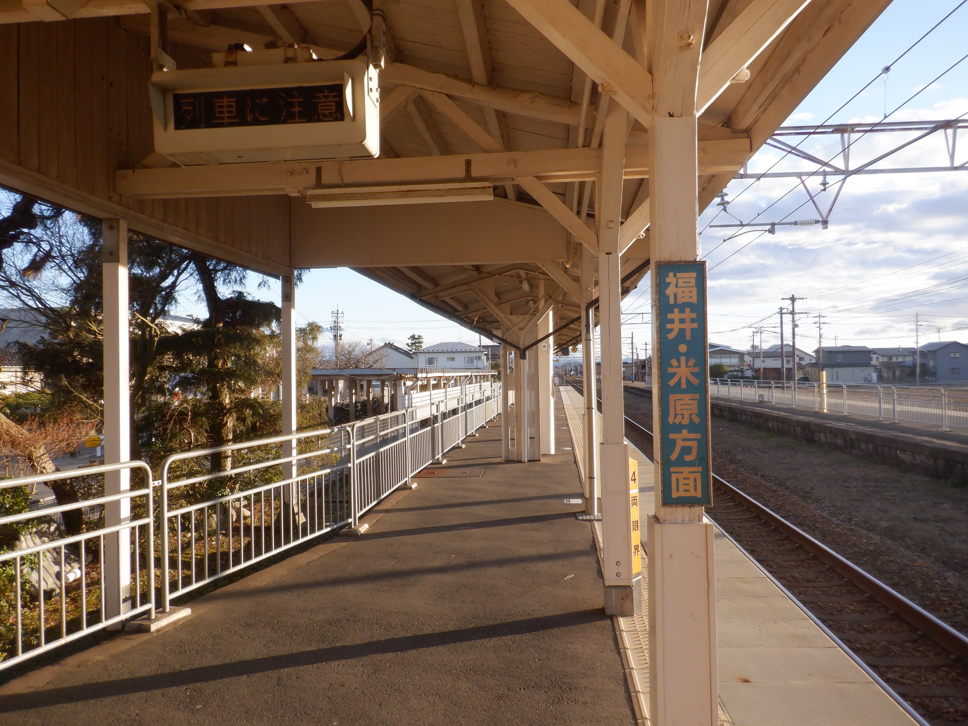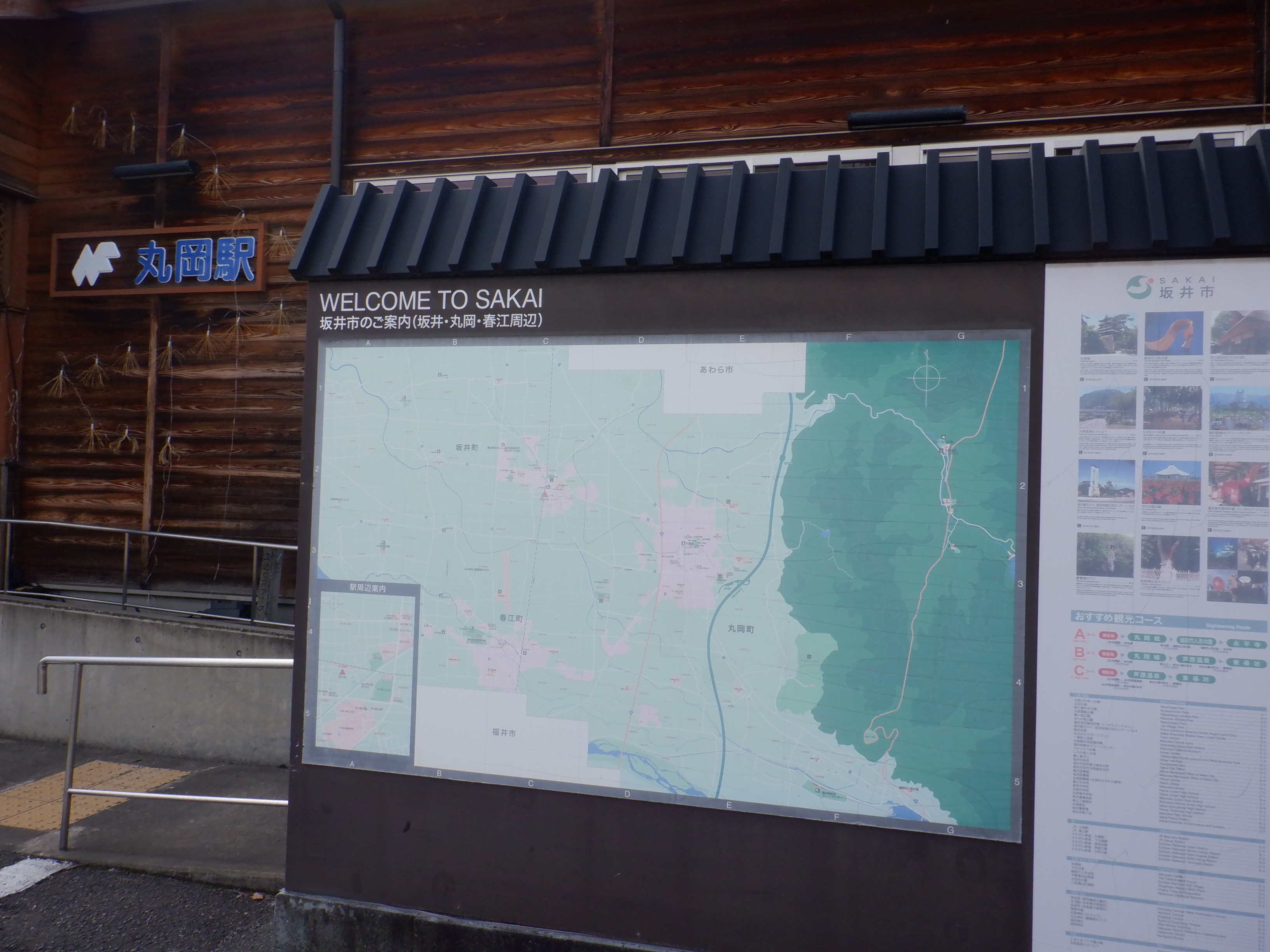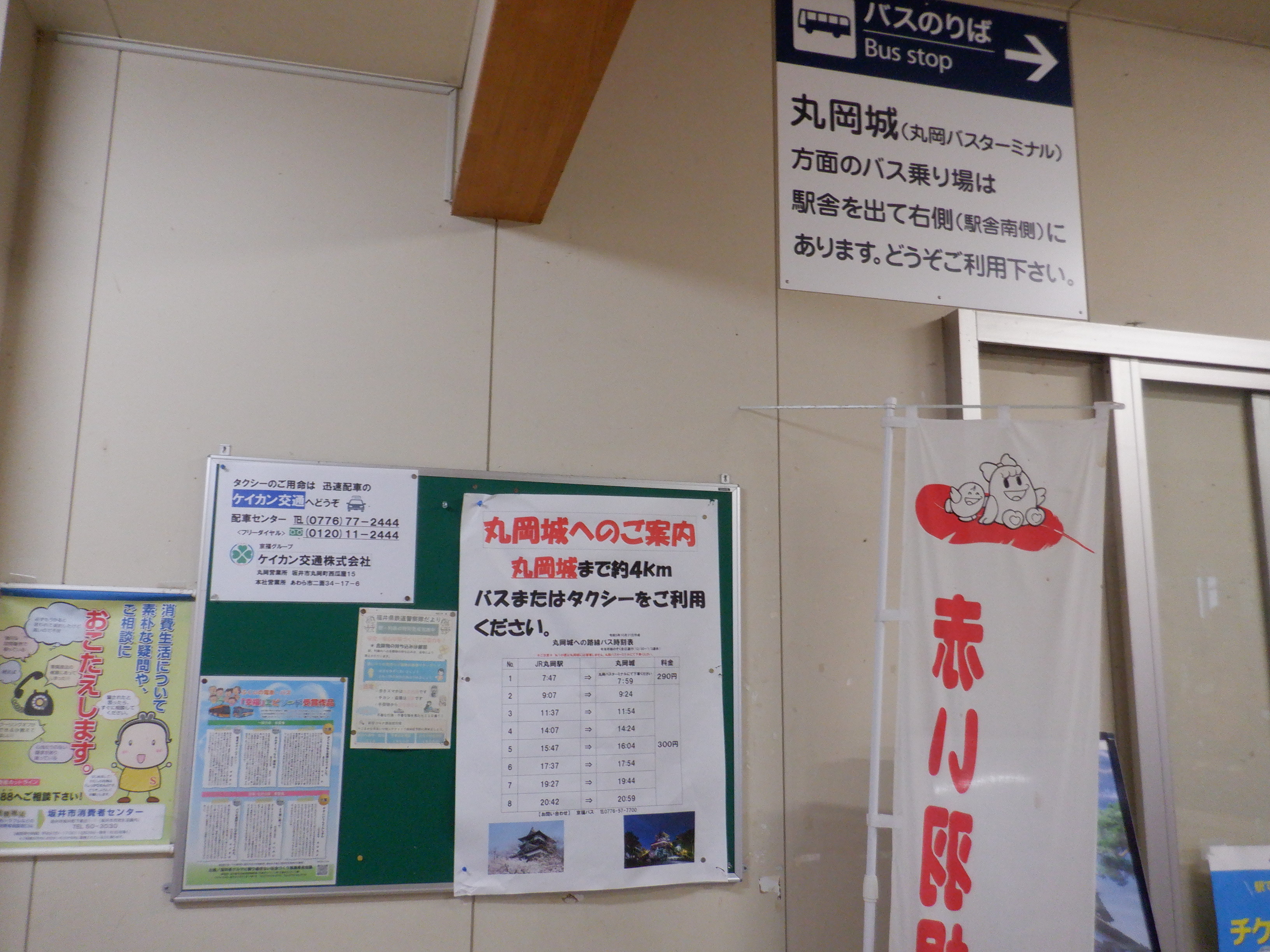 旧丸岡町ではなく旧坂井町にあるため丸岡城はかなり離れていることで有名な駅ですが、丸岡城への案内が貼られていました。