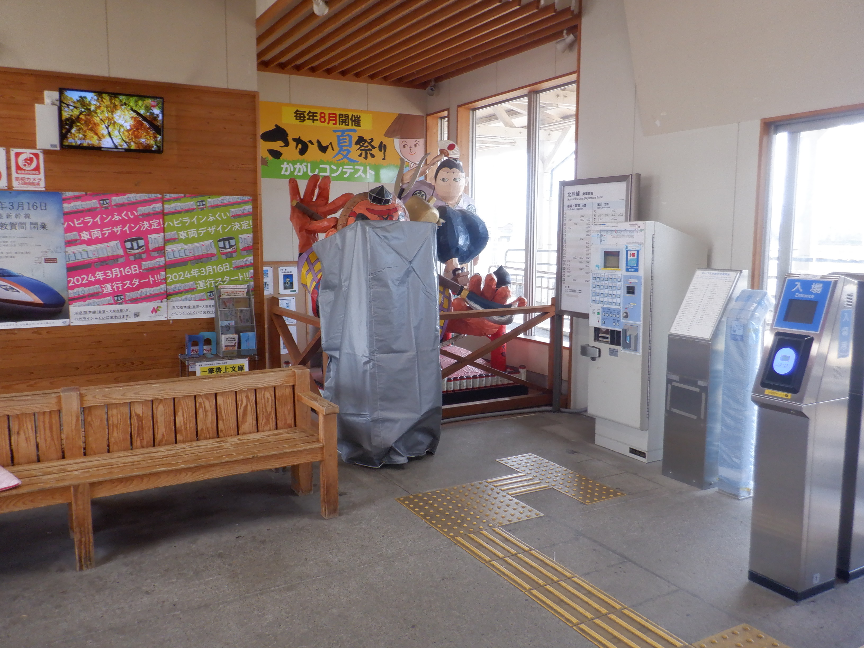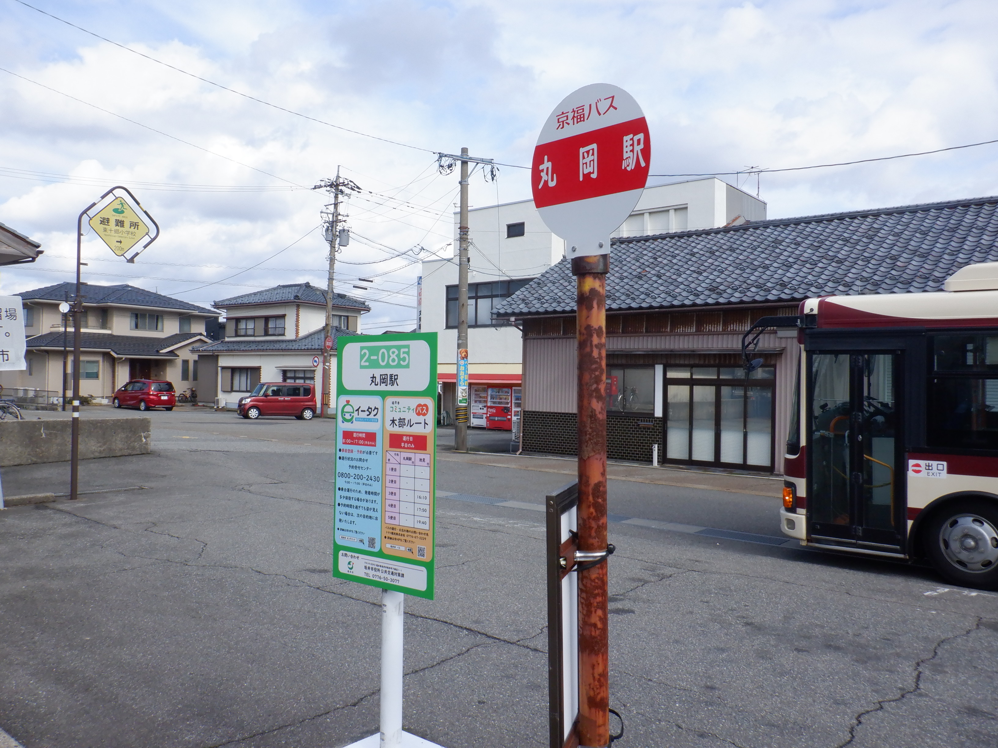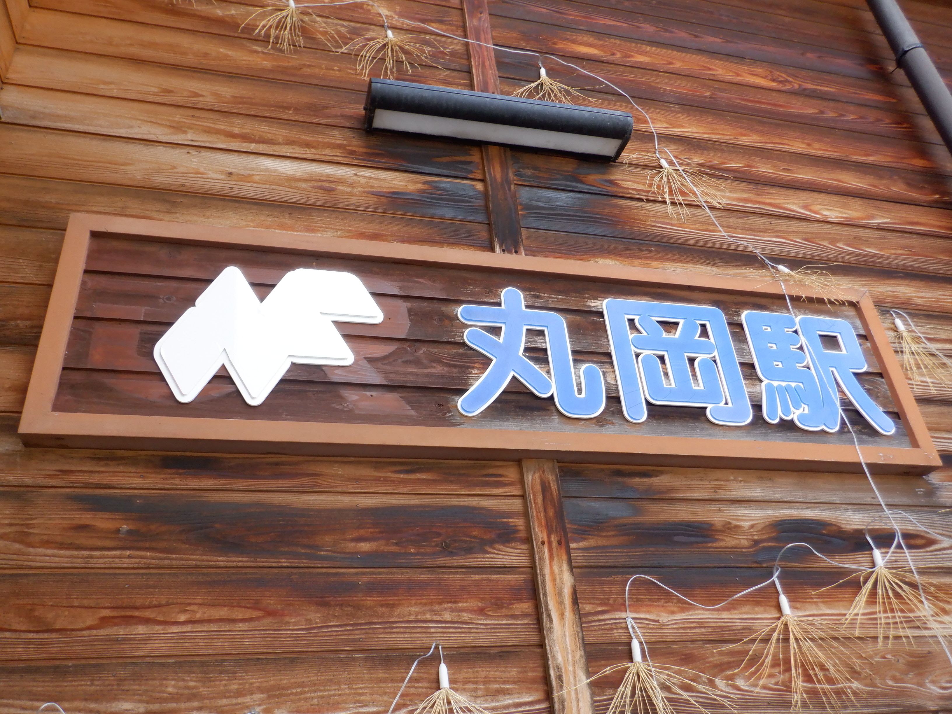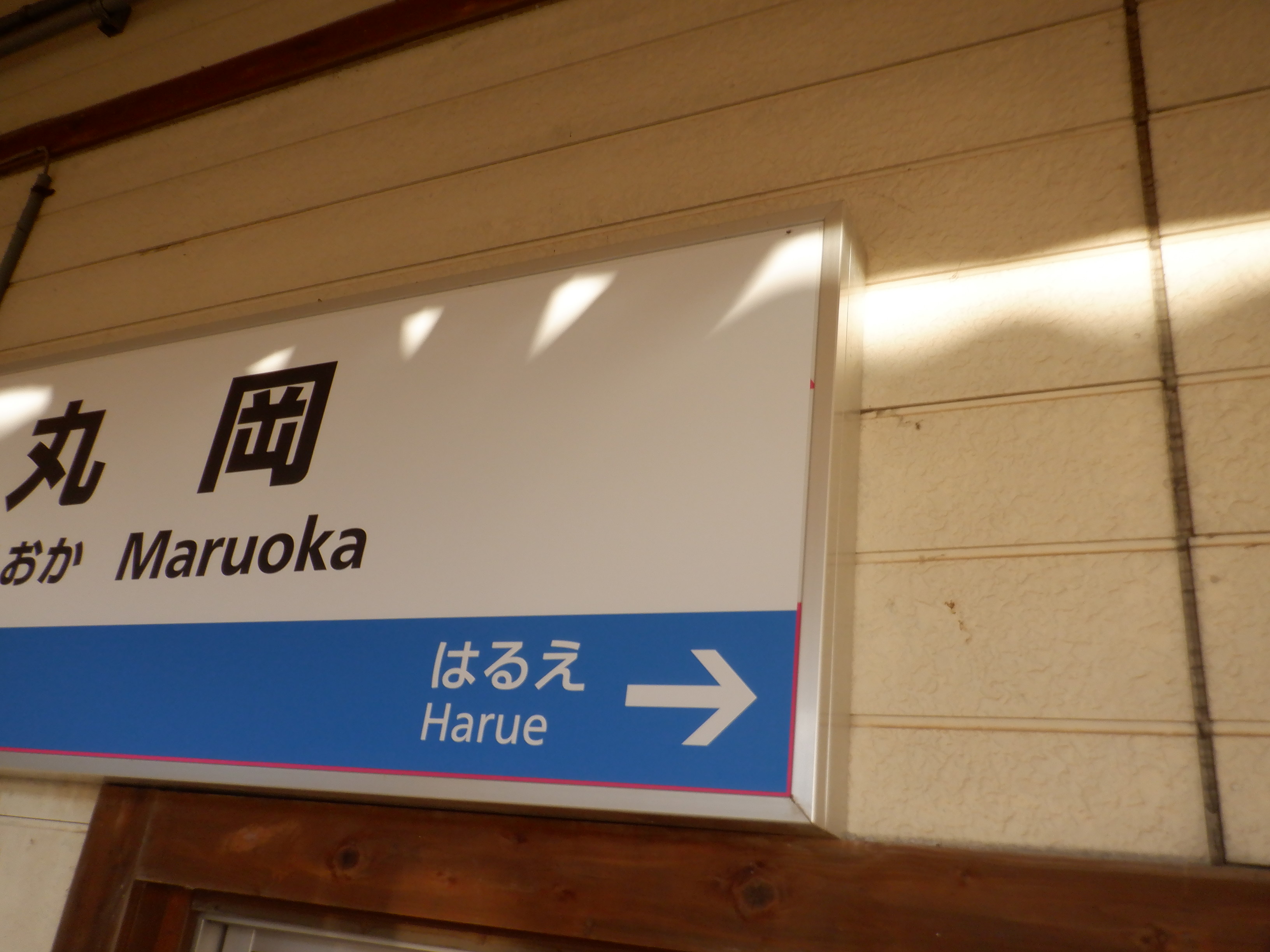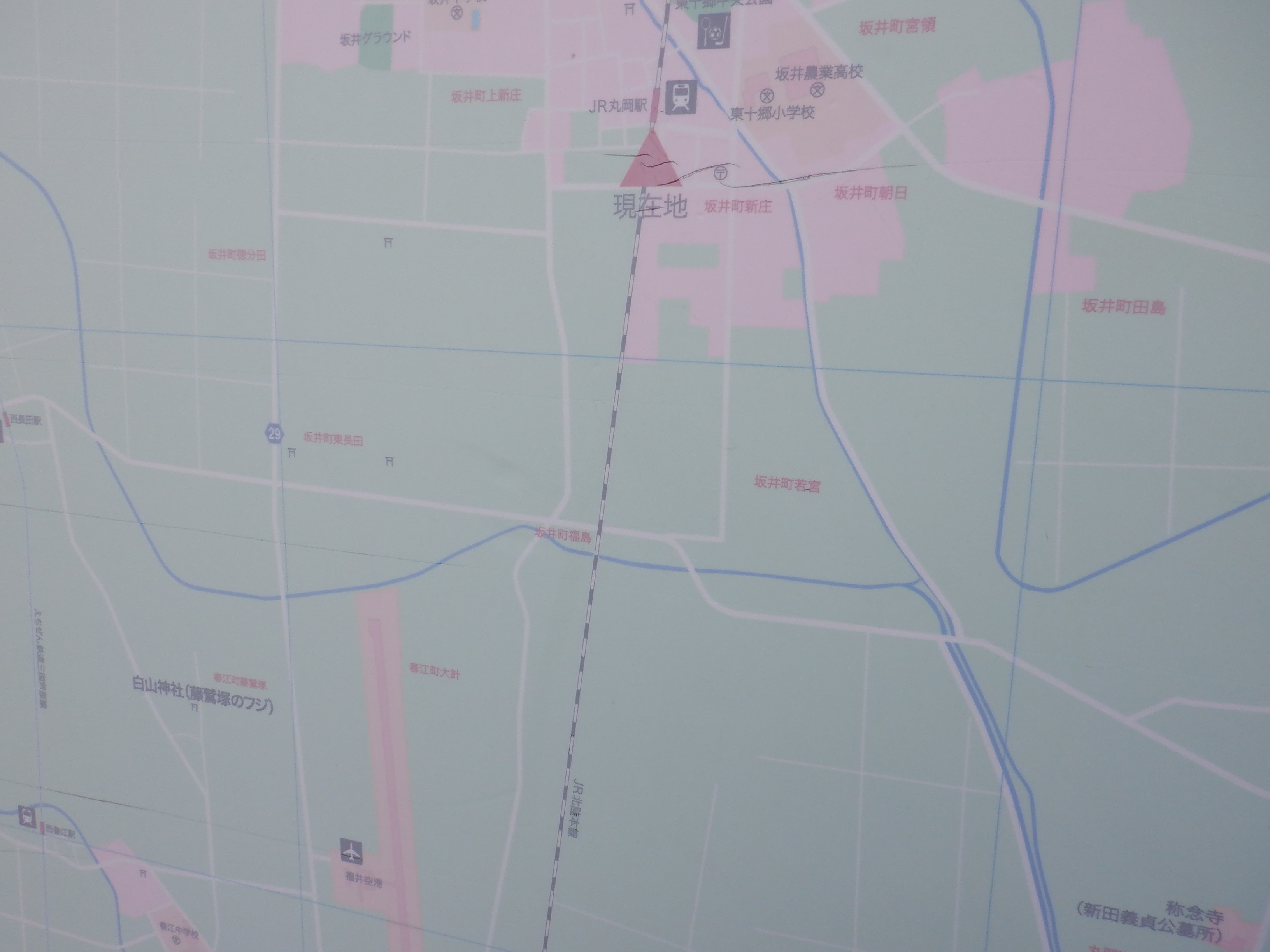 旧丸岡町ではなく旧坂井町にあるため丸岡城はかなり離れていることで有名な駅ですが、丸岡城への案内が貼られていました。
