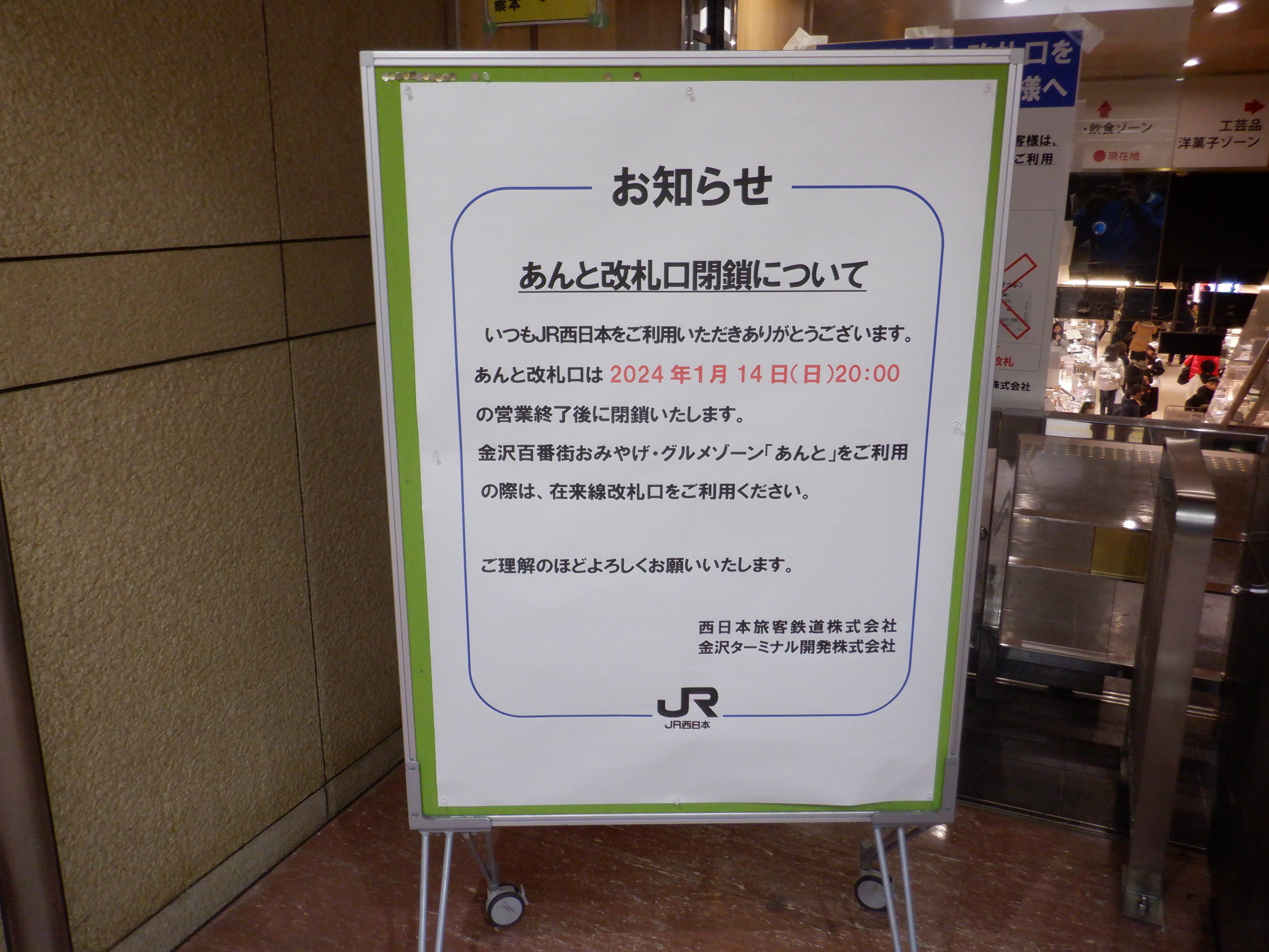 改札内から見たあんと改札口と閉鎖のお知らせ。