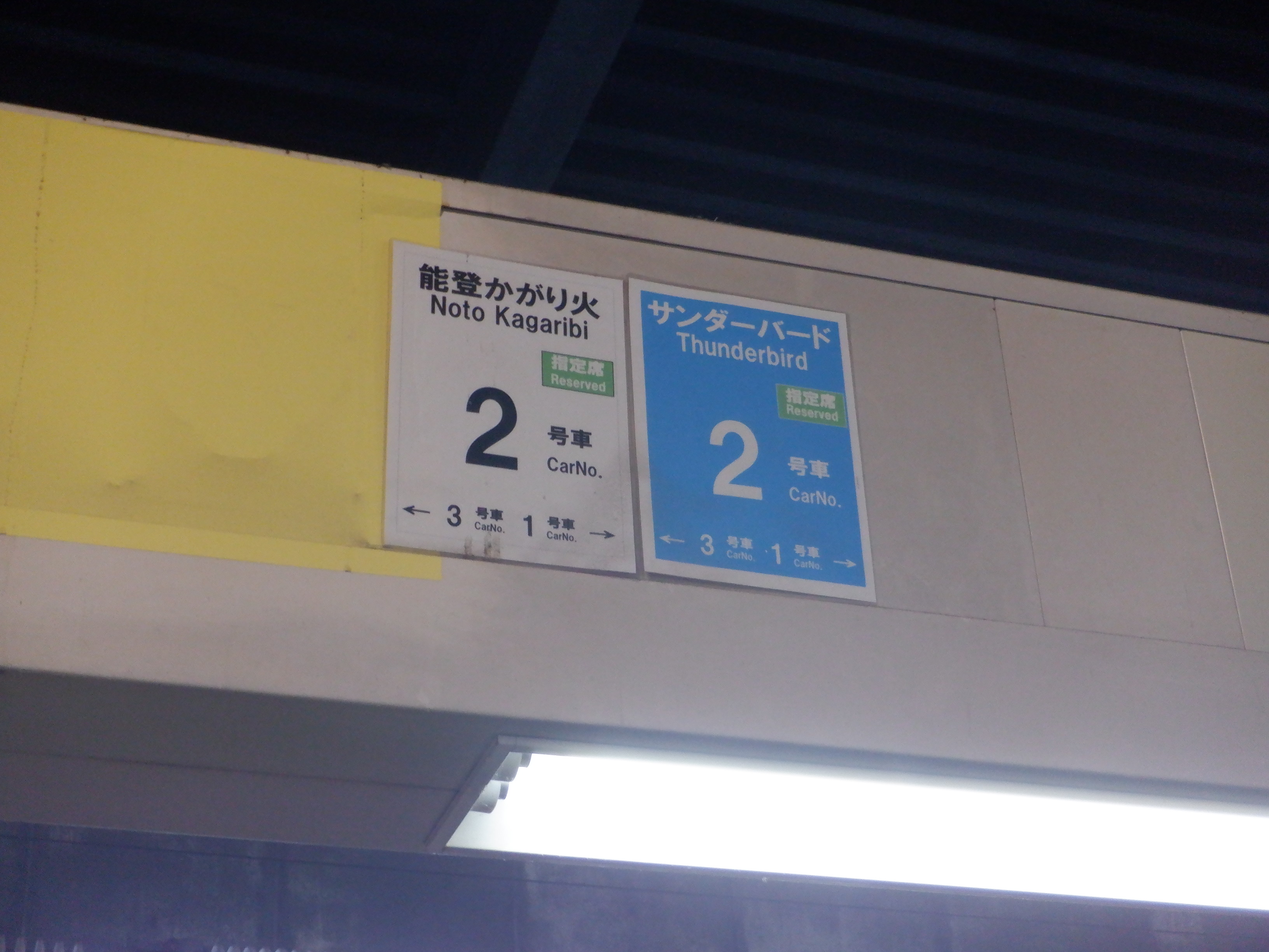 7番のりばへのサンダーバード17号和倉温泉行きの案内。この時点で七尾行きだったため、自由席の案内は復活し、大きく「和倉温泉行き」と描かれたものは裏返しのままになっています。