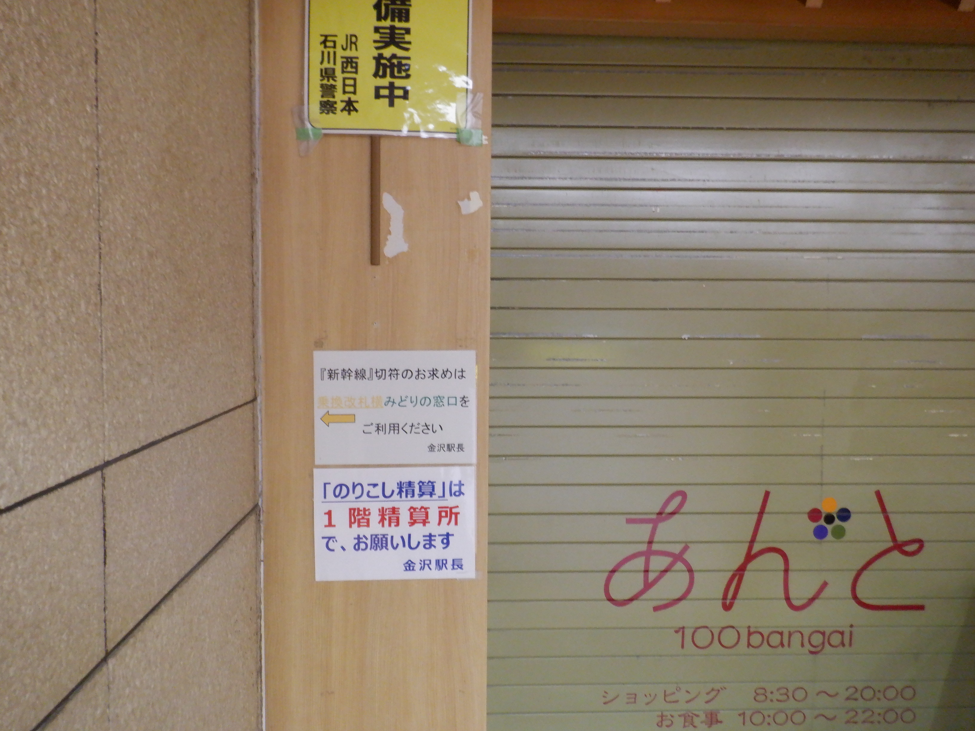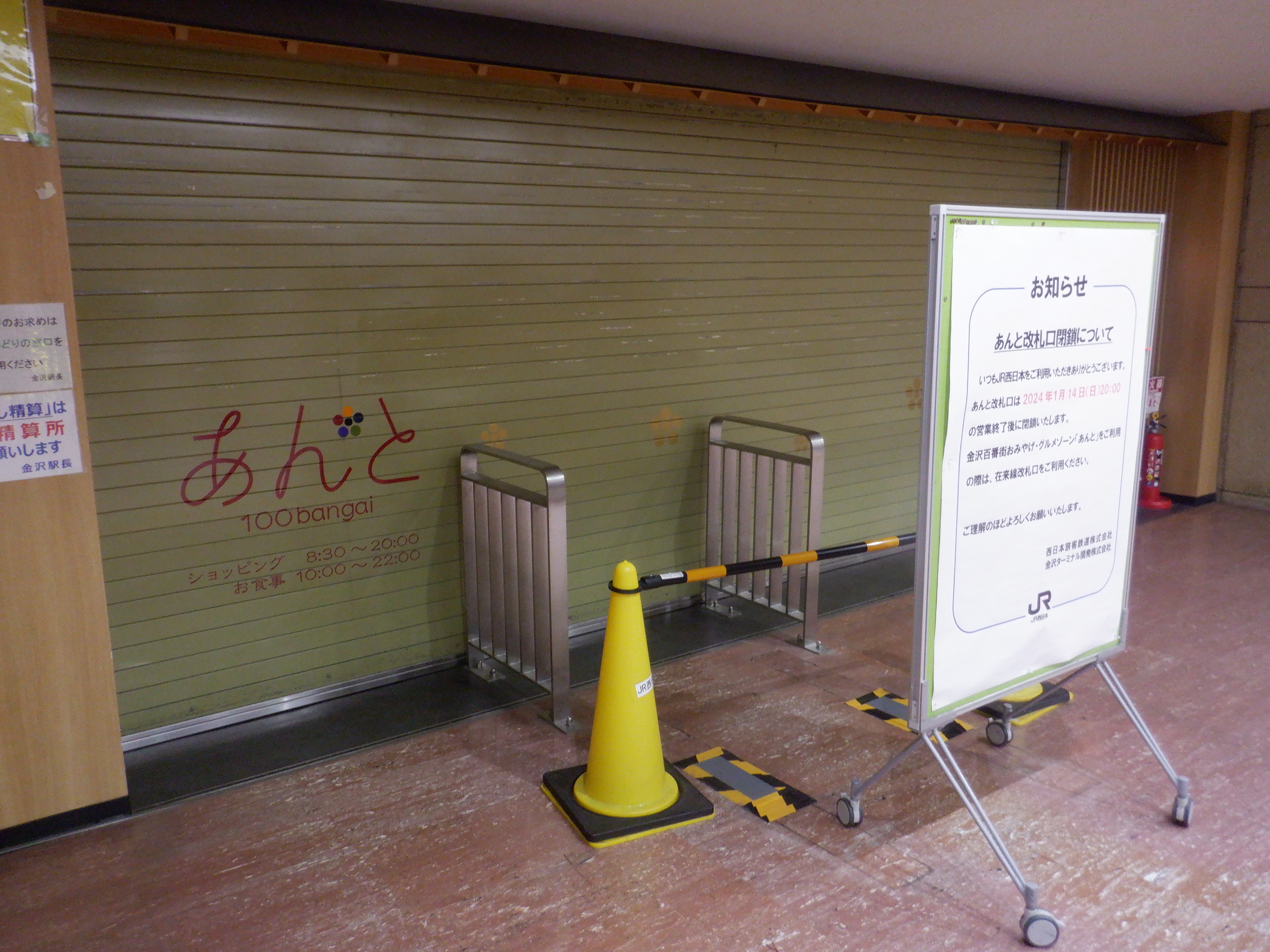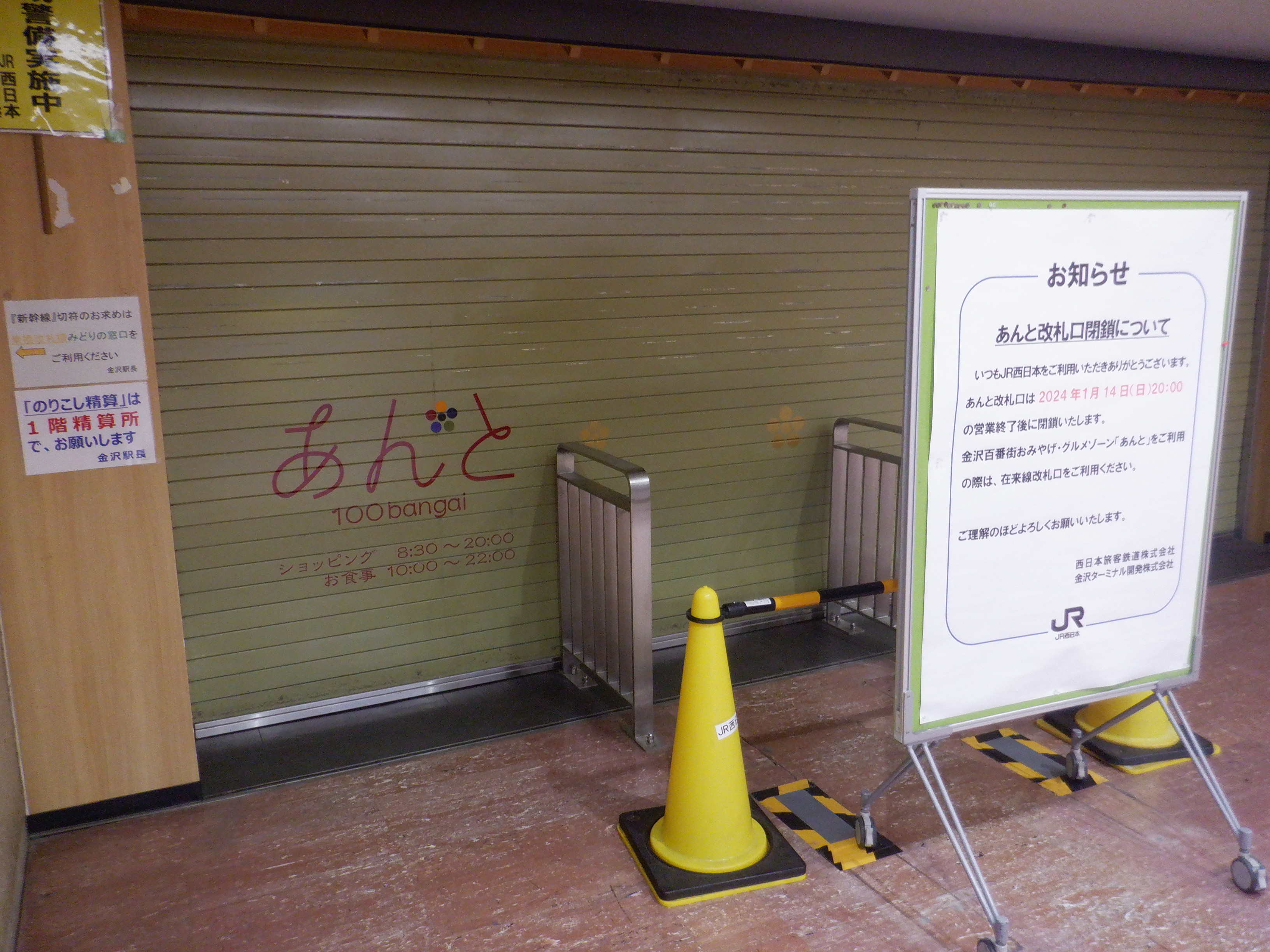 金沢駅の2024年移管前の様子です。この期間はあんと改札口が閉鎖されて、両側とも隠されてしまう流れが主になりました。また、移管が近くなると駅名標等も変化していきます。能登半島地震からの復旧の様子もこの駅から伺い知ることができました。