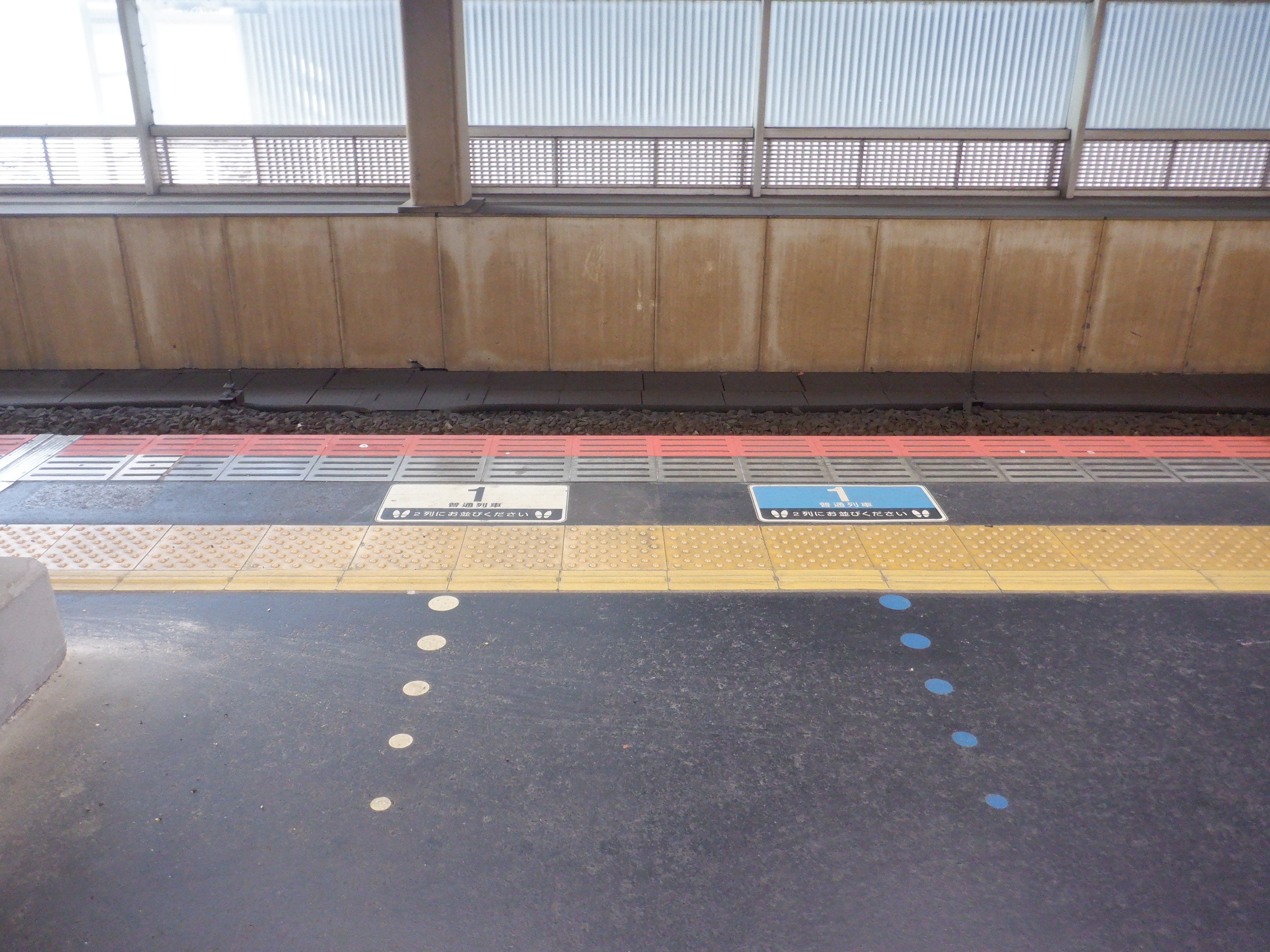 明るいところで分かりやすくご紹介するために、4番のりばの駅名標。両社のロゴ、そして隣駅表示のところにはJRの色で貼られた状態になっています。