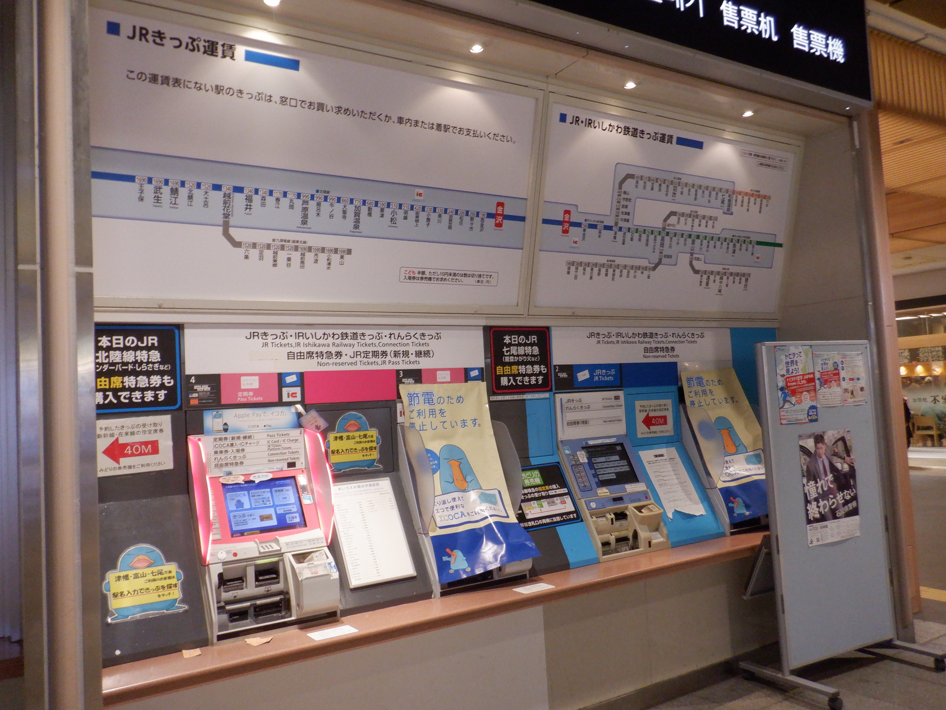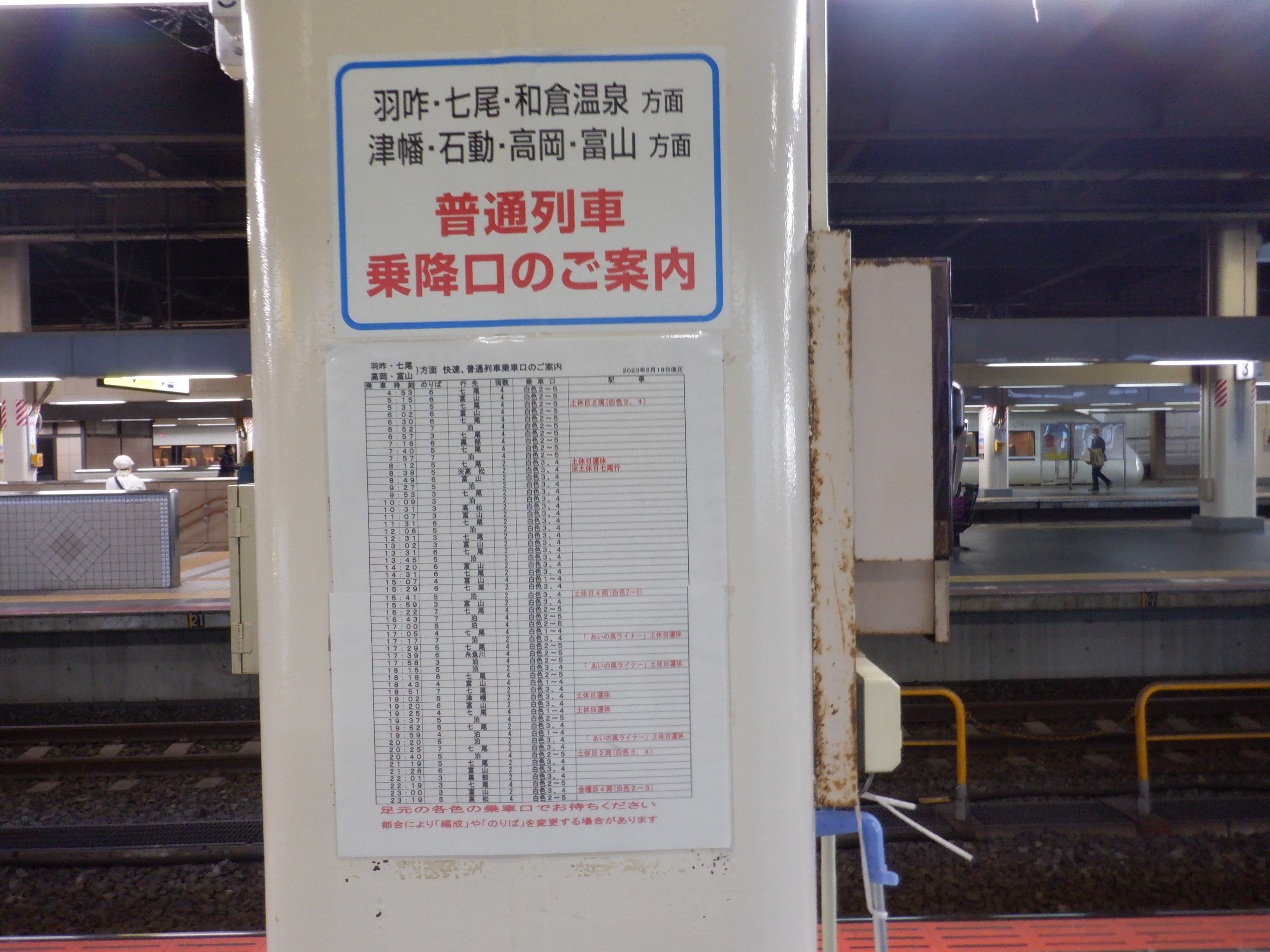 あんと改札だったところはカラーコーンが撤去され、IRいしかわ鉄道県内全線開業ポスターが貼られていました。また、発車標のタイトルのところも何か貼られているようです。