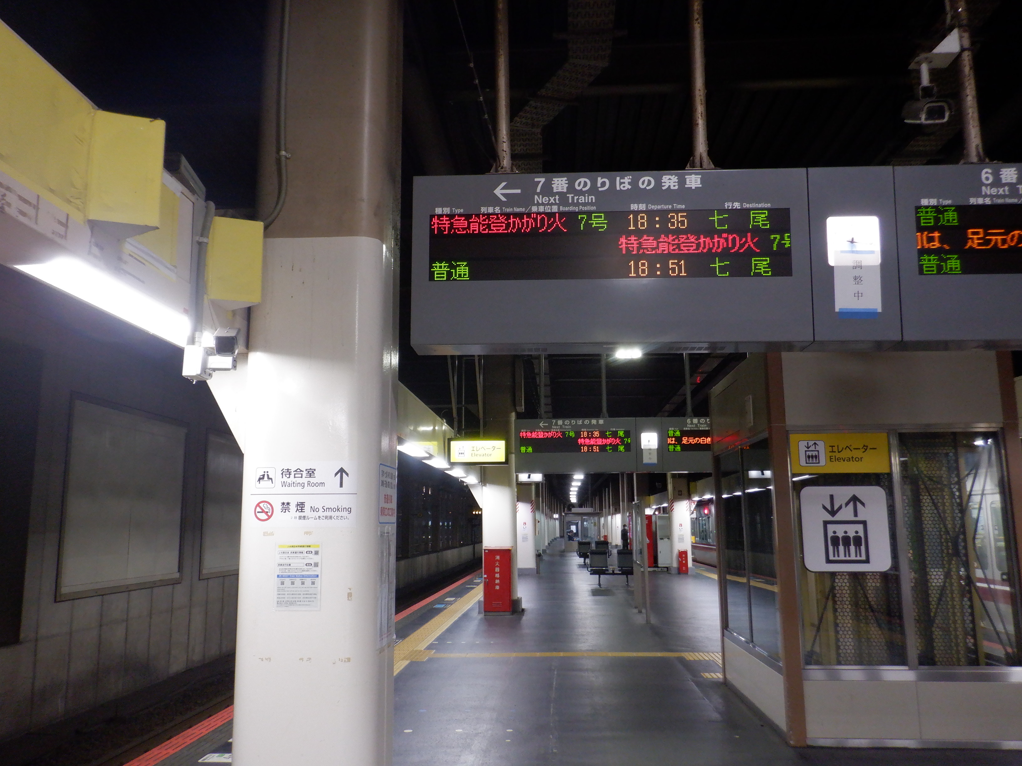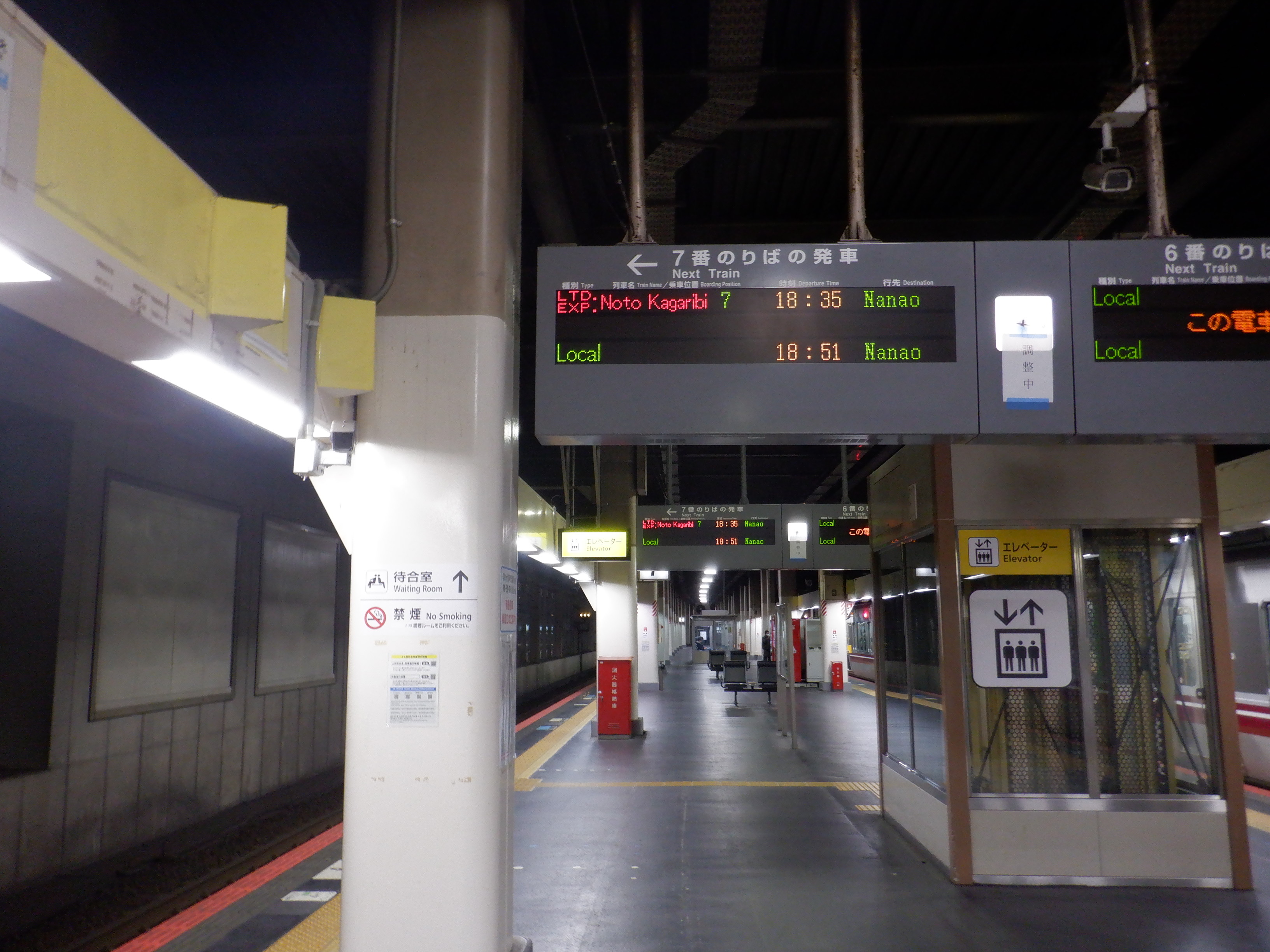 和倉温泉までを含む能登中島駅までの復旧により、7番のりばの案内がもとに戻りました。また、改札内のあんと改札だったところは板で塞がれました。