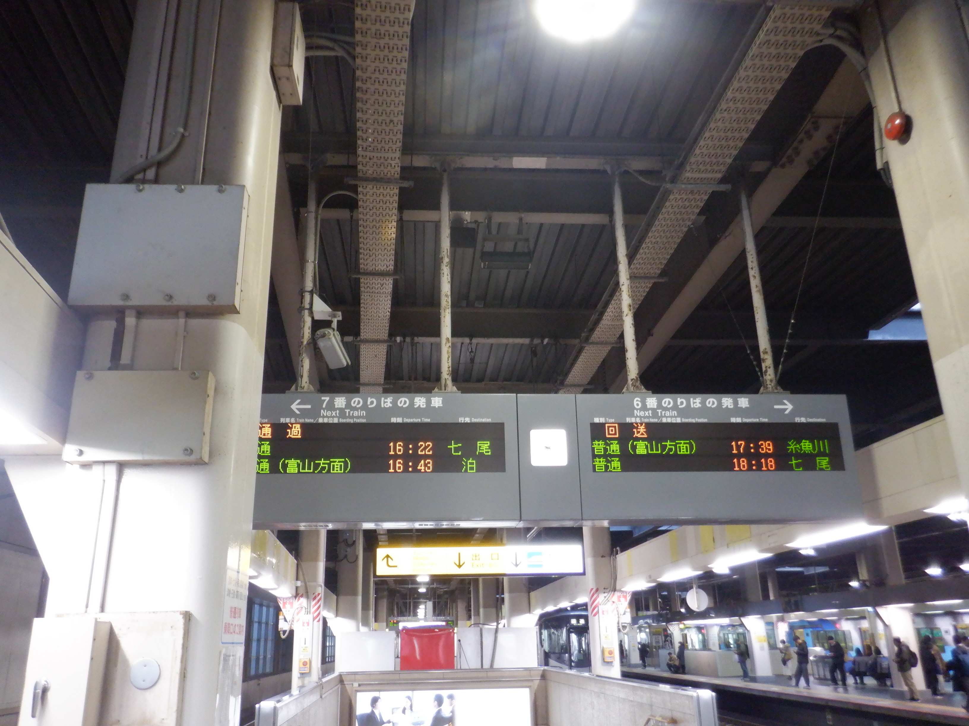 6・7番のりばの発車標。1月3日より七尾線は一旦高松まで復旧しました。