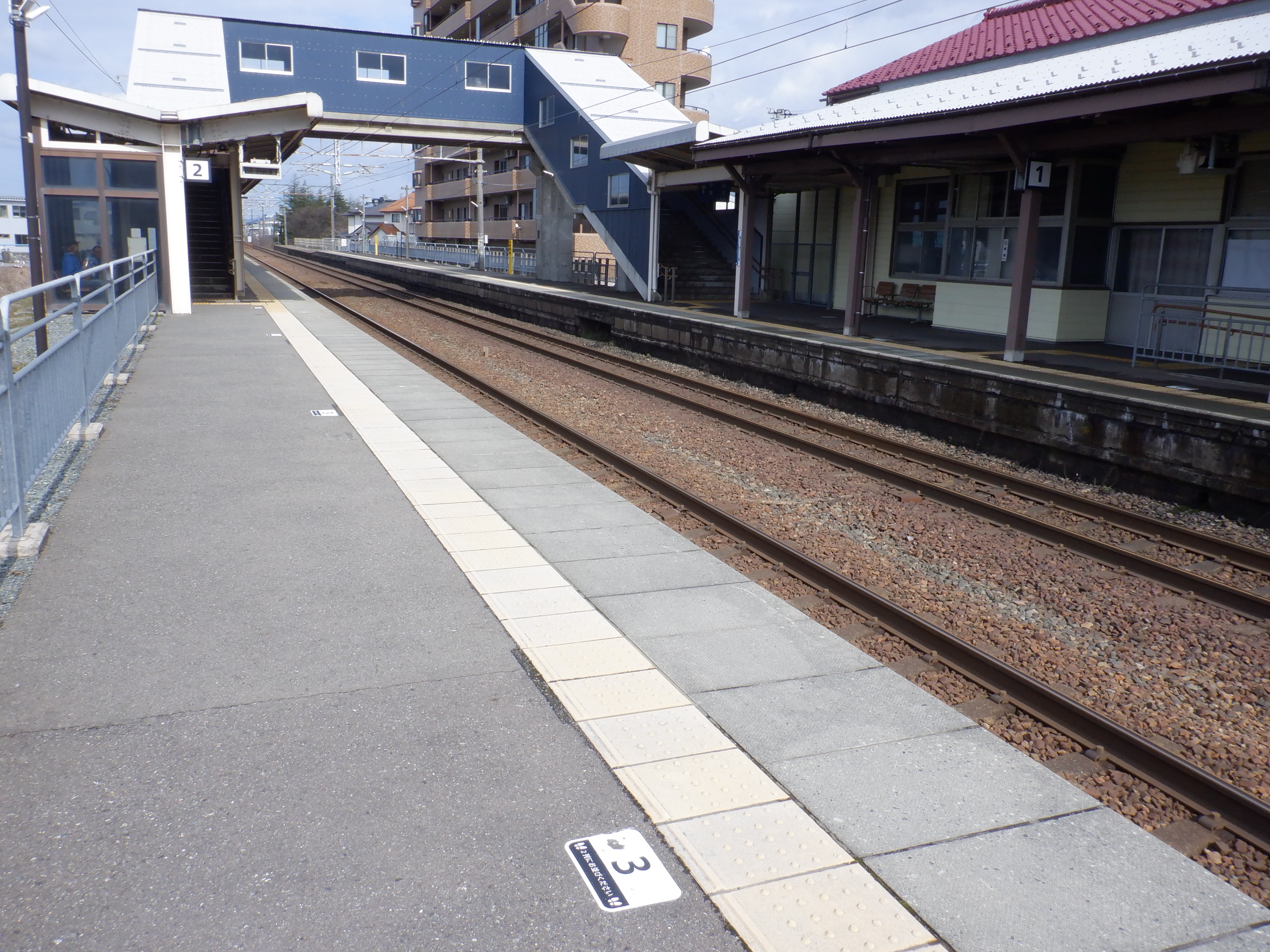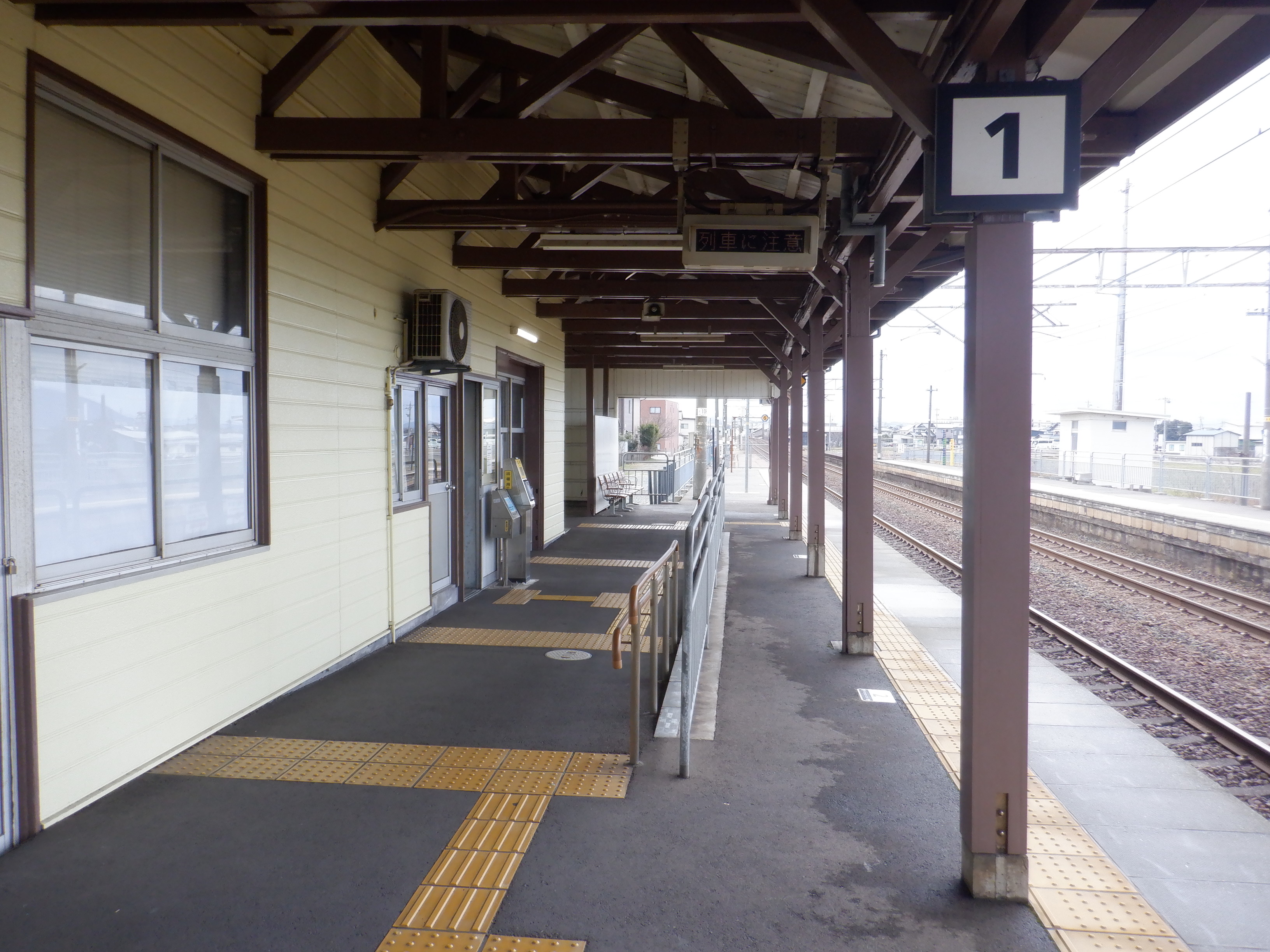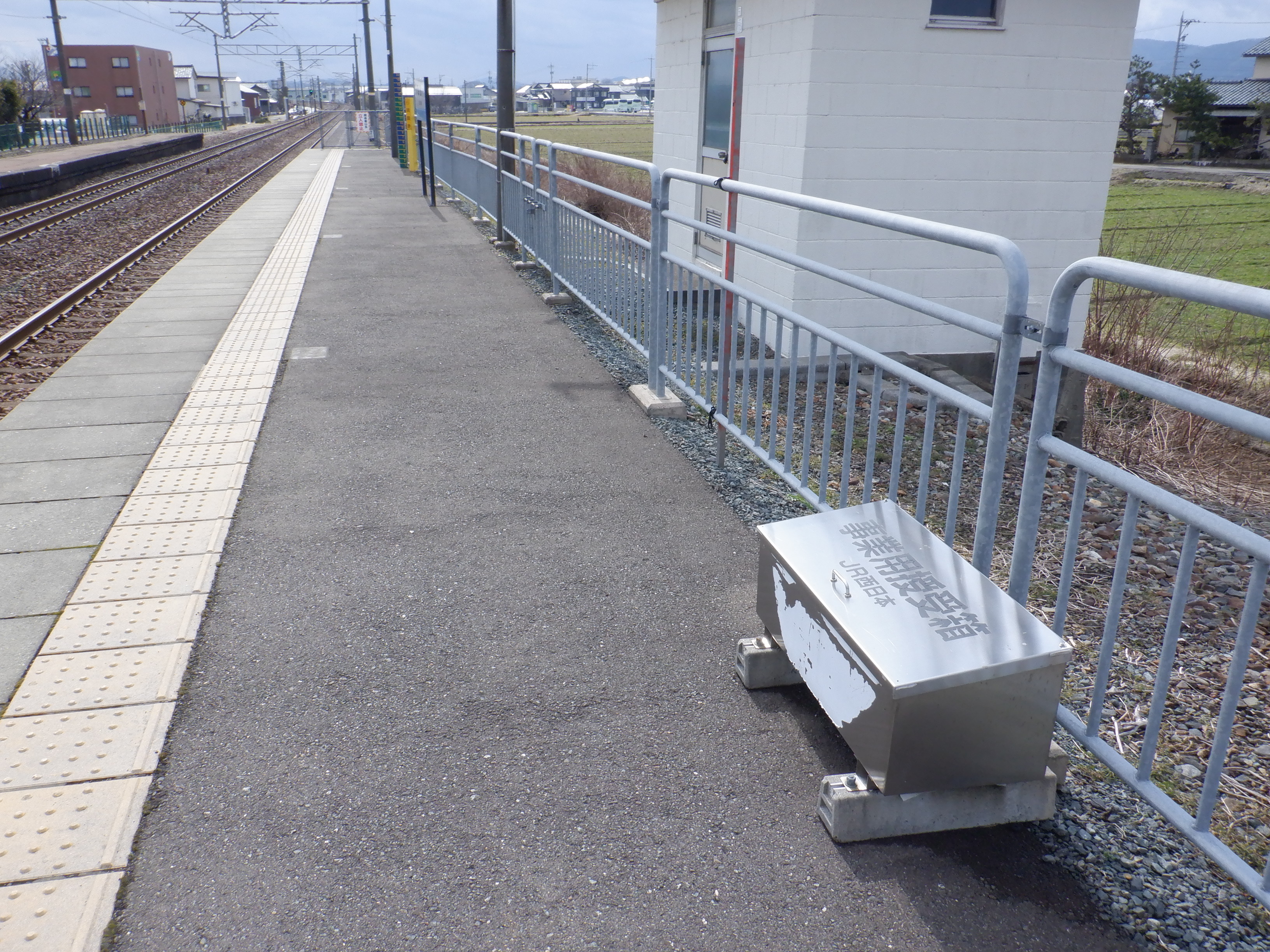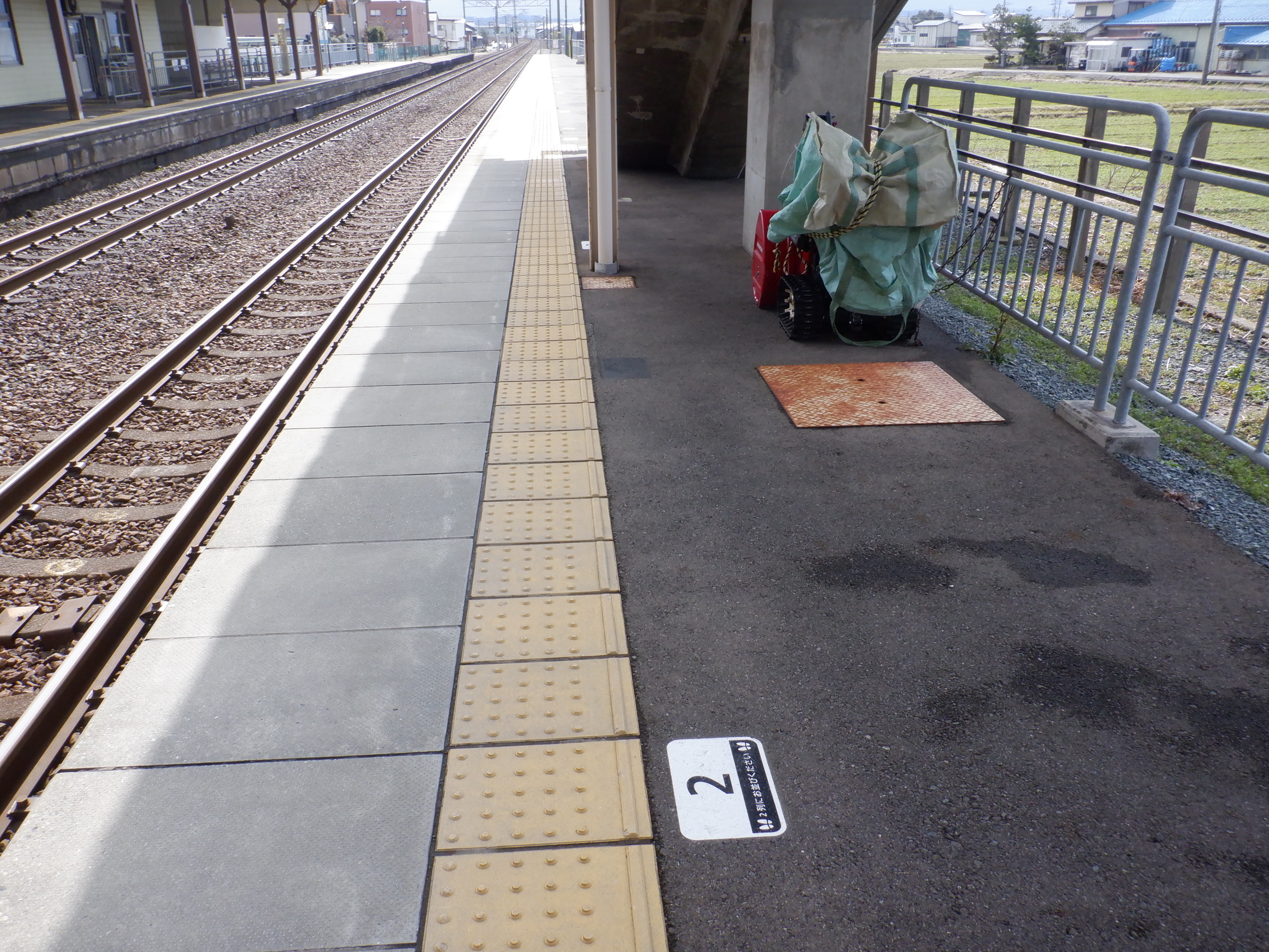 ホームの春江駅側から見た駅舎と反対側の様子。