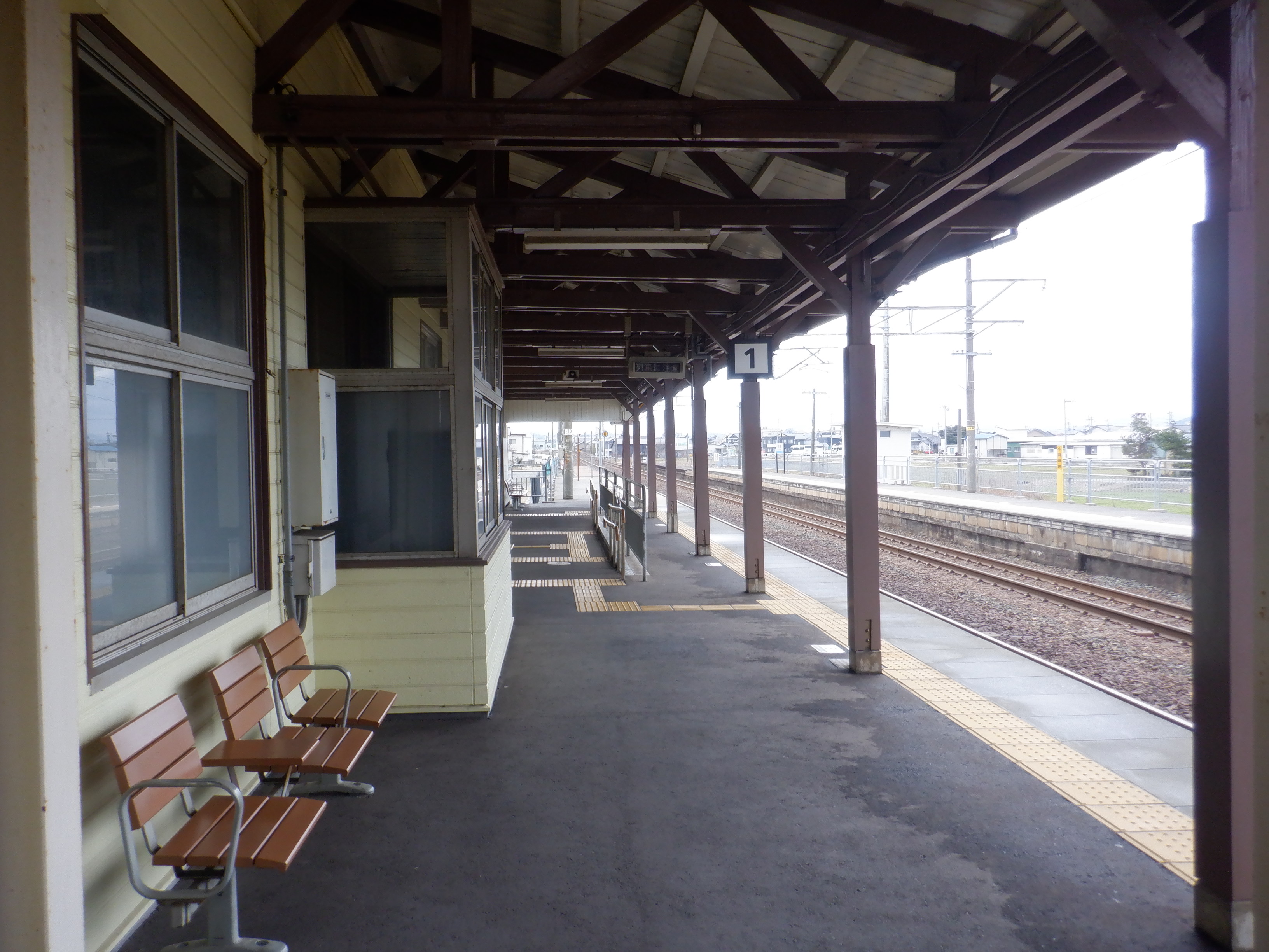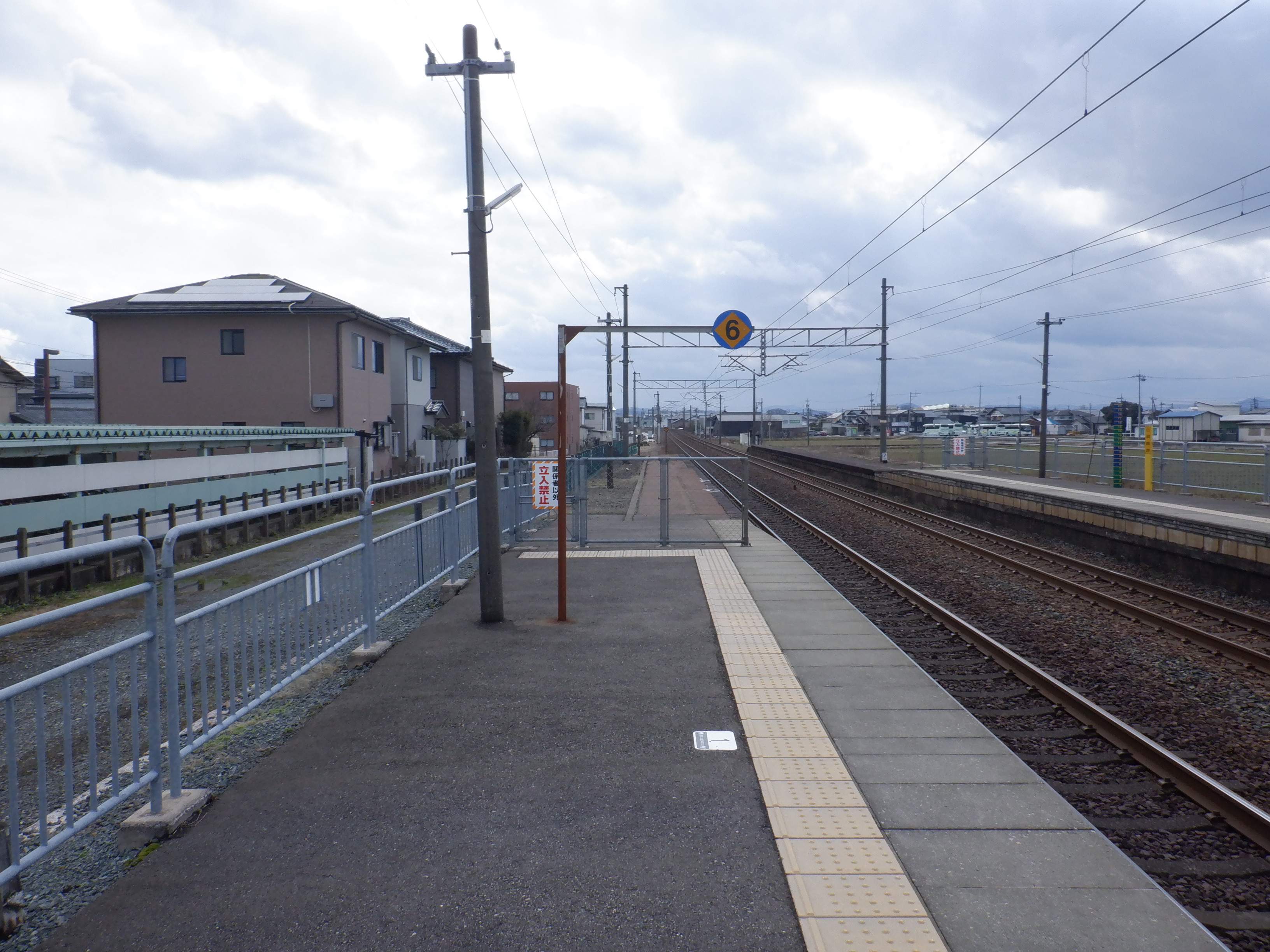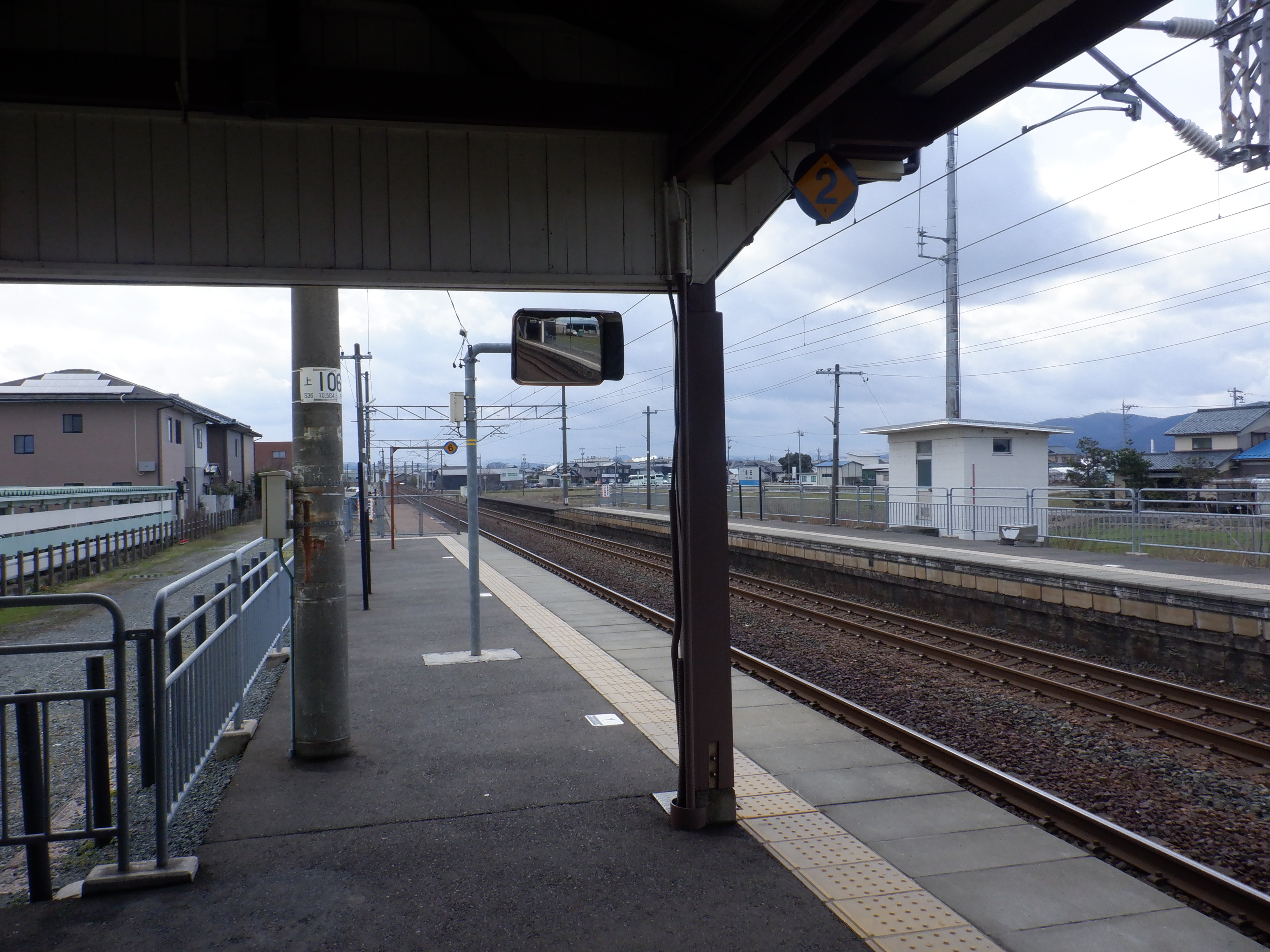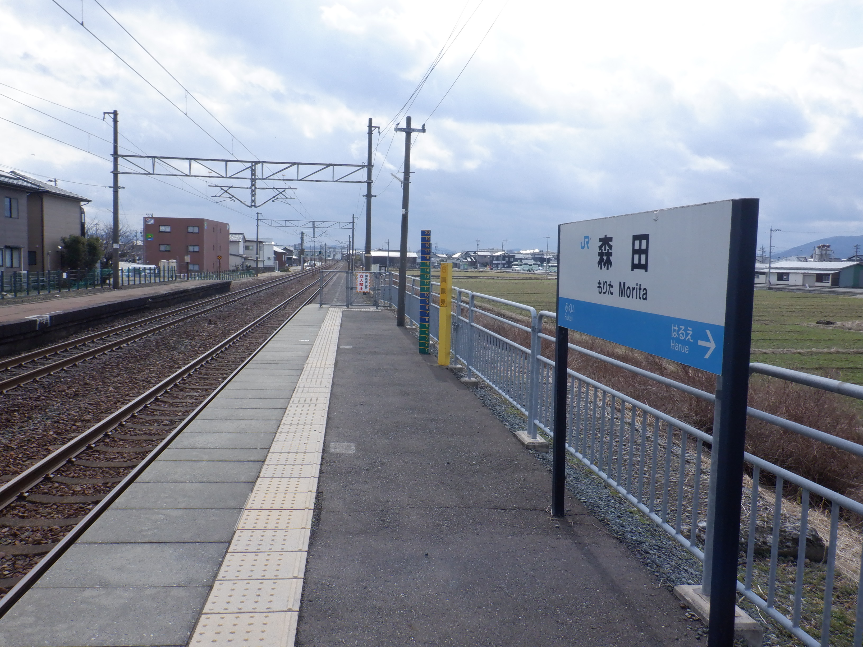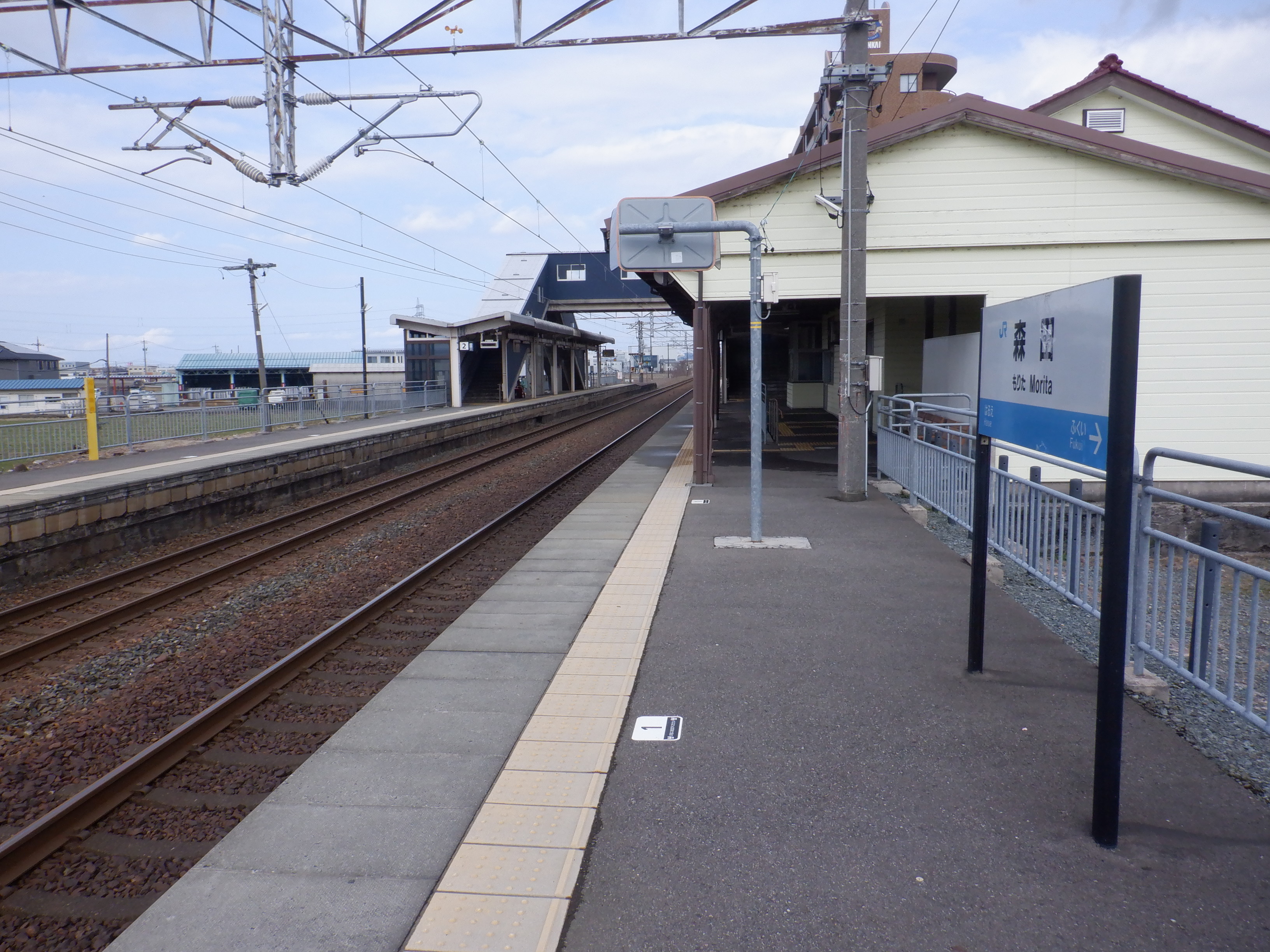 ホームの春江駅側から見た駅舎と反対側の様子。