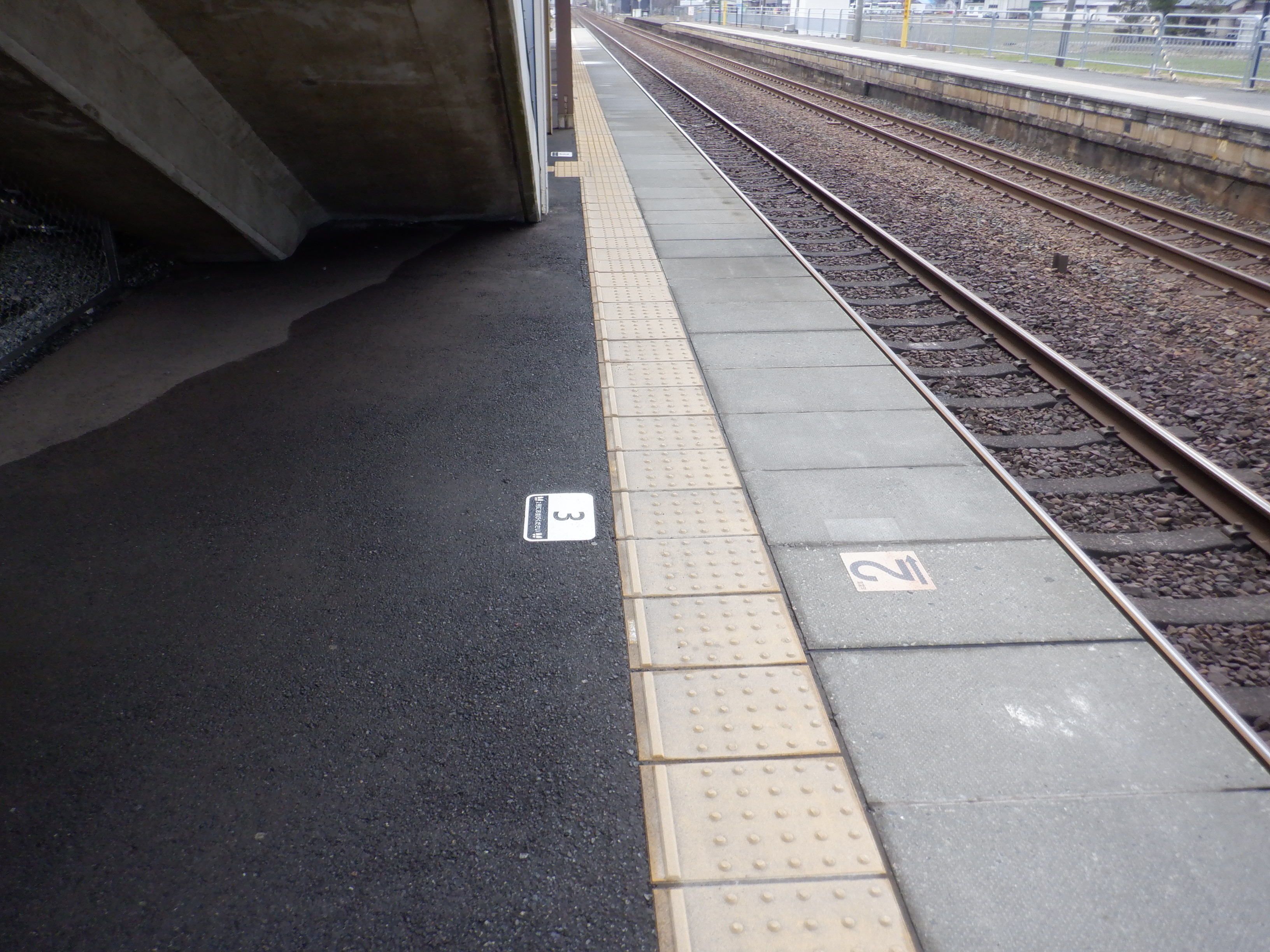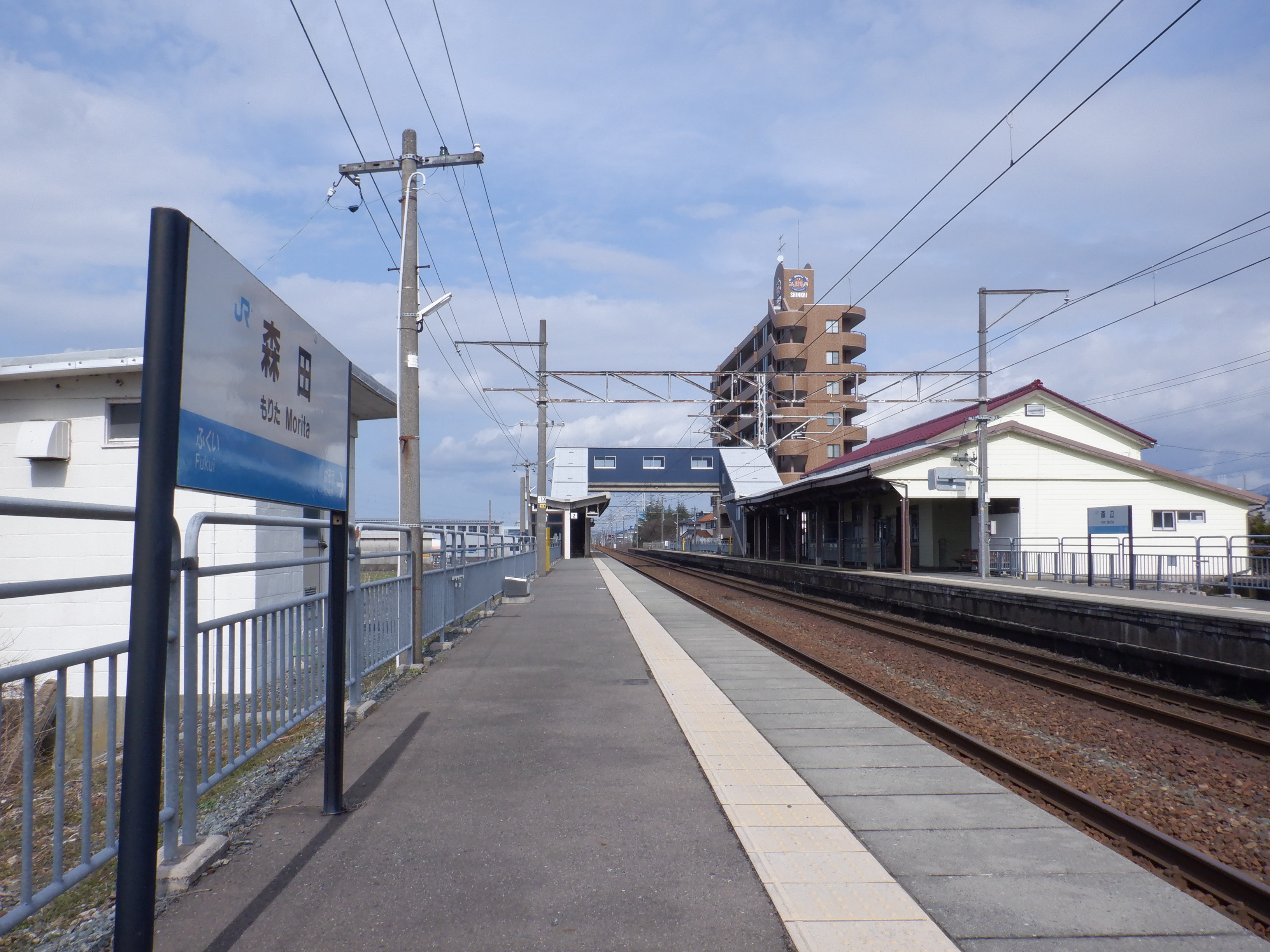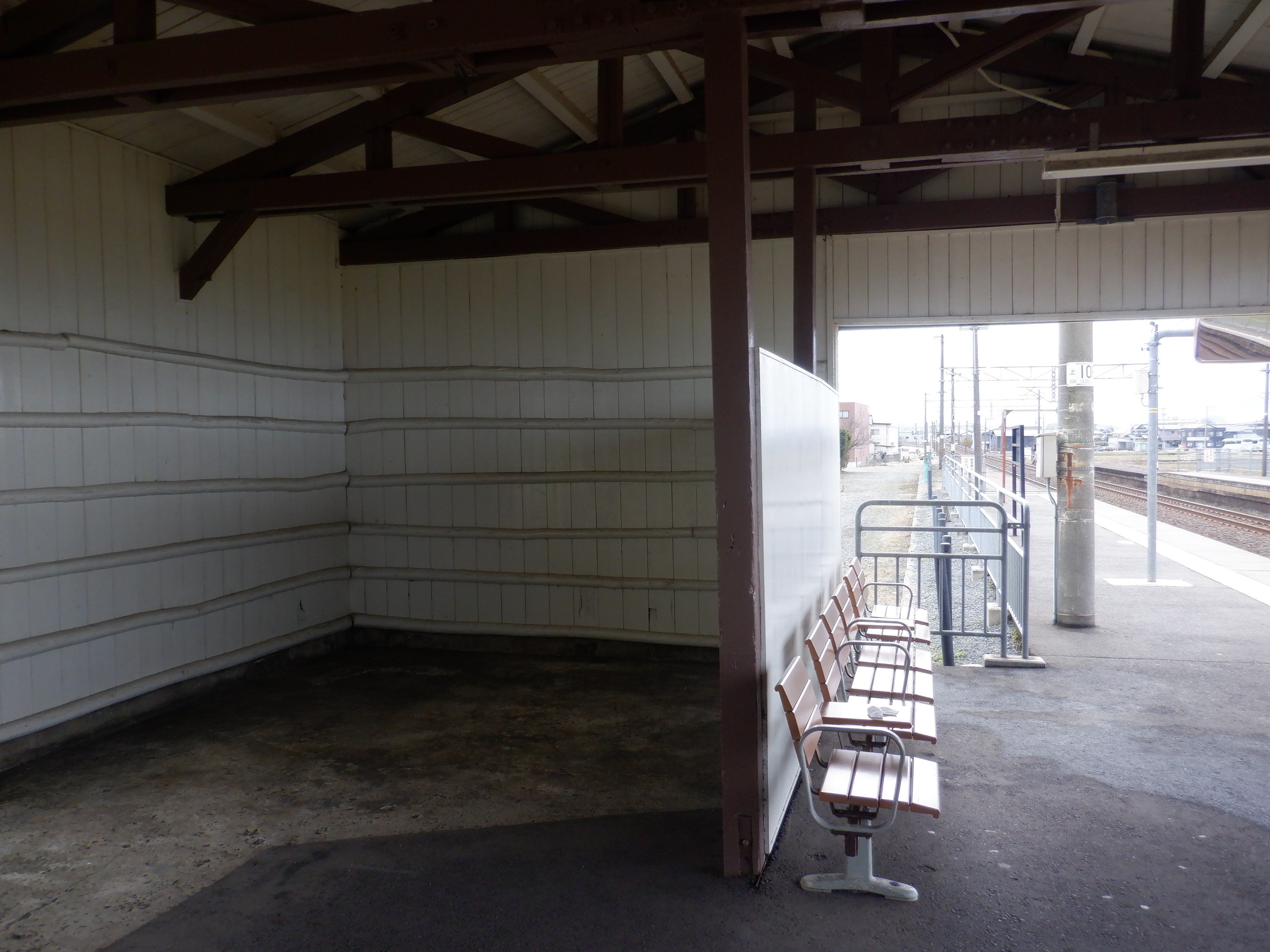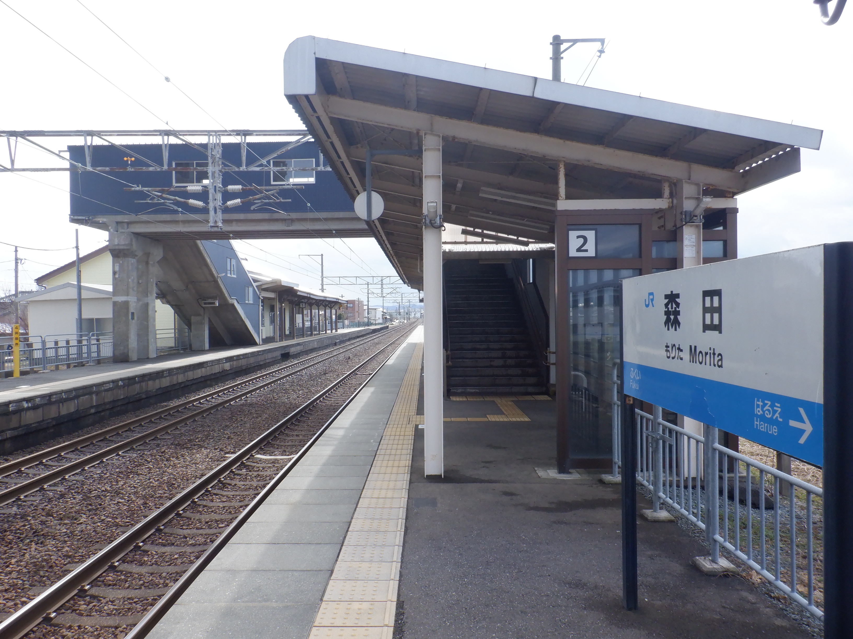 ホームの春江駅側から見た駅舎と反対側の様子。