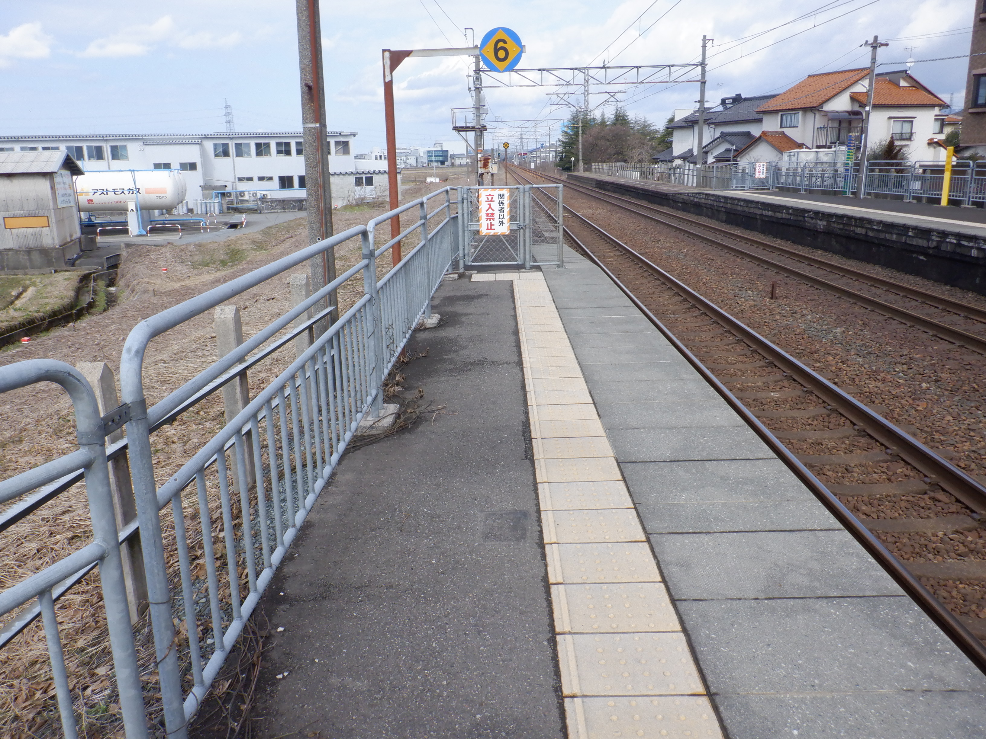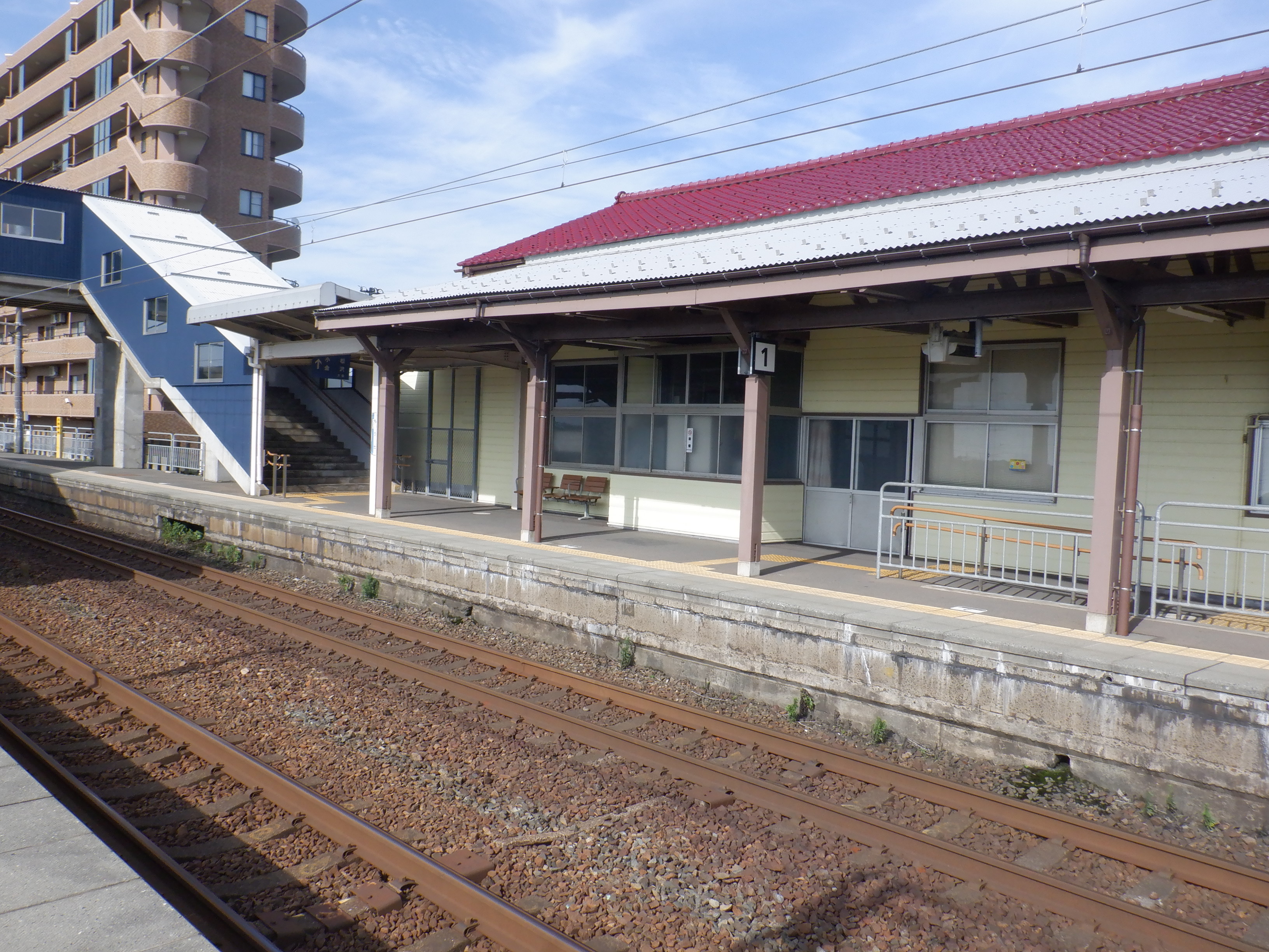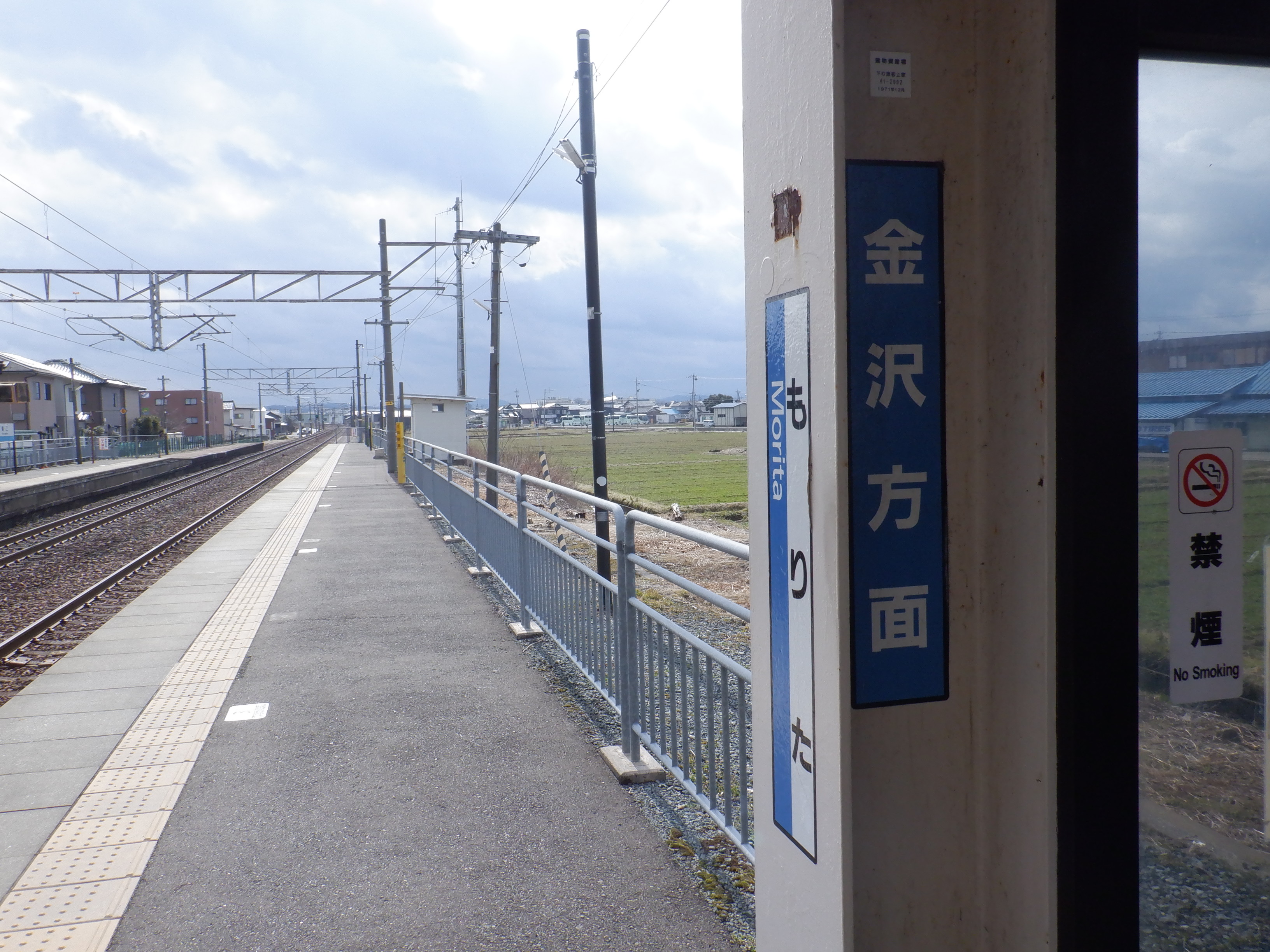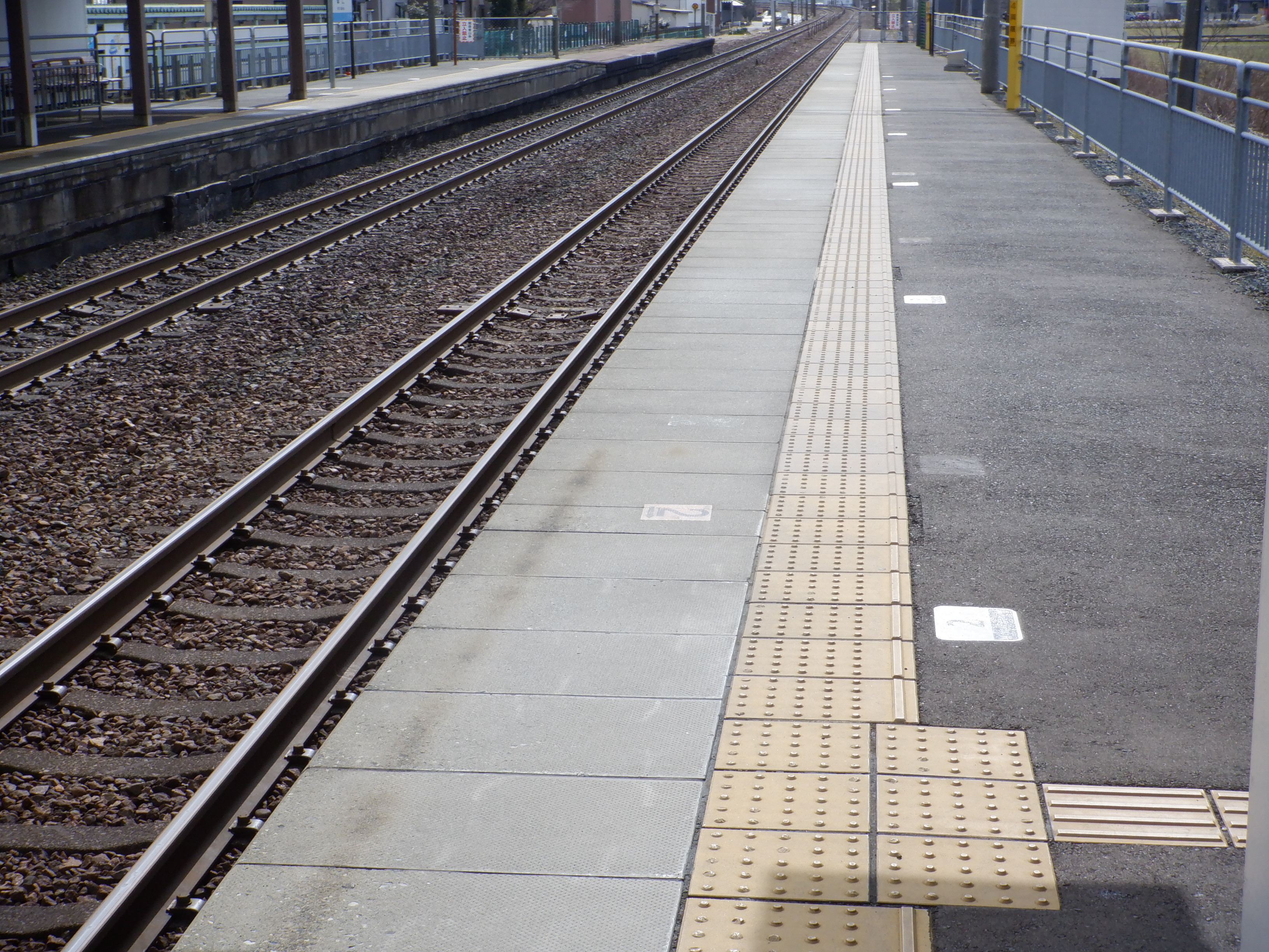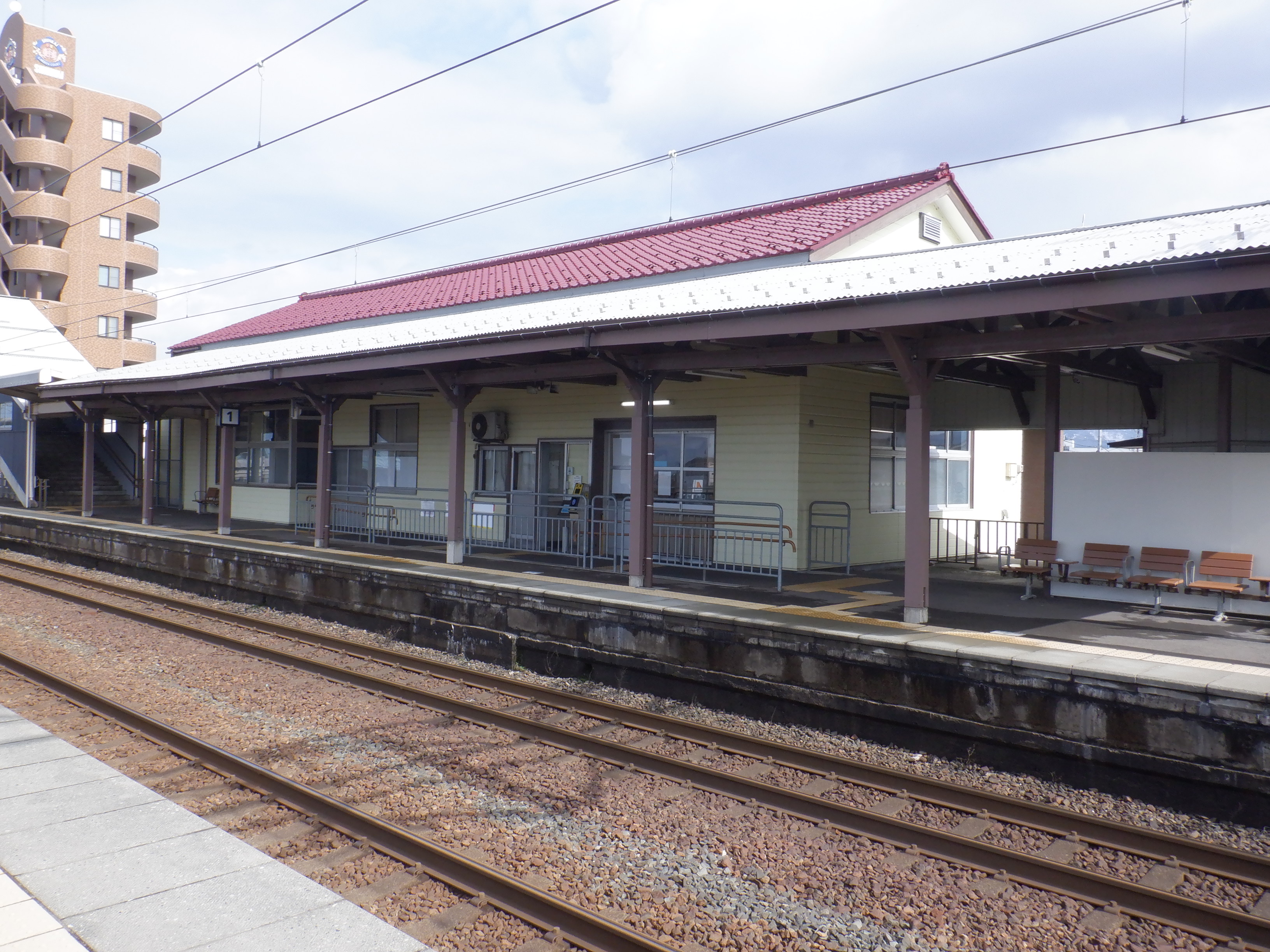 ホームの春江駅側から見た駅舎と反対側の様子。