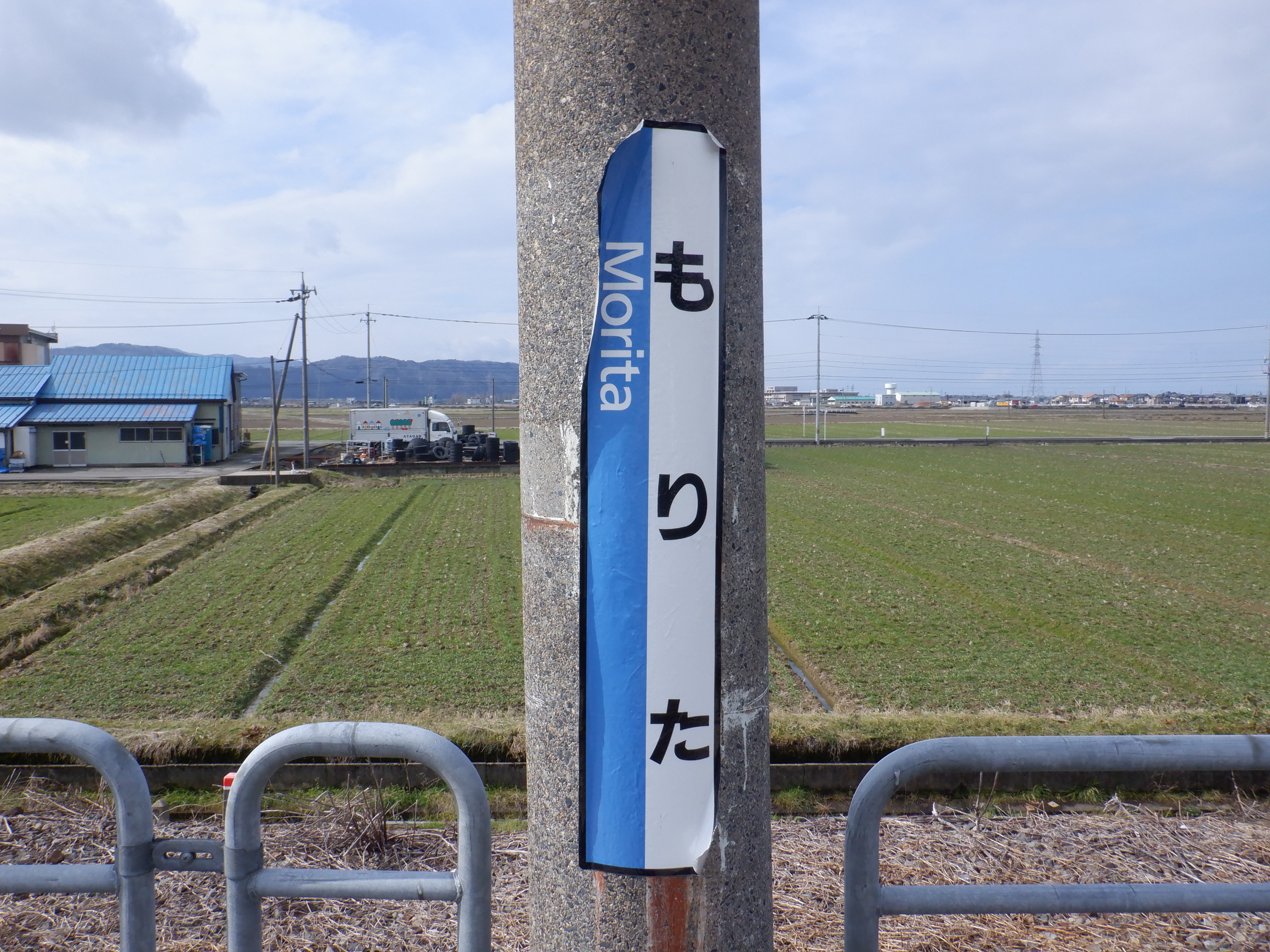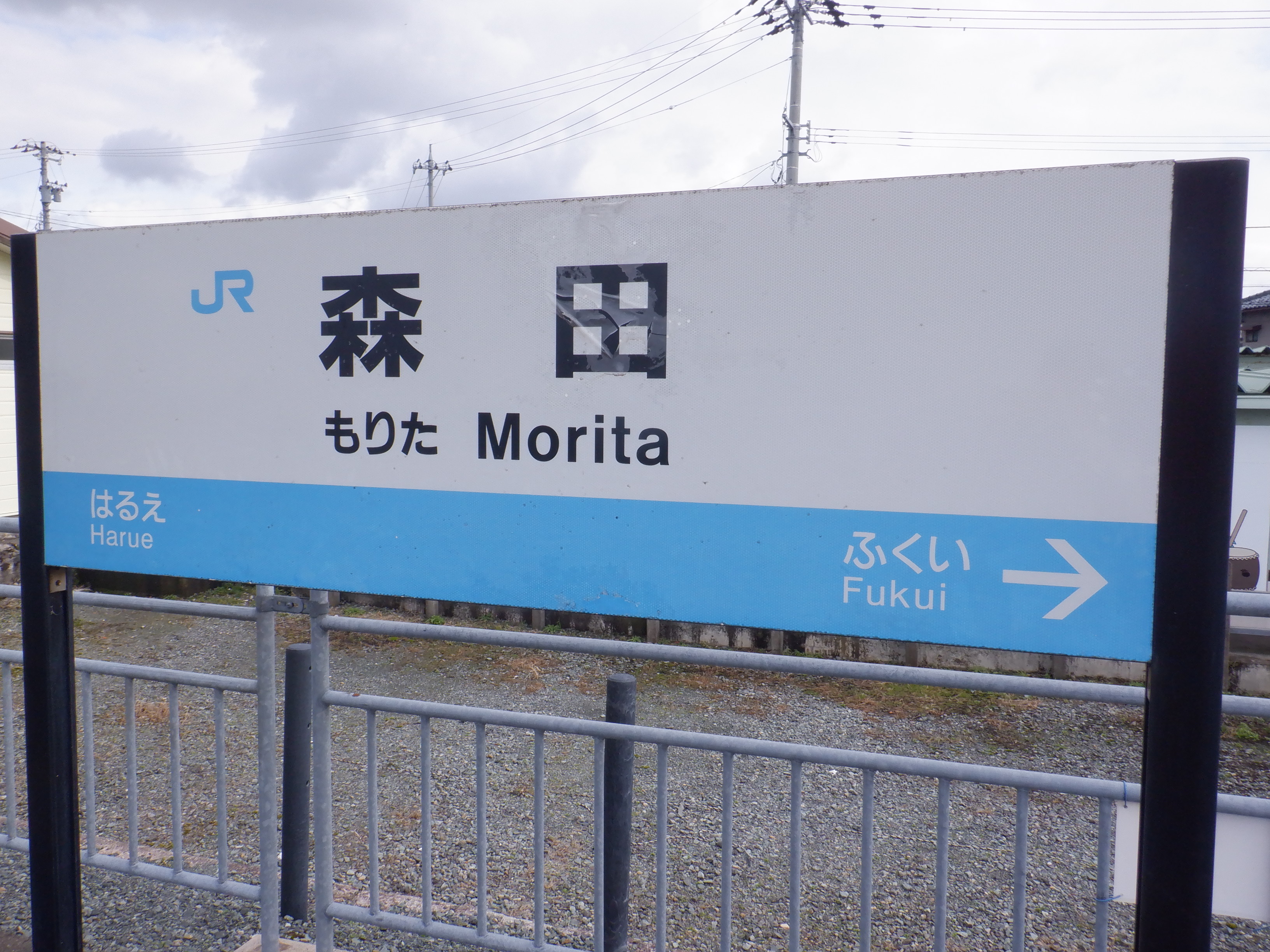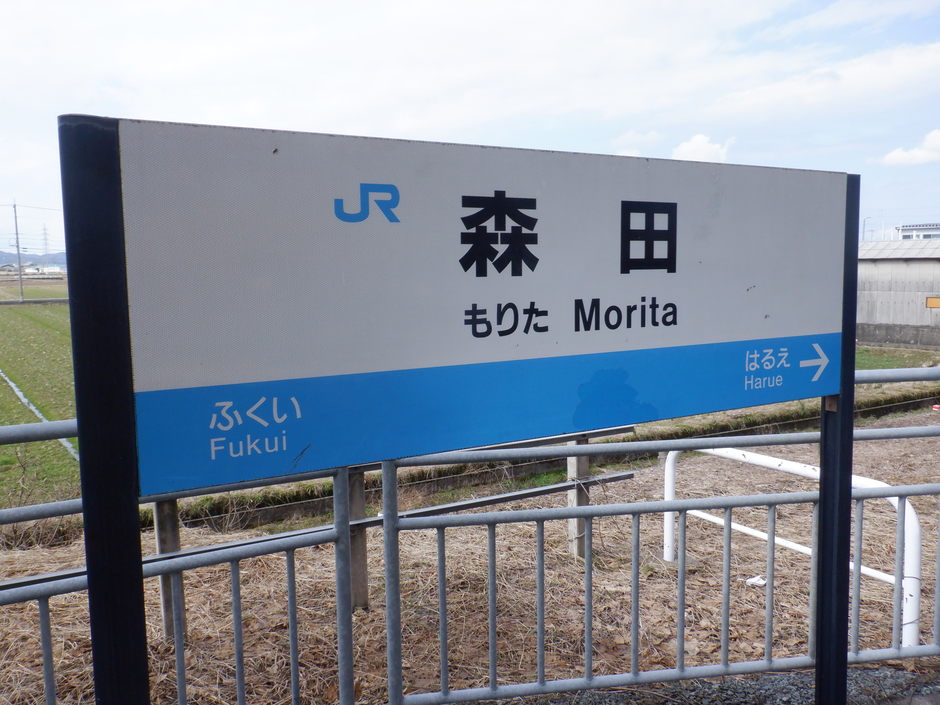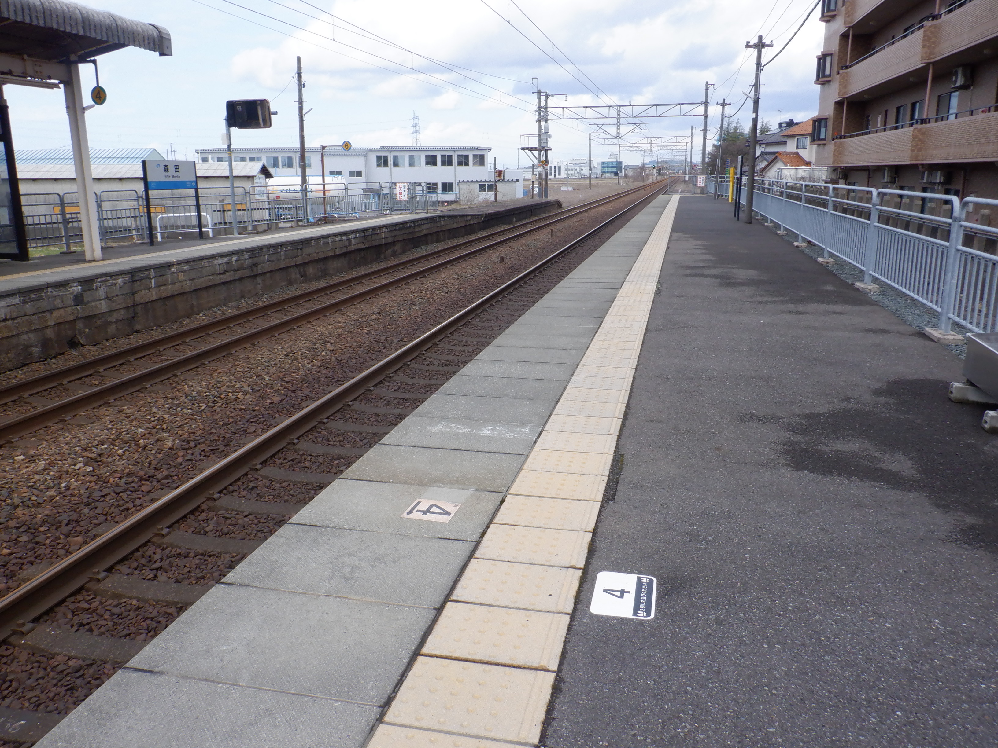ホームの春江駅側から見た駅舎と反対側の様子。