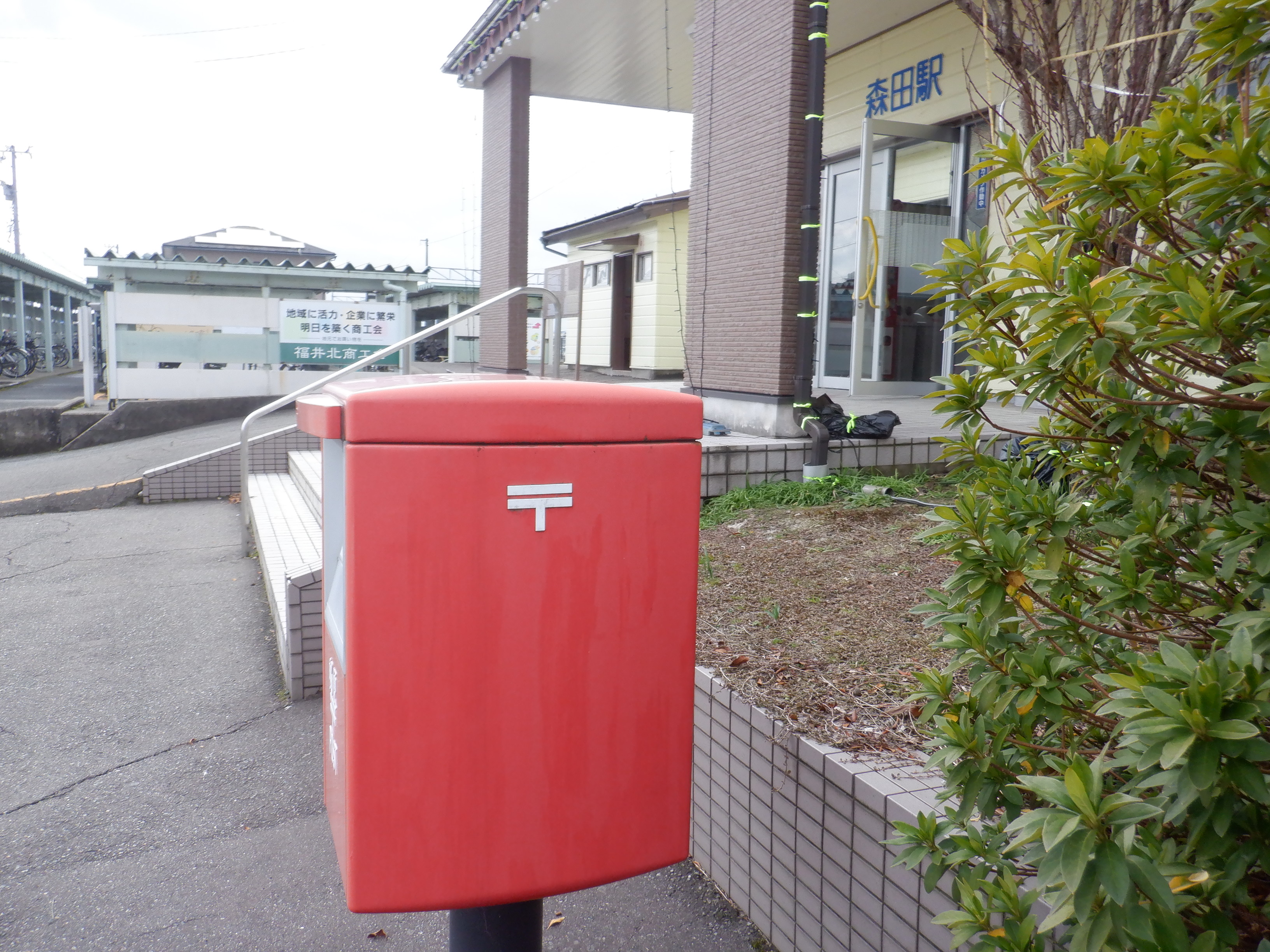 駅舎入口とポスト。