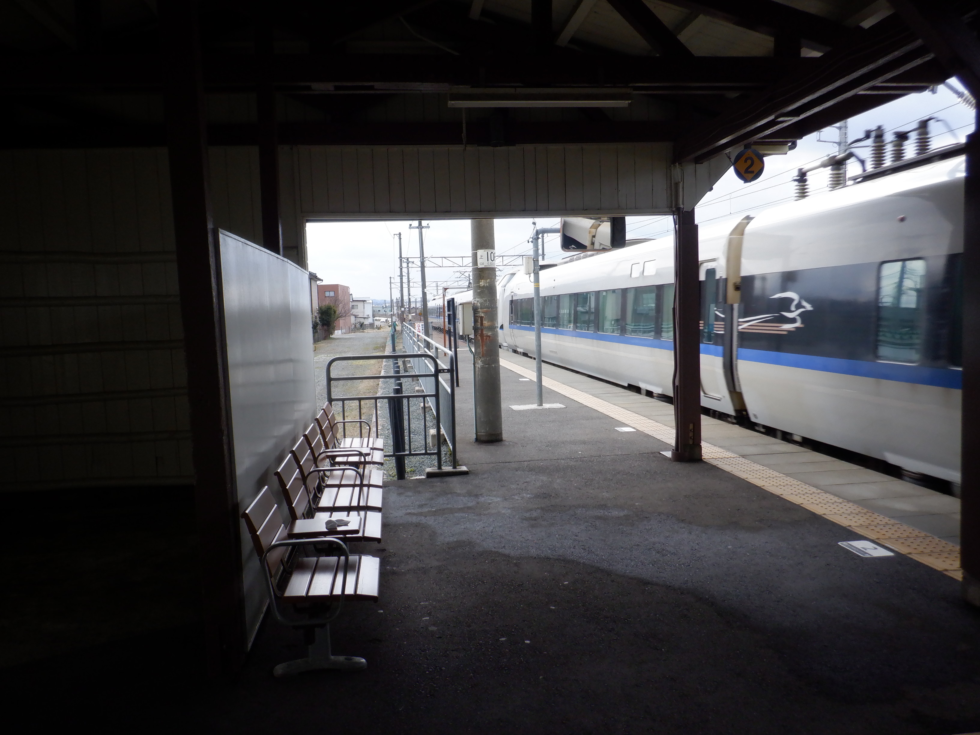 2番のりば上屋付近にある方面標・番線標と2両編成の最後尾。