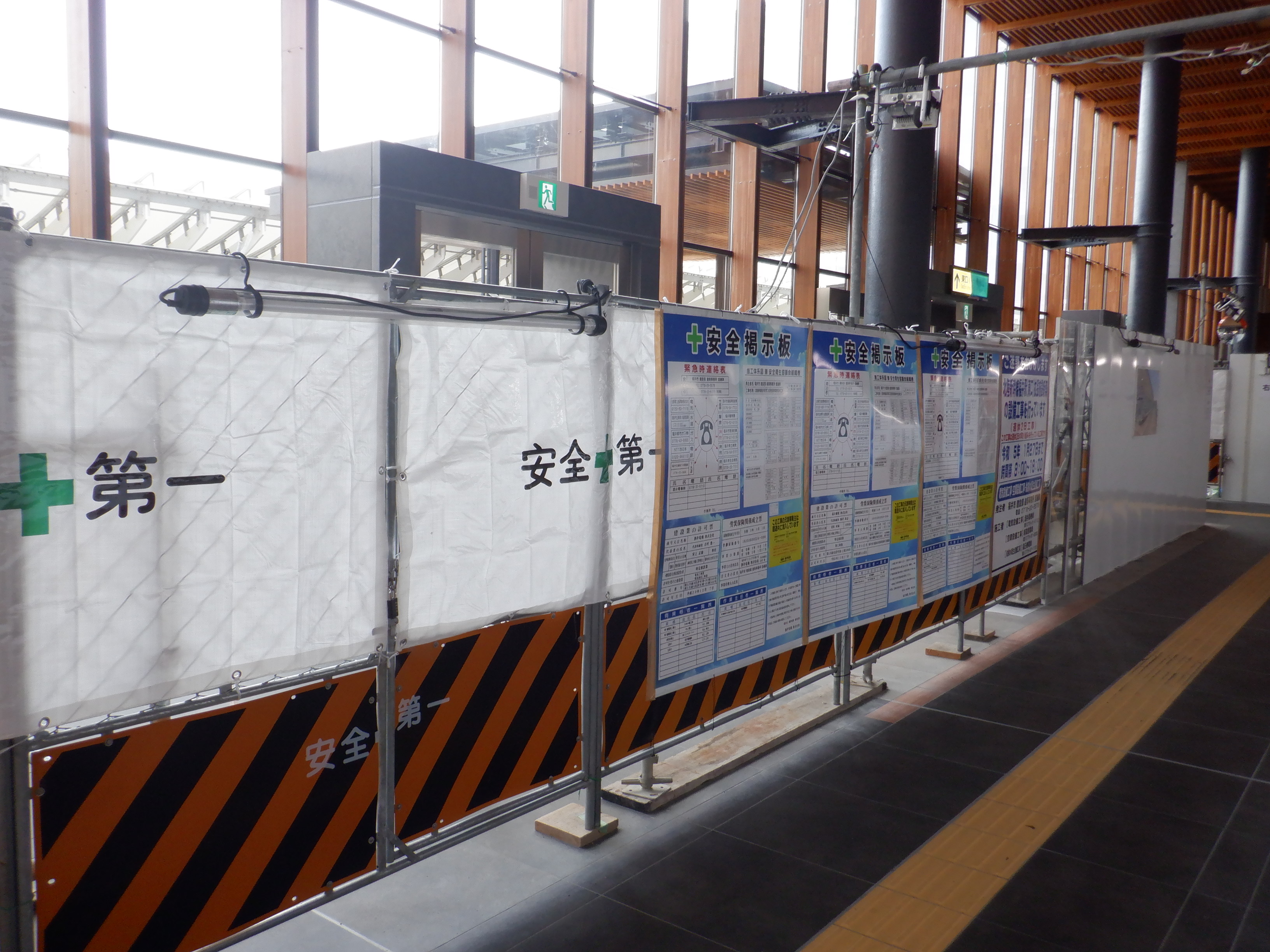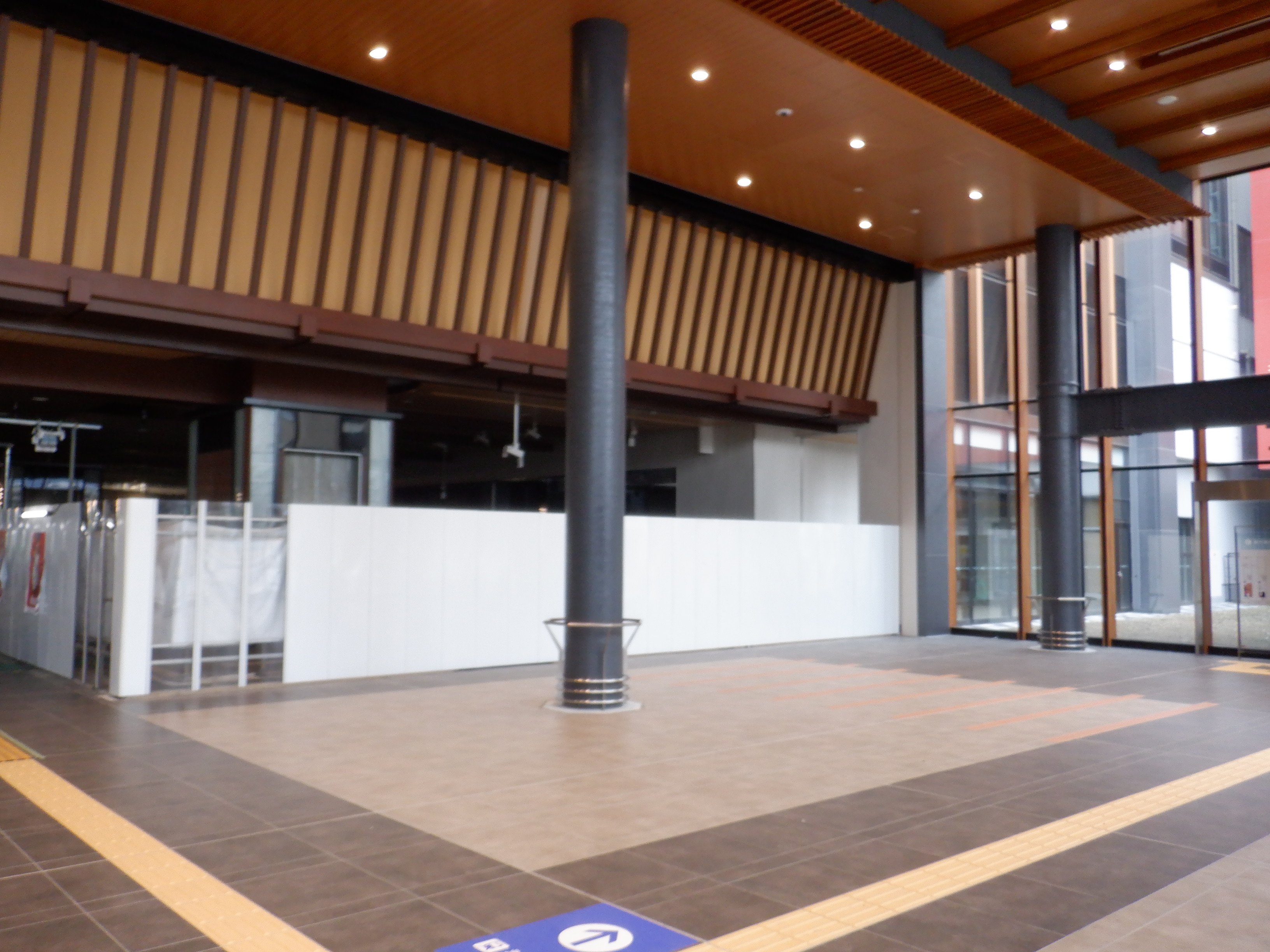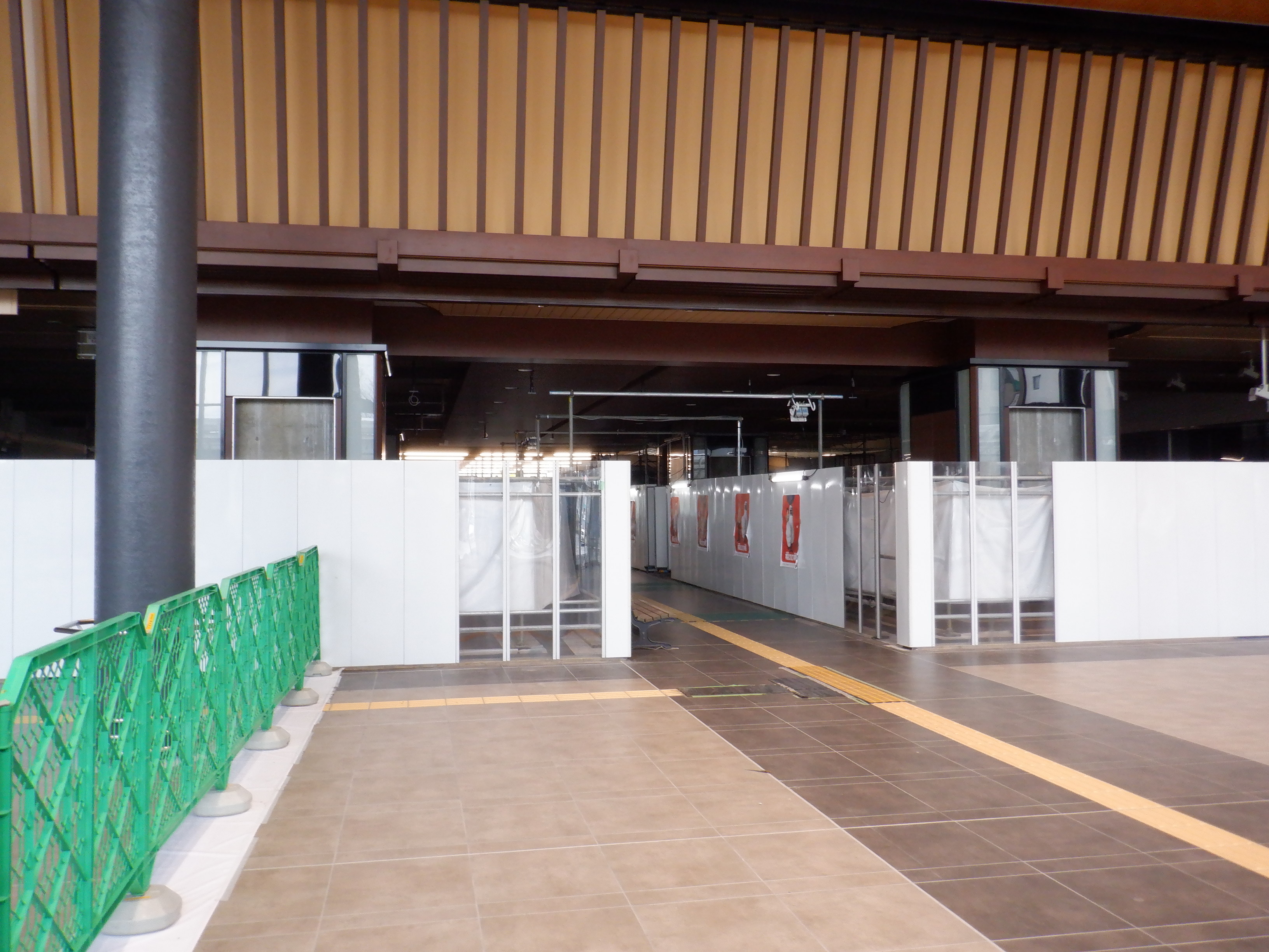 拡張施設周辺の工事が進んでいます。また、乗換改札口になるところに看板らしきものが取り付けられました。