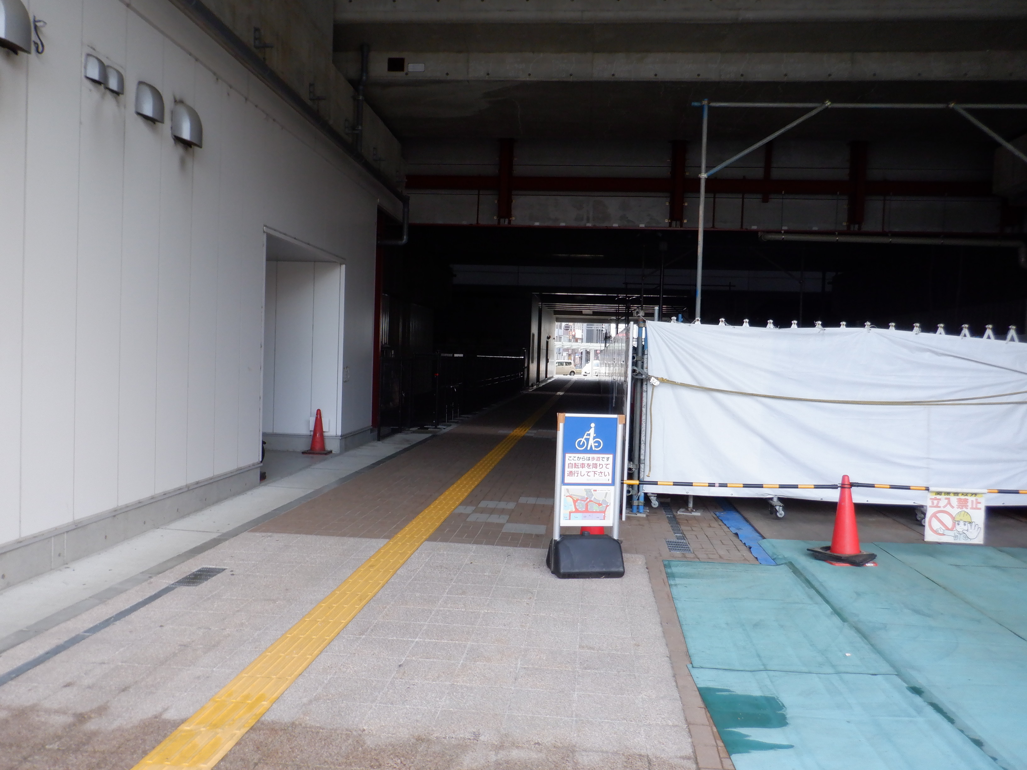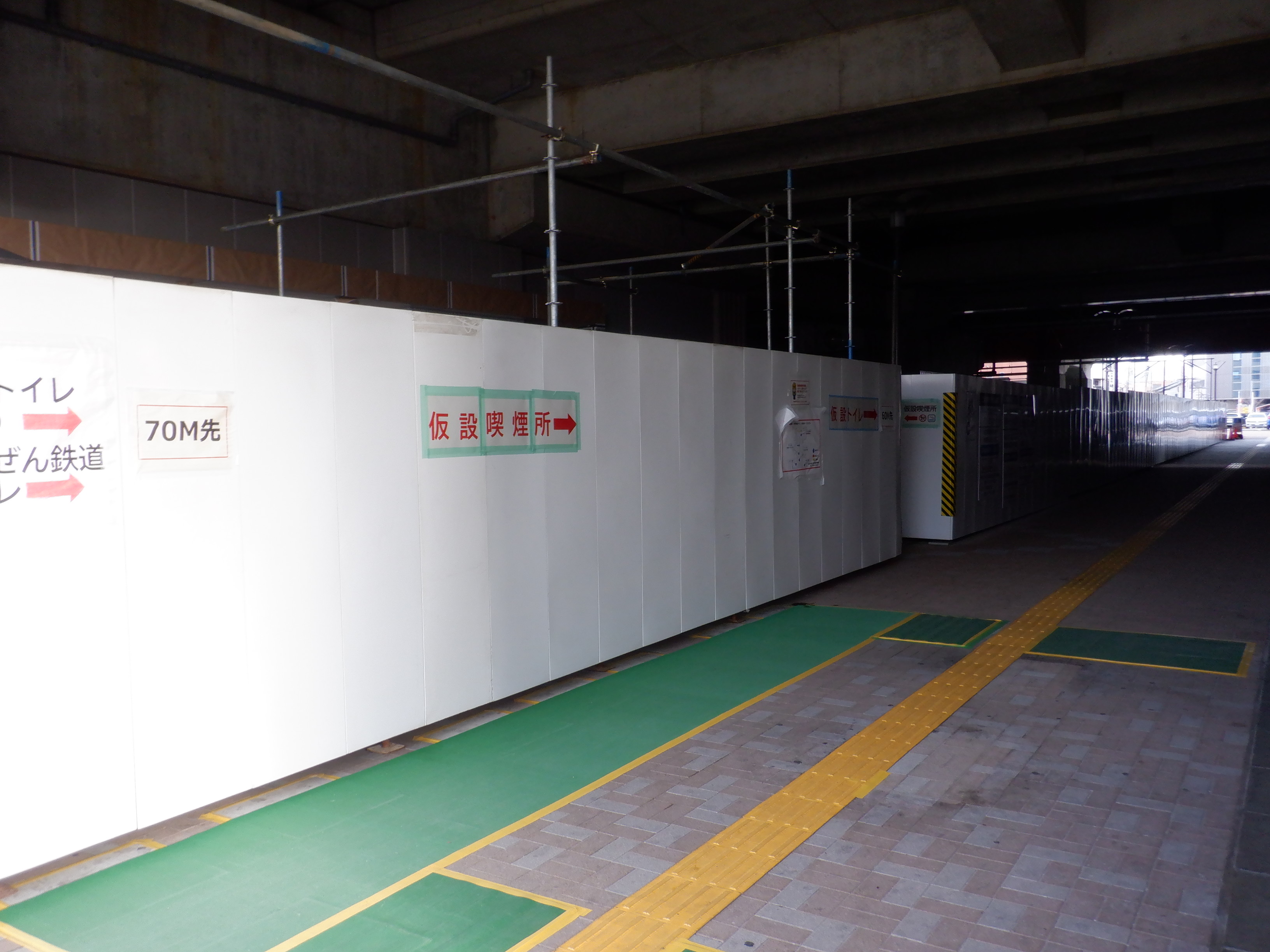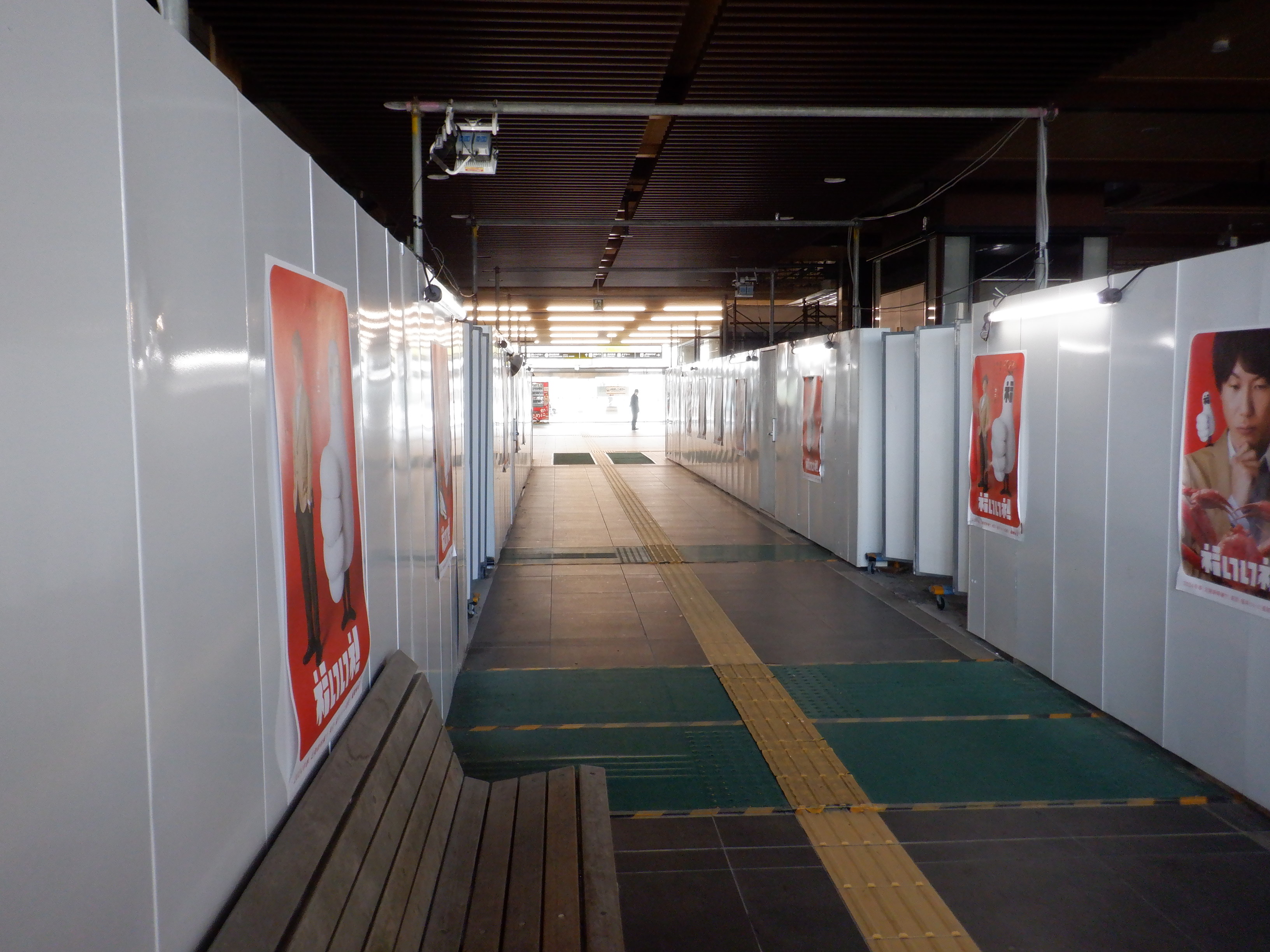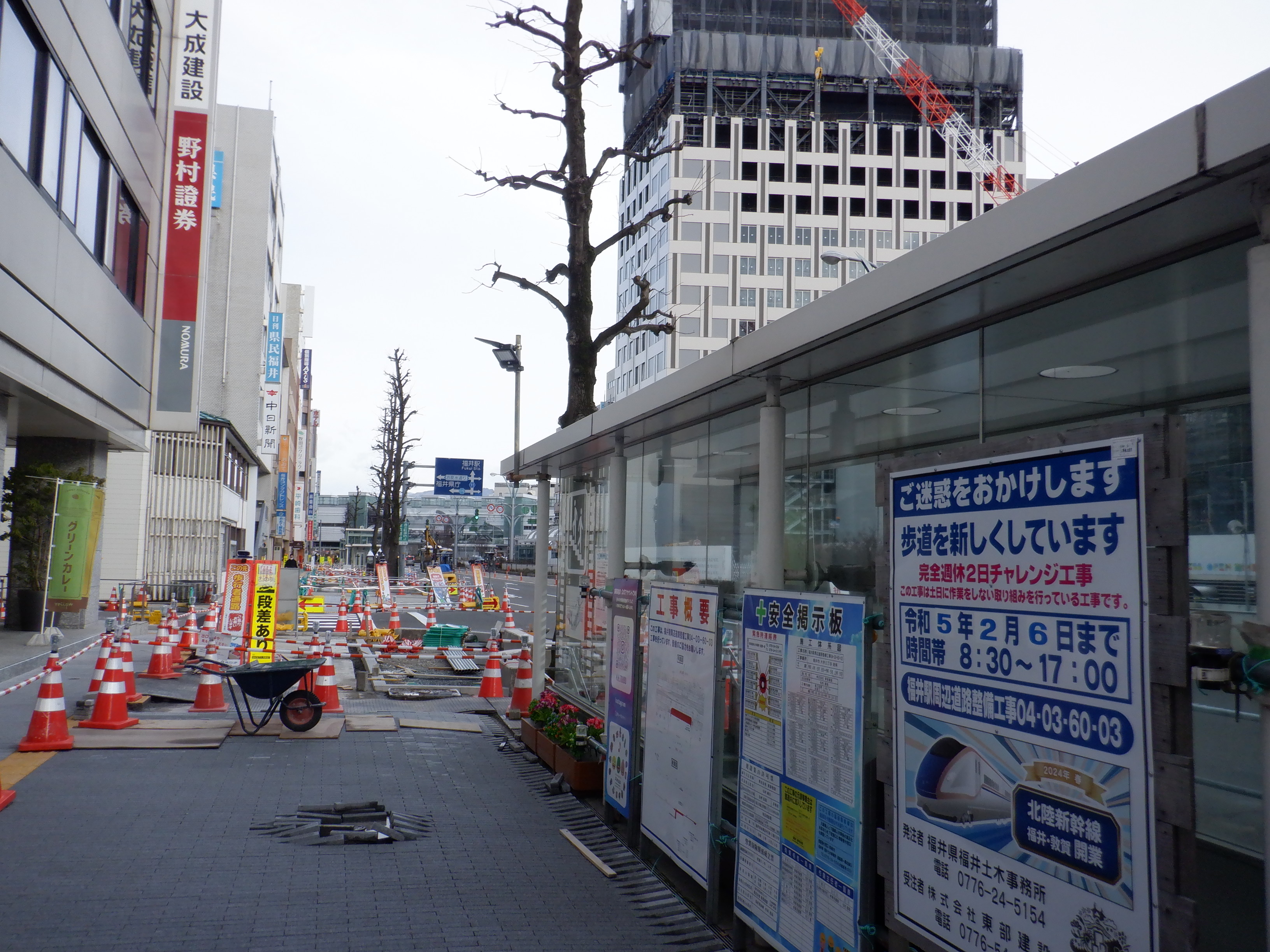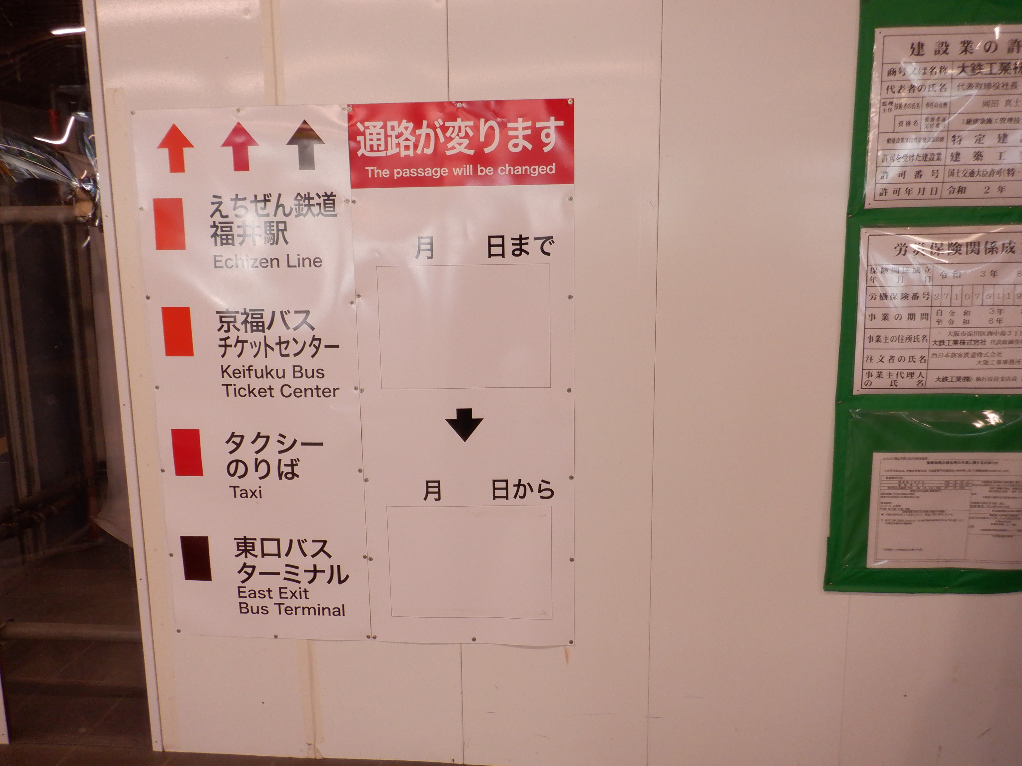 西口から東口へ、えちぜん鉄道福井駅の新福井駅側に抜ける高架下。トイレの部分が工事中のようです。