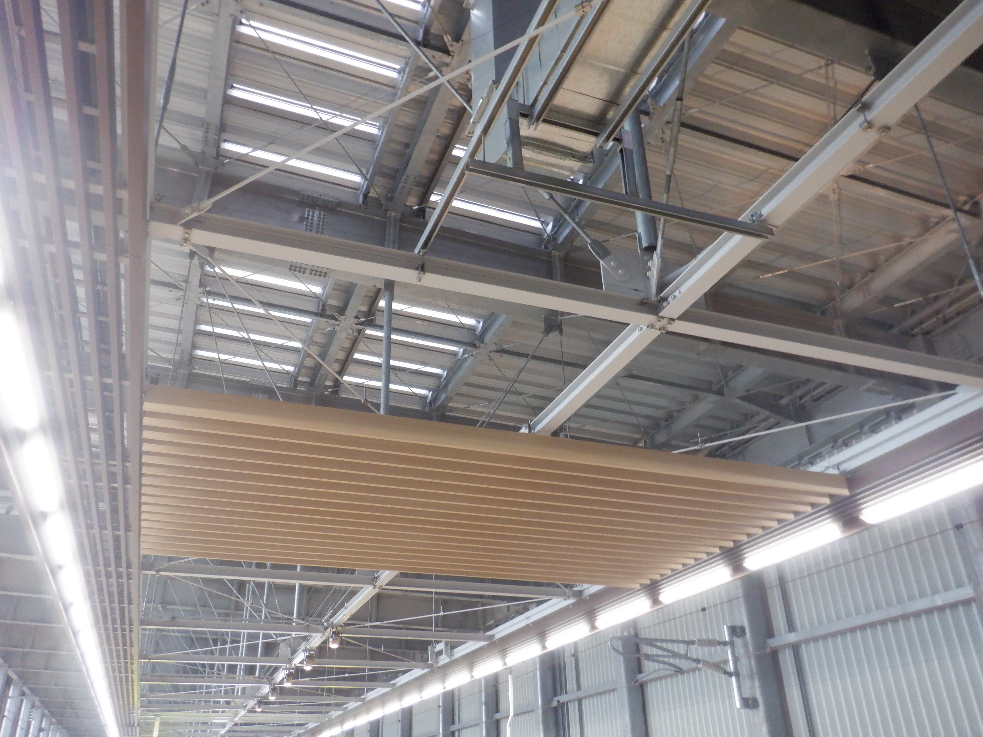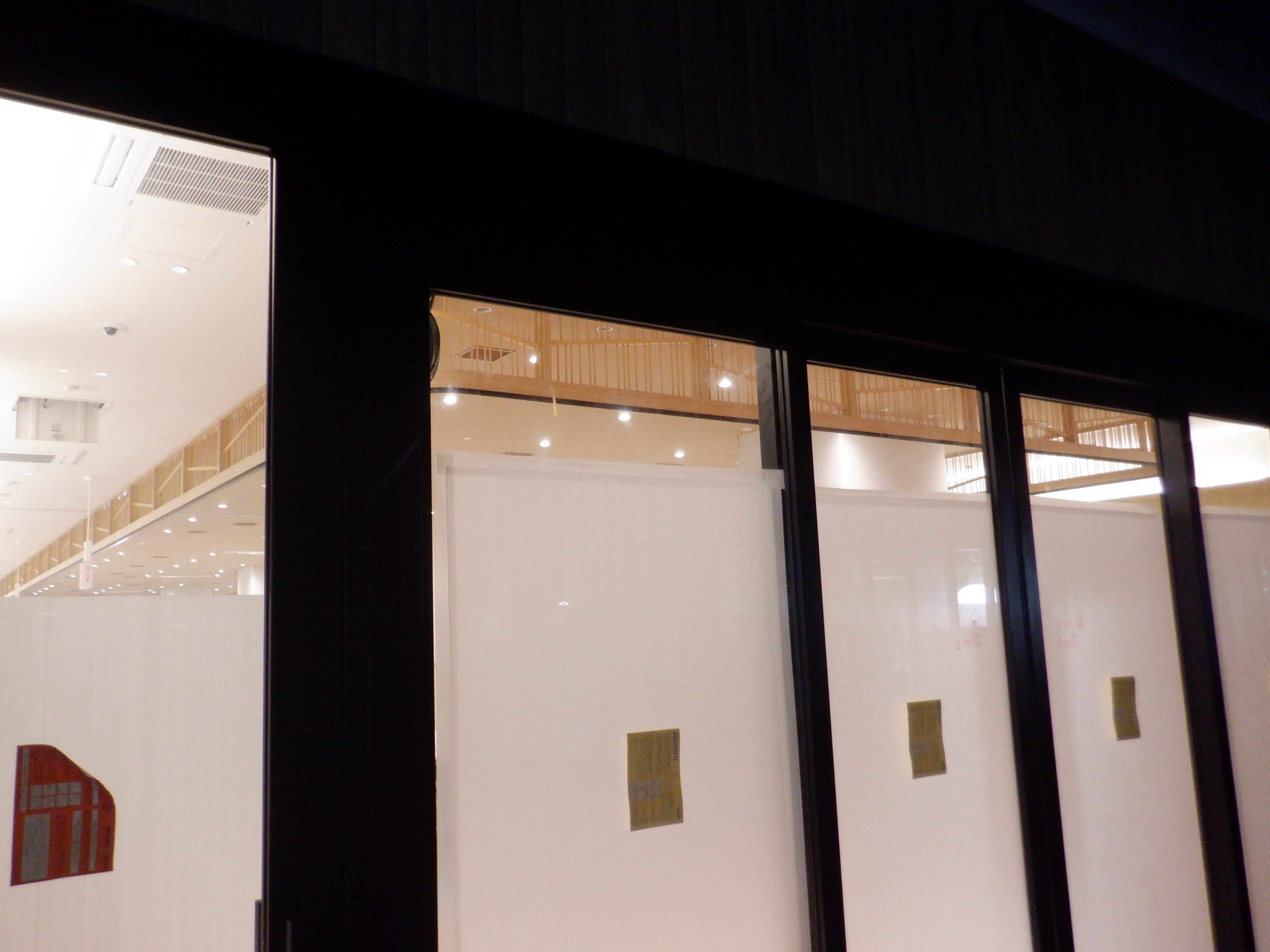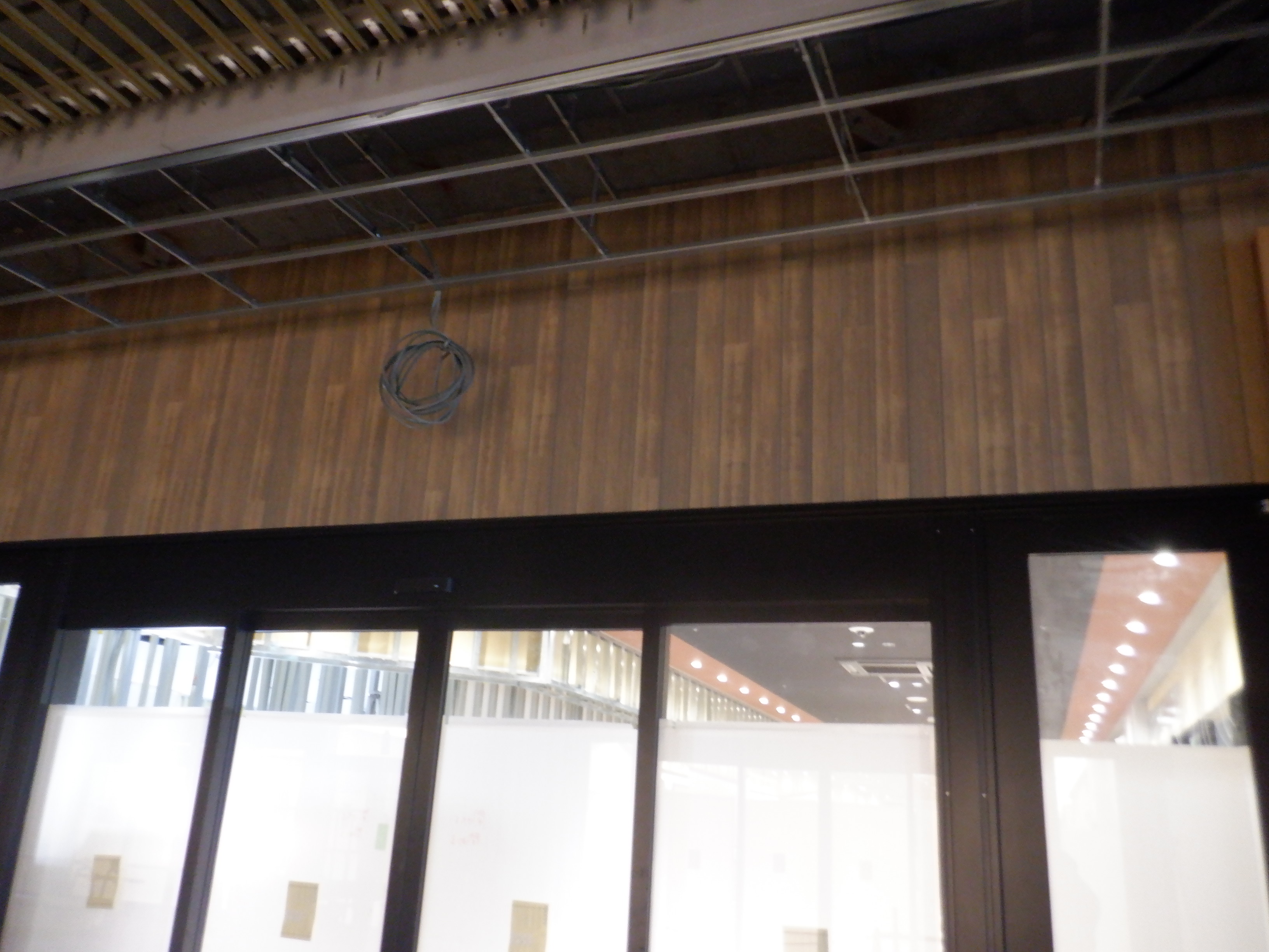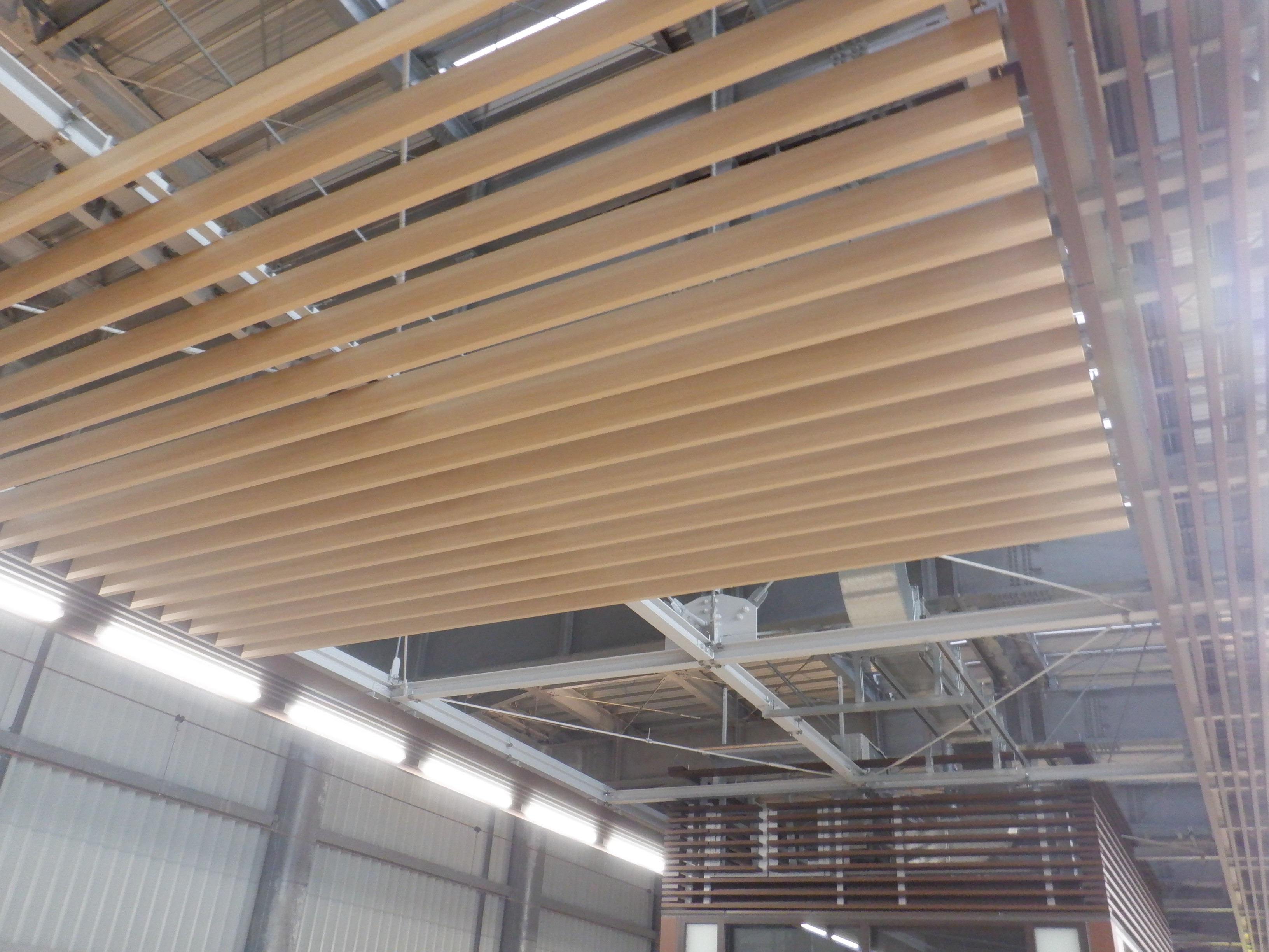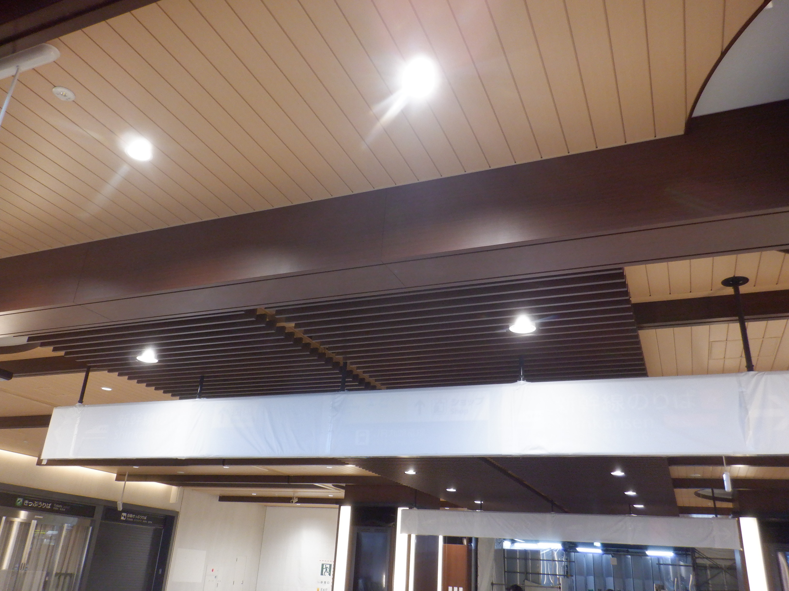 天井の様子。これが作りかけでこの木が全体に取り付けられるのかどうかと思ったら、開業後もこのままでした。