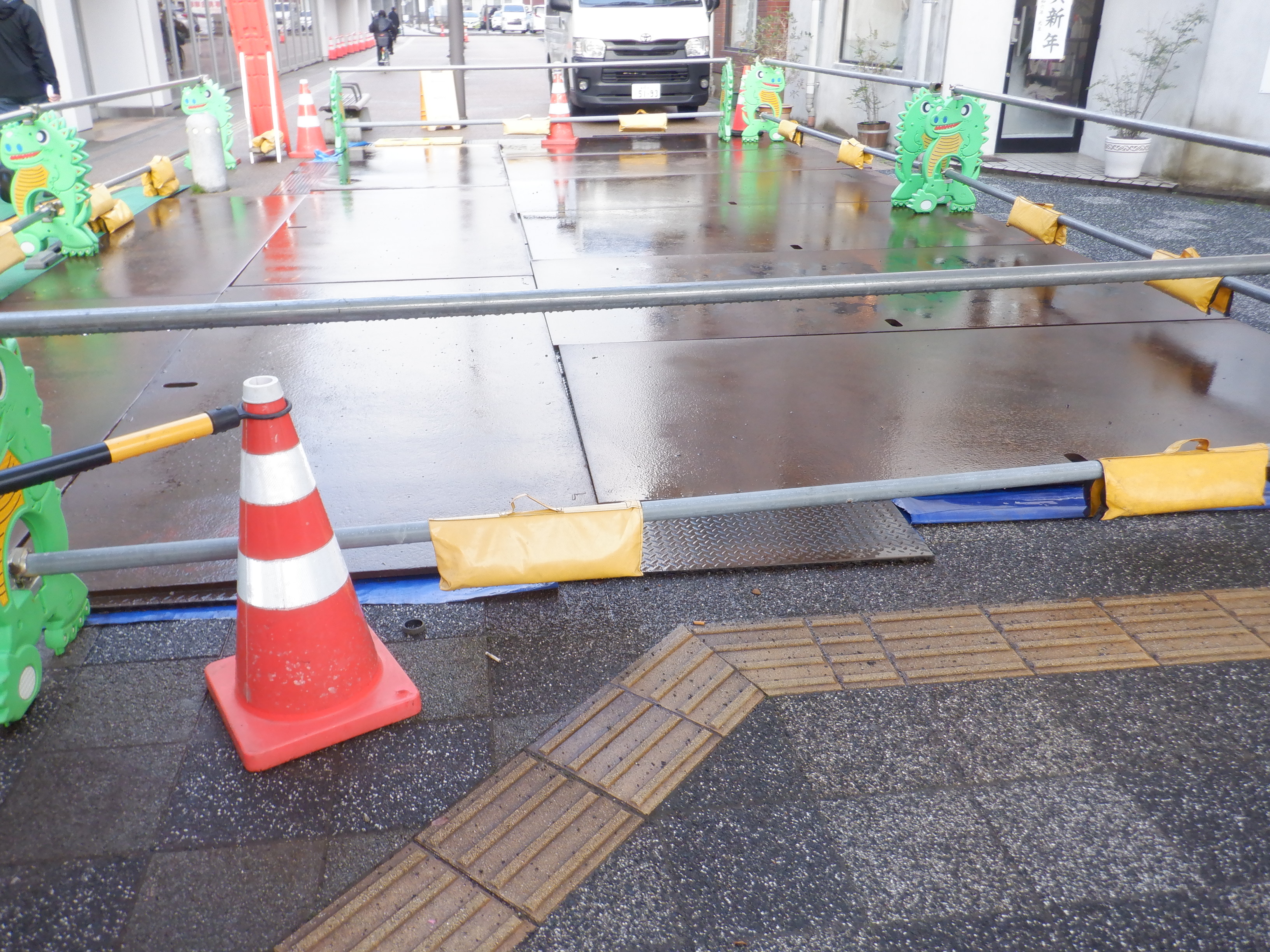 年末年始の様子に近い状態です。両側の恐竜ロボット等や屋台村などの工事が進んでいます。