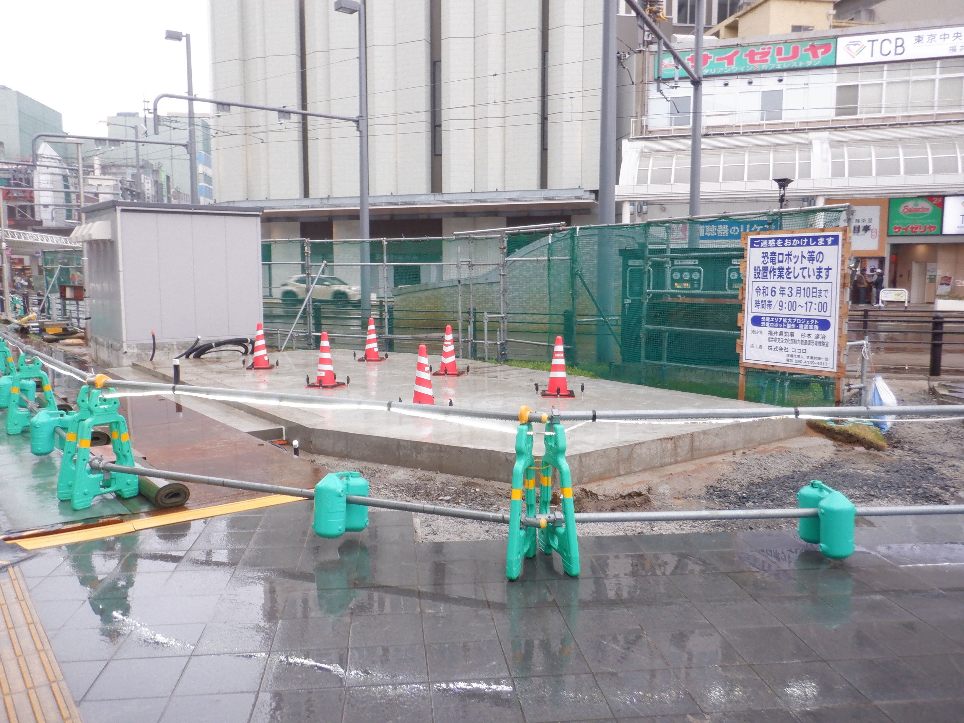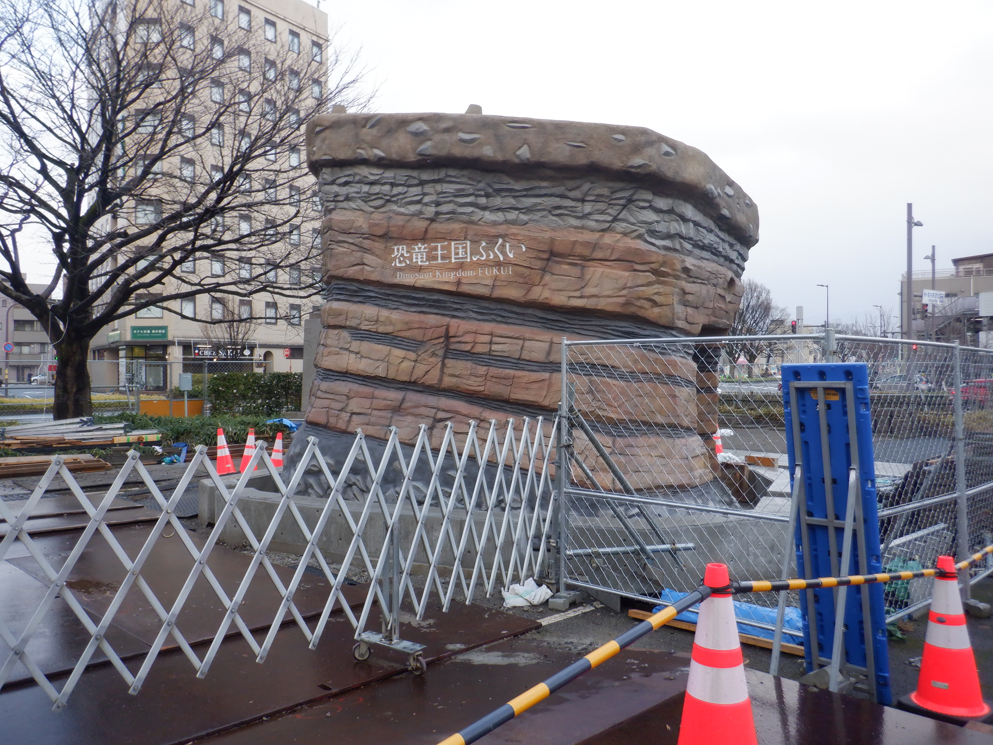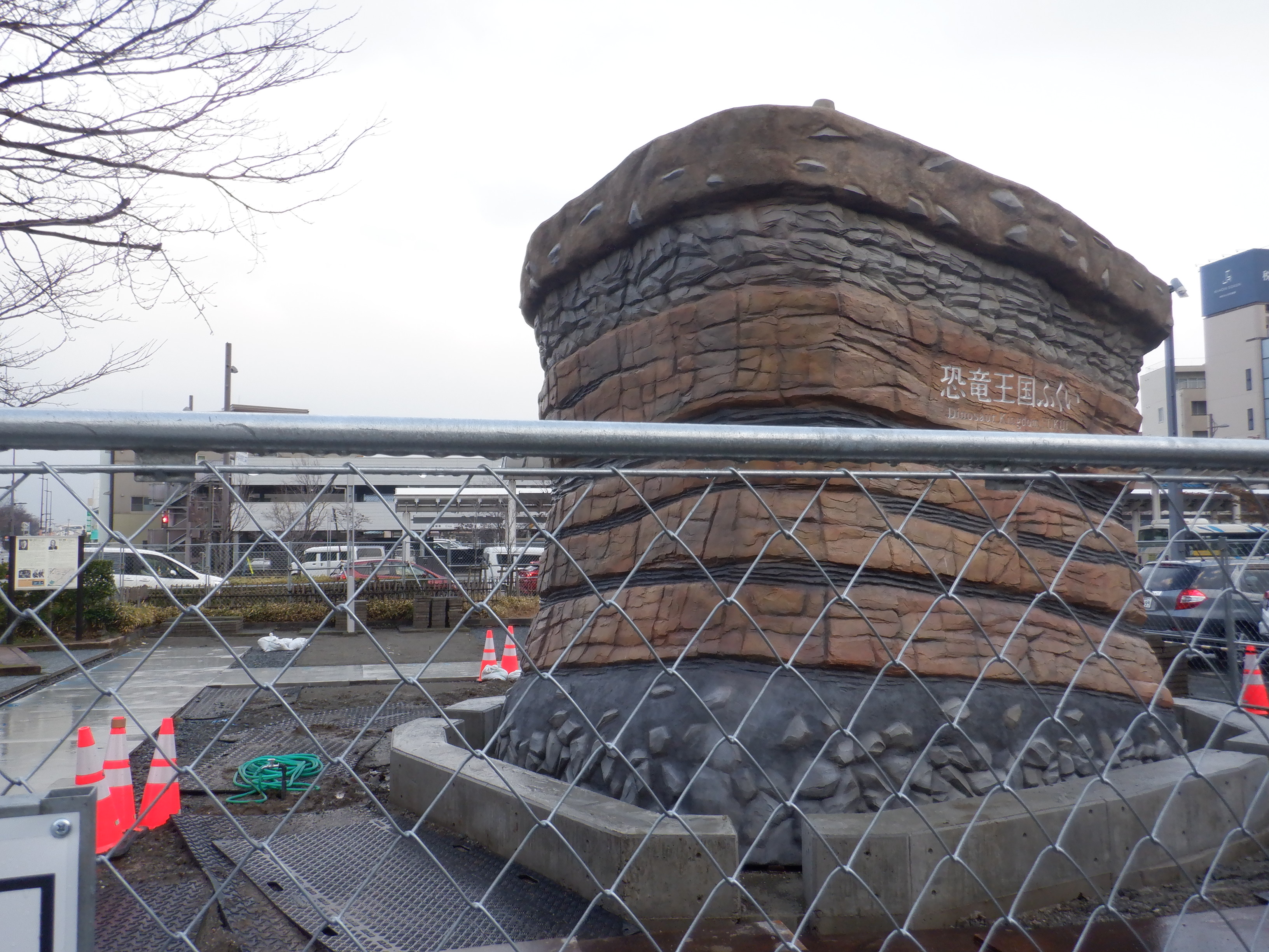 東口の駅前広場の恐竜設備を作っているところ。