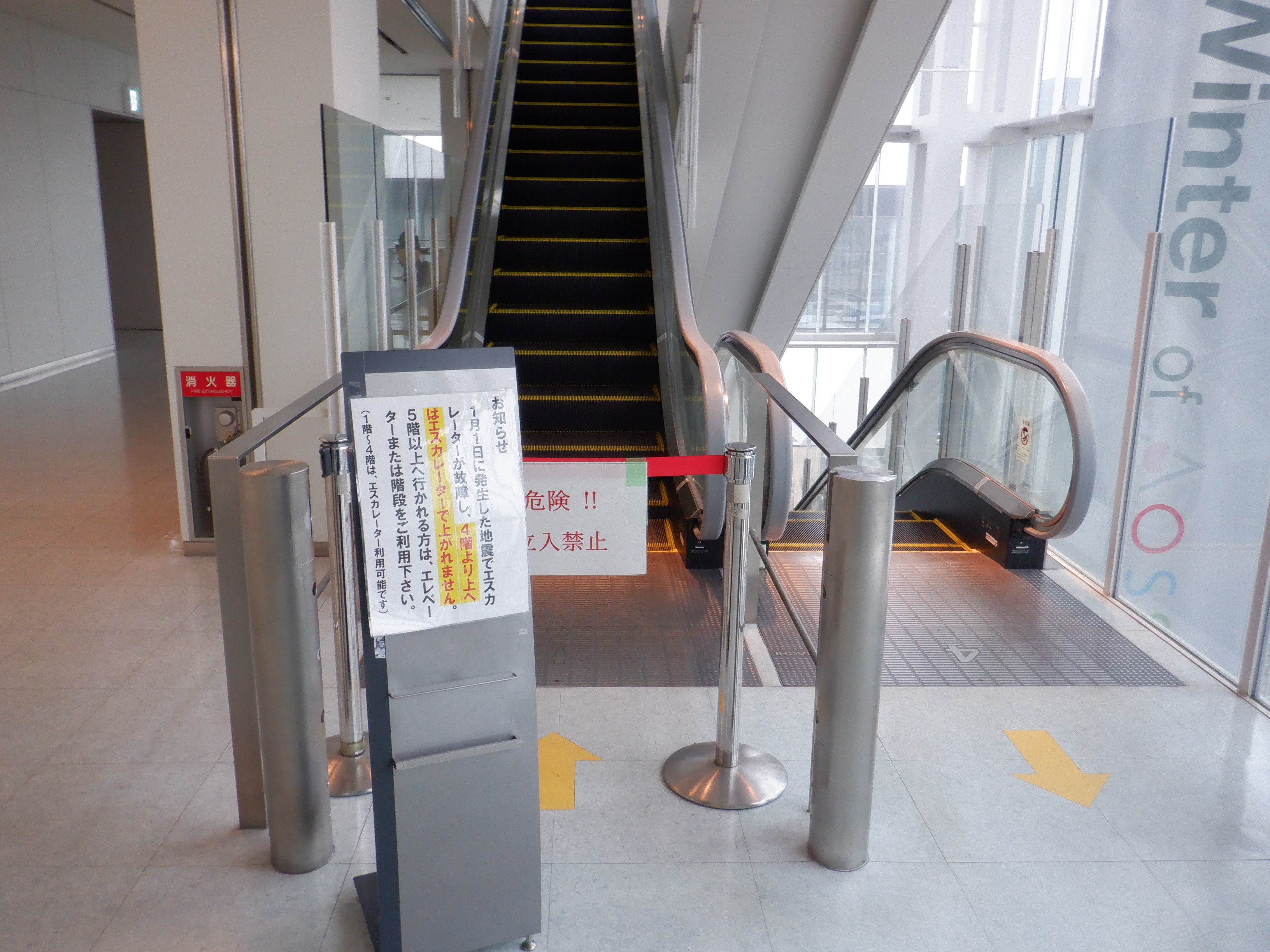 能登半島地震の影響により、アオッサのエスカレーターが故障し、エスカレーターでは3階までしか上がることができなくなりました。