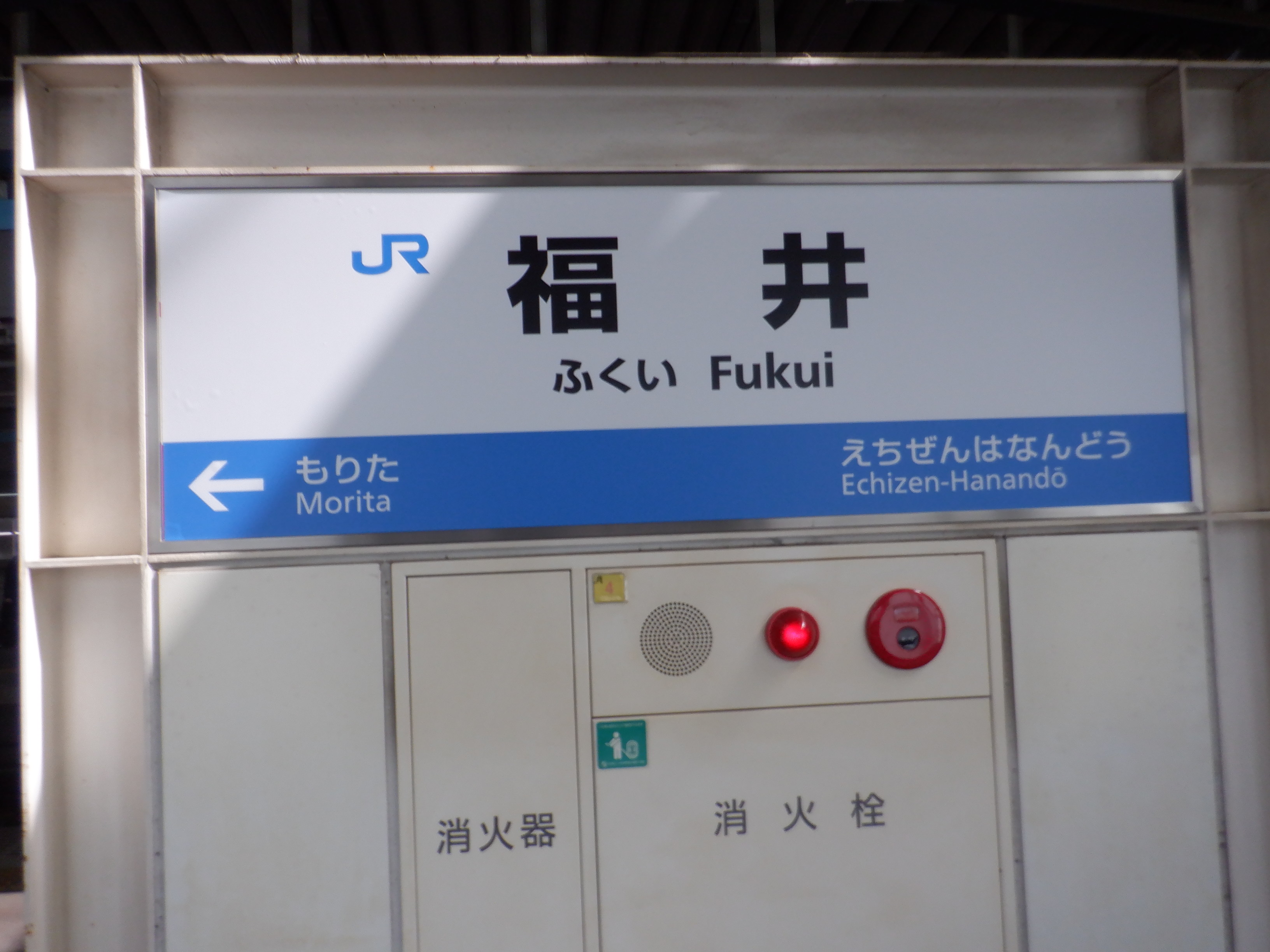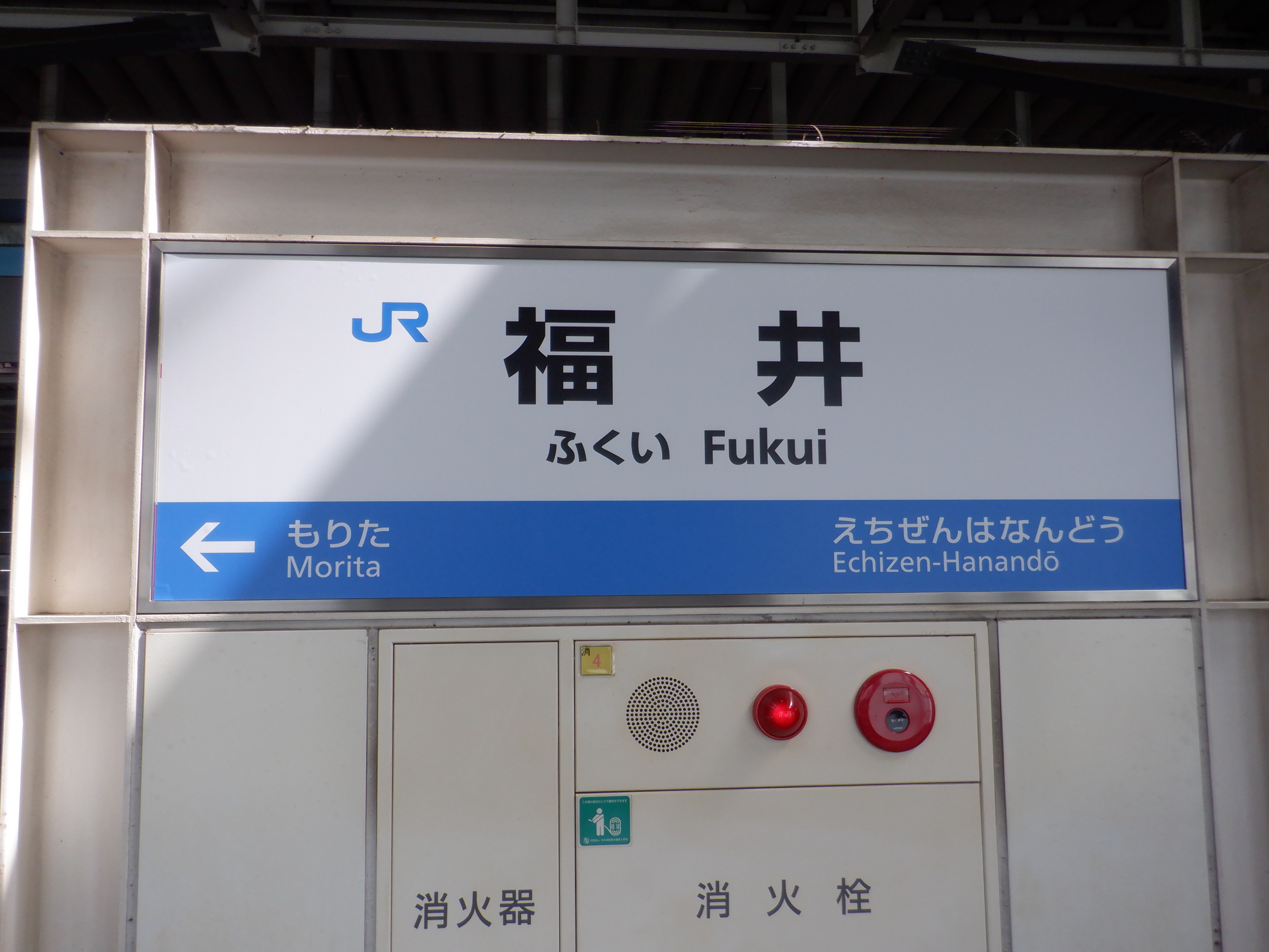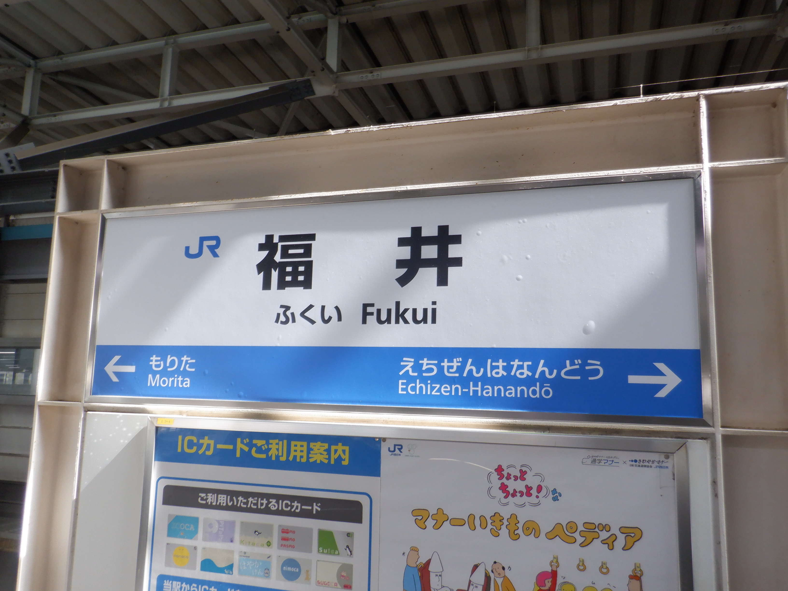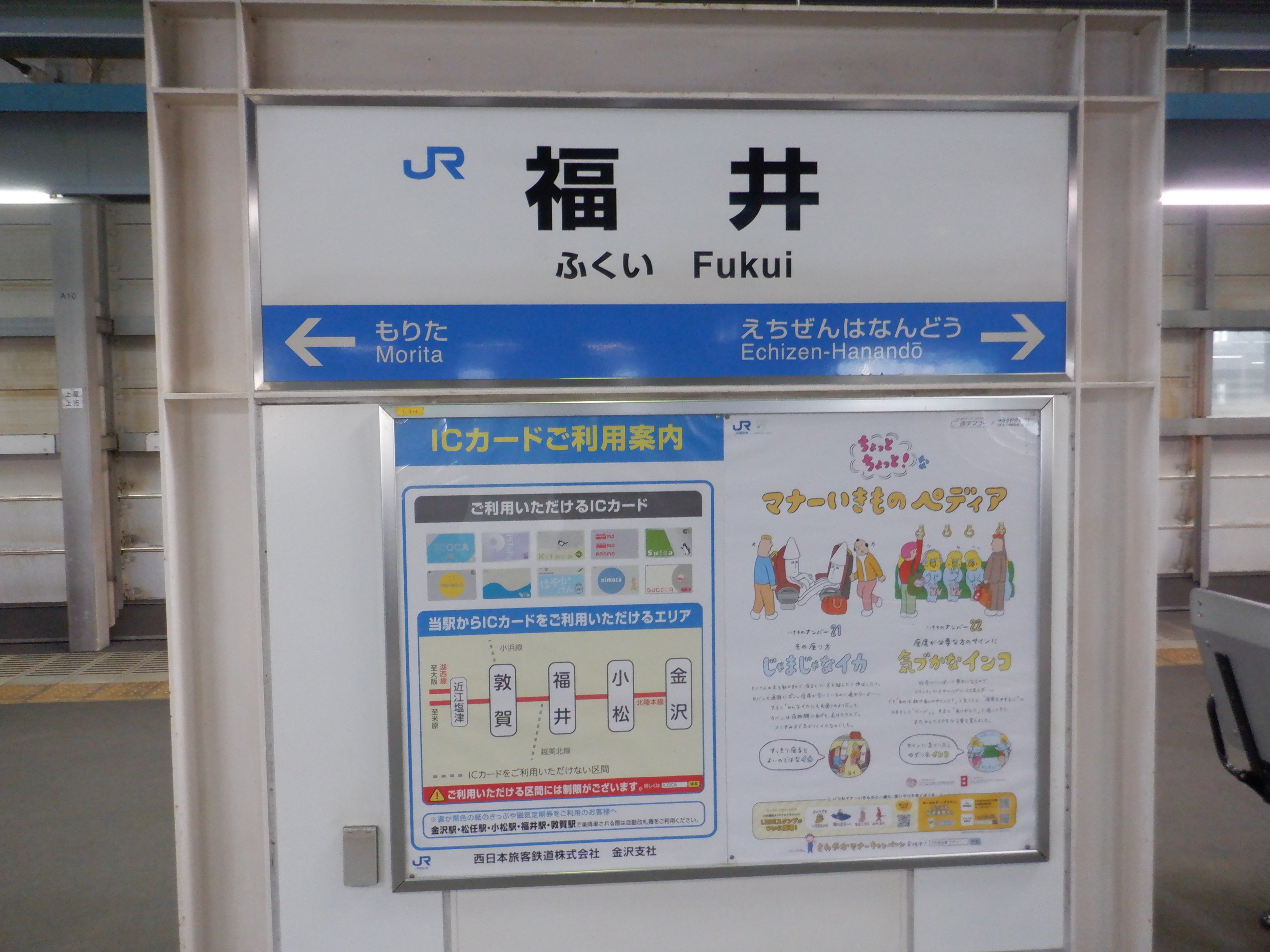 駅名標の様子。ハピラインふくいの駅名標の上にJRの駅名標が貼られているようです。