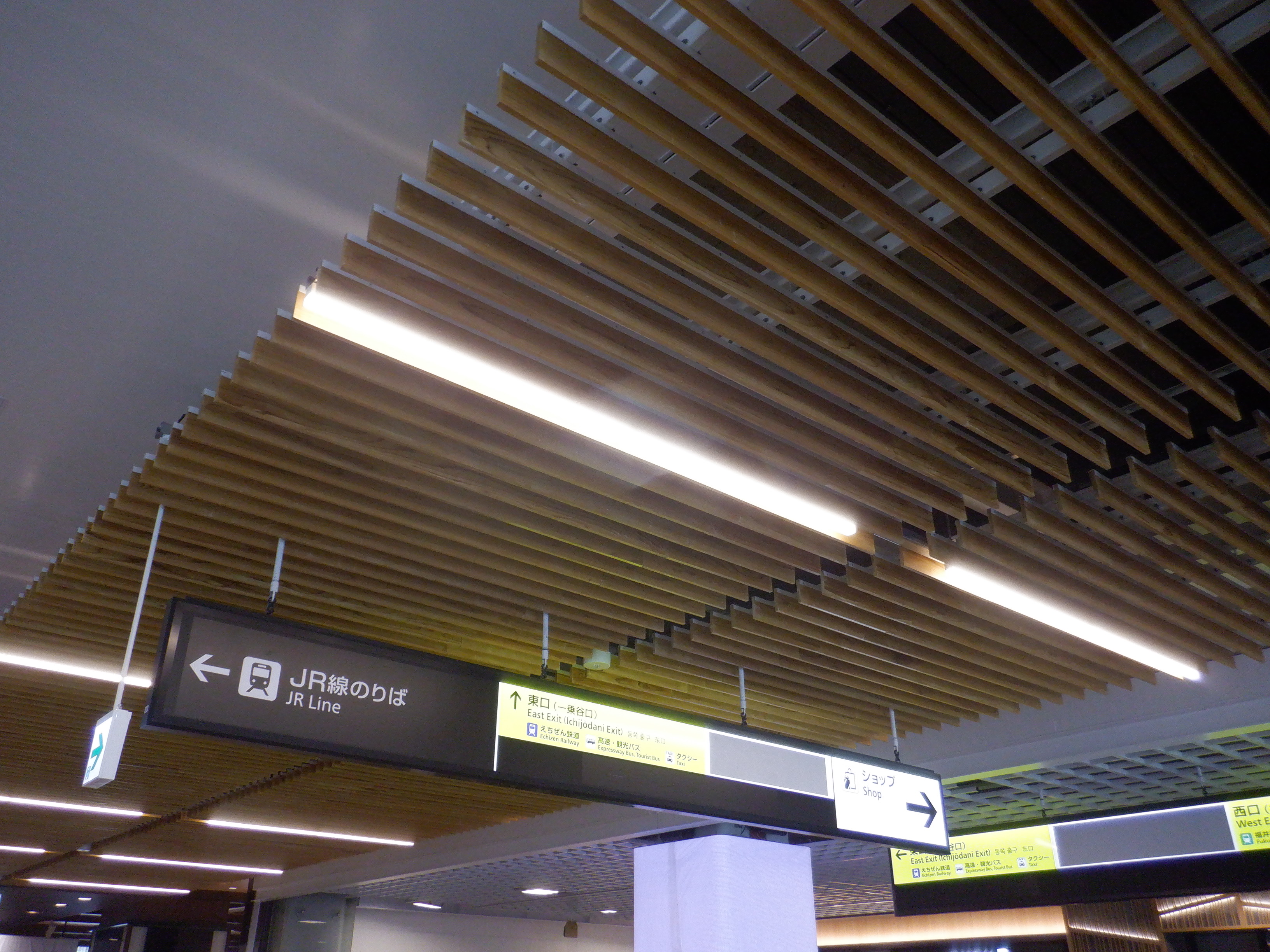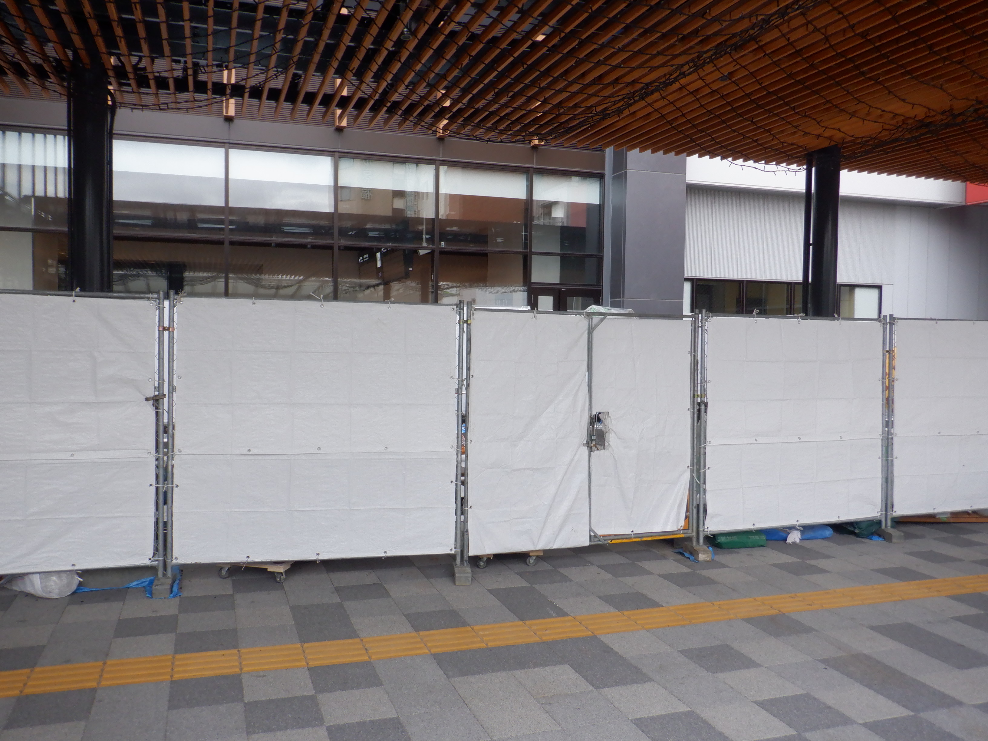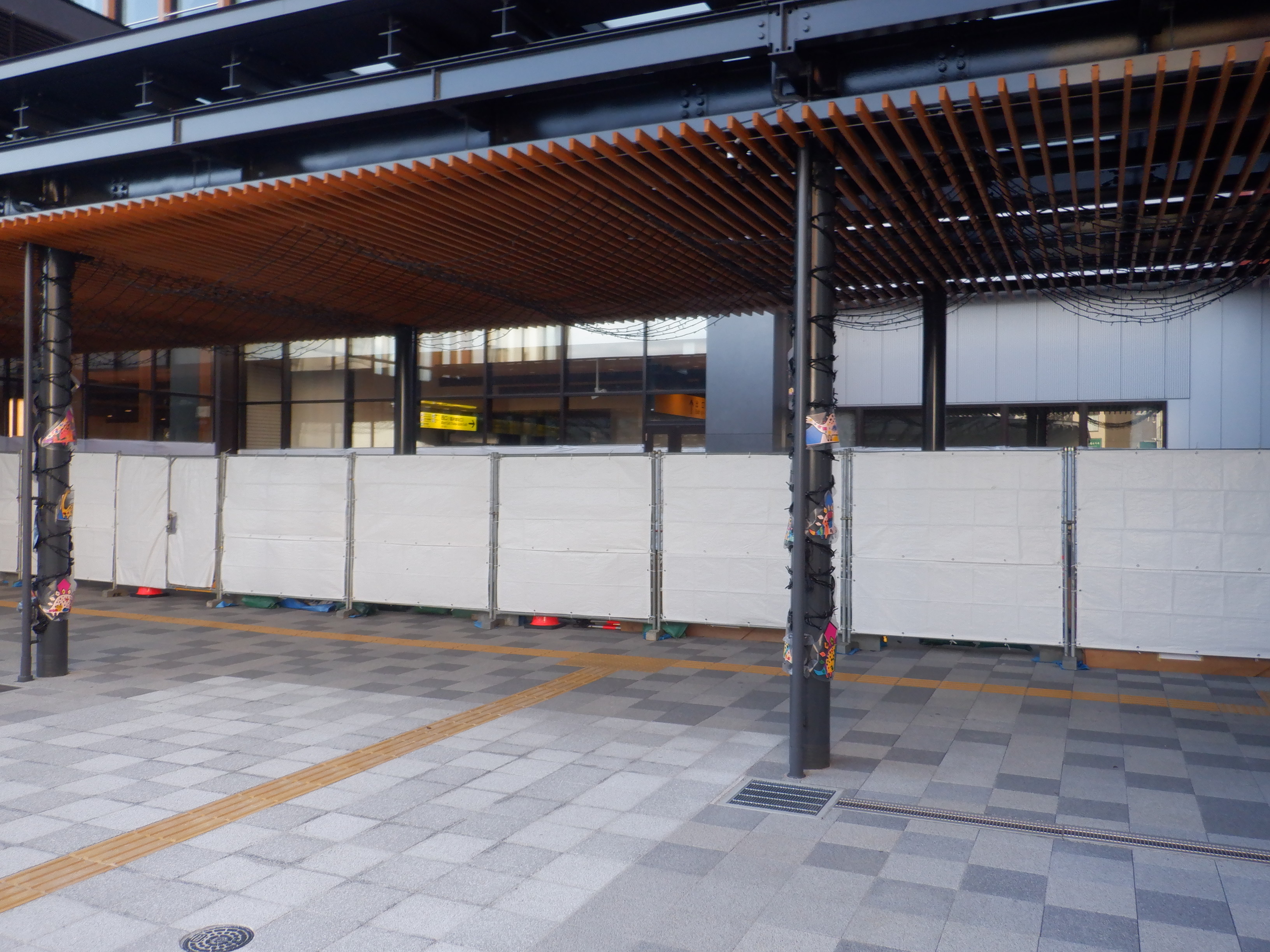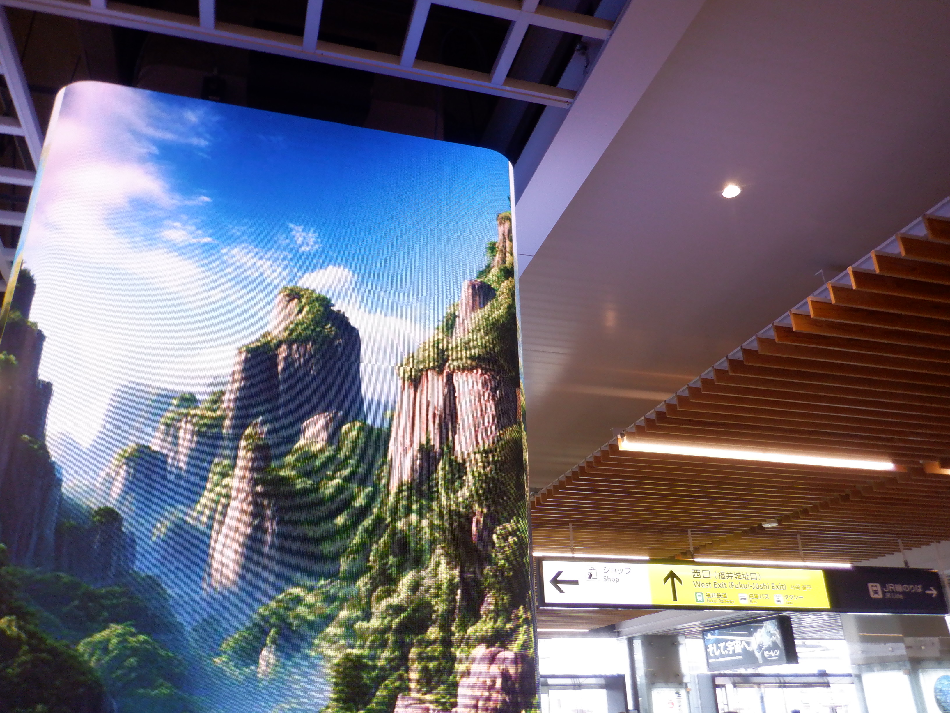 改札口の前の囲いがなくなり、元の広い場所が戻りました。柱が何かに包まれています。北陸発の大型柱巻LEDビジョンが設置されました。