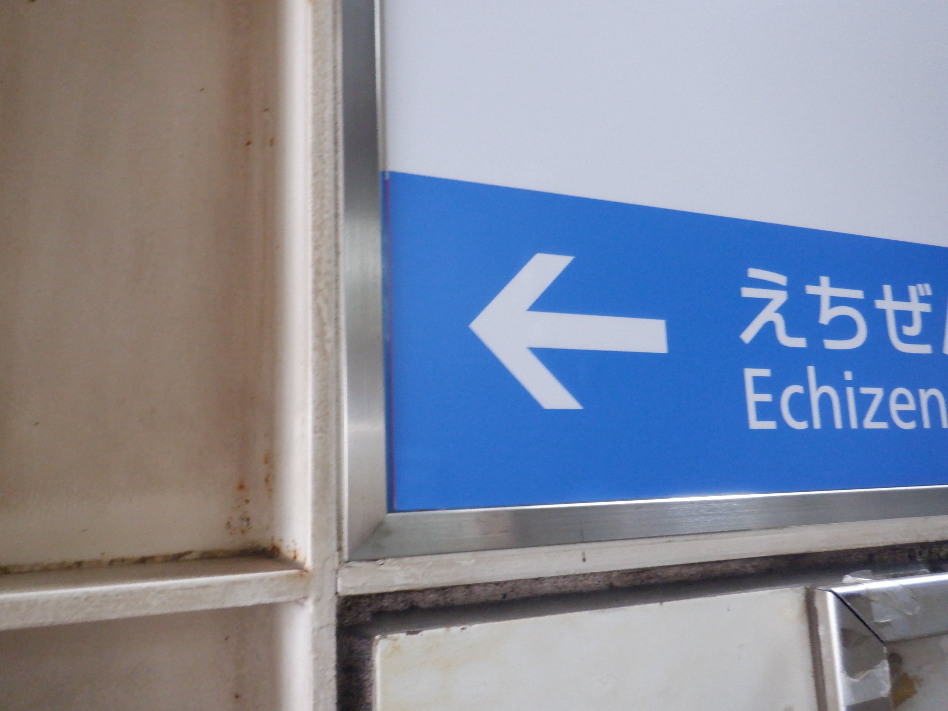 1番のりばの越前花堂駅側と2番のりばの駅名標から。