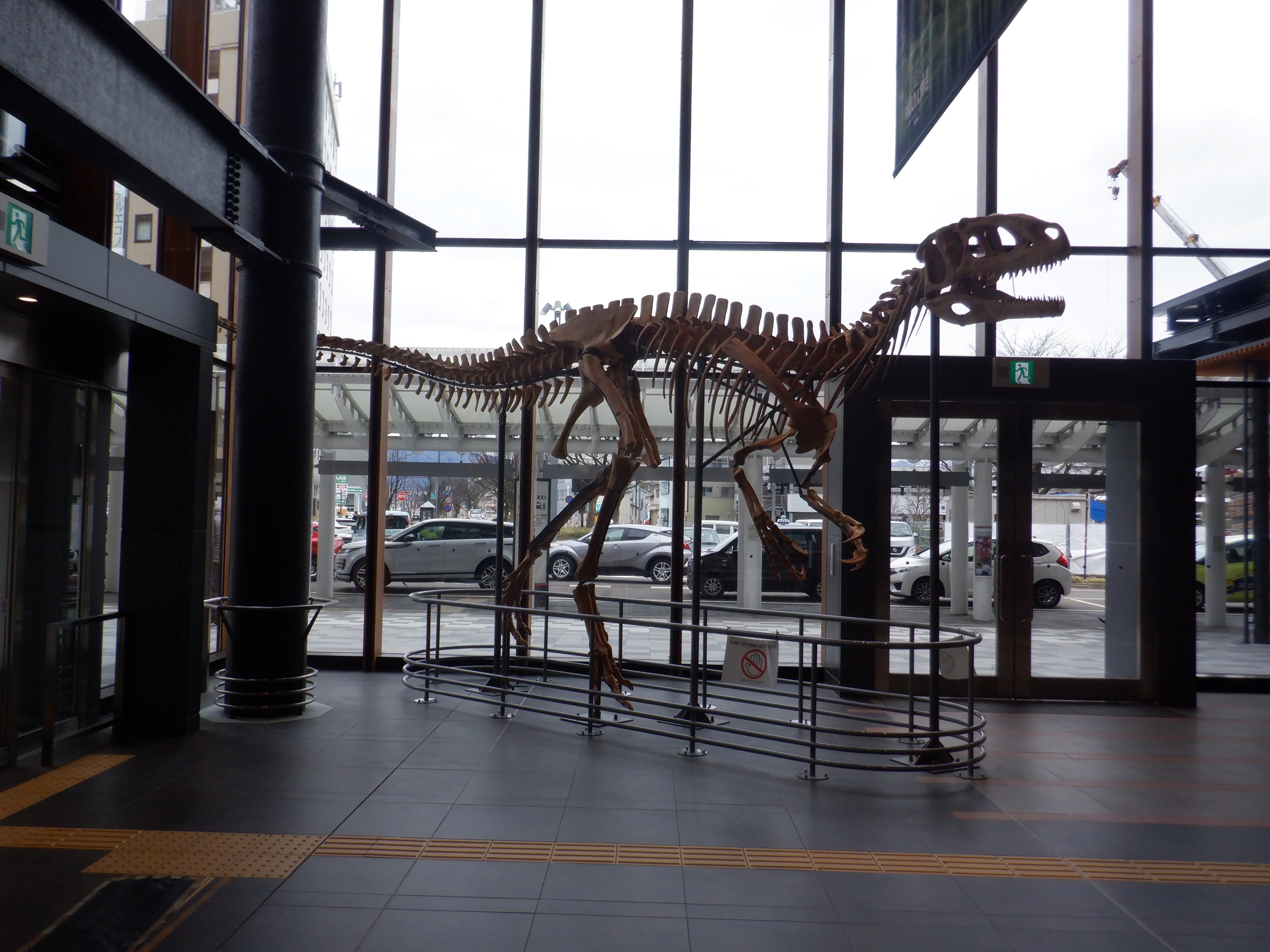拡張施設の出入口付近に置かれた恐竜の骨格。