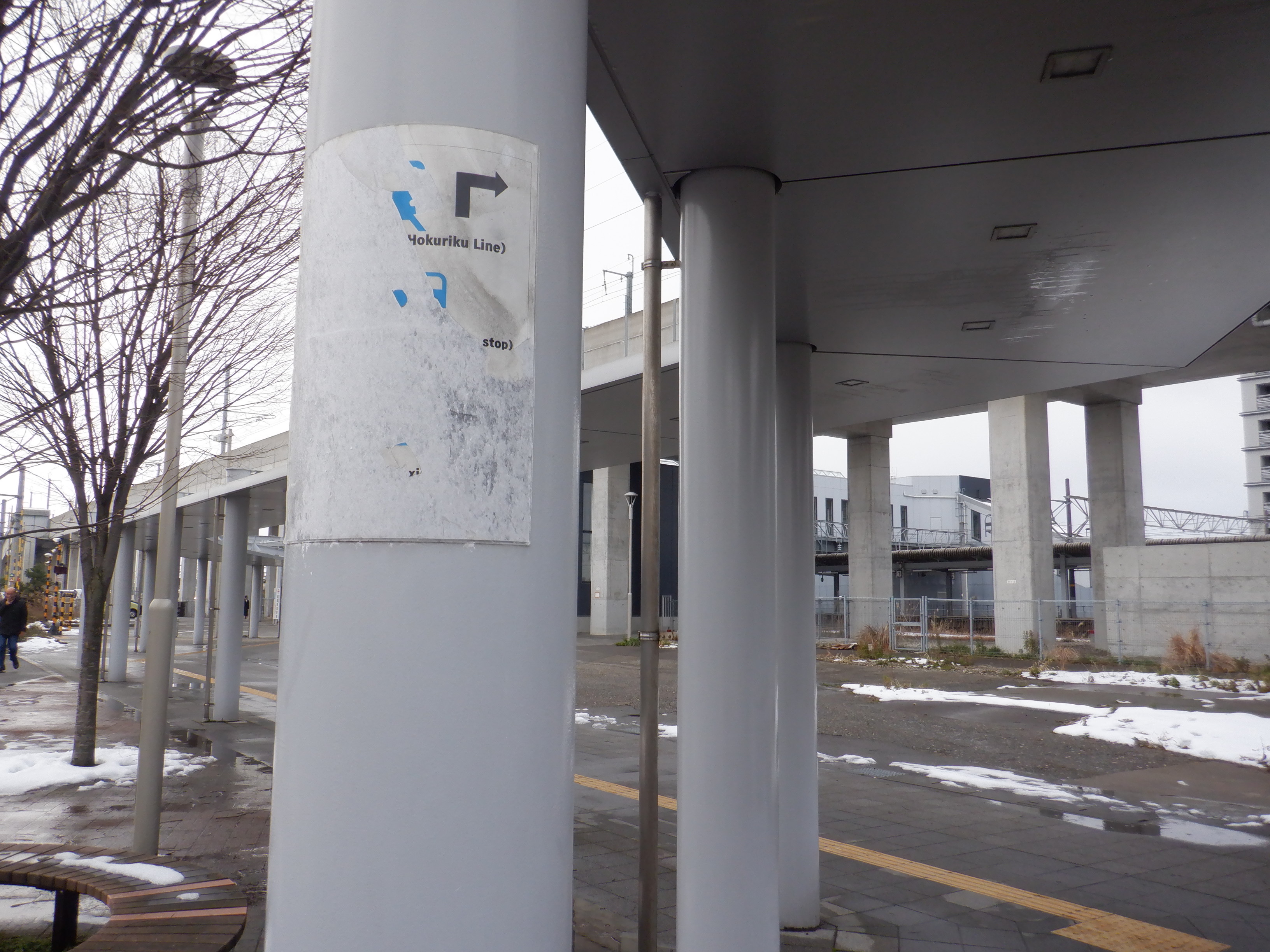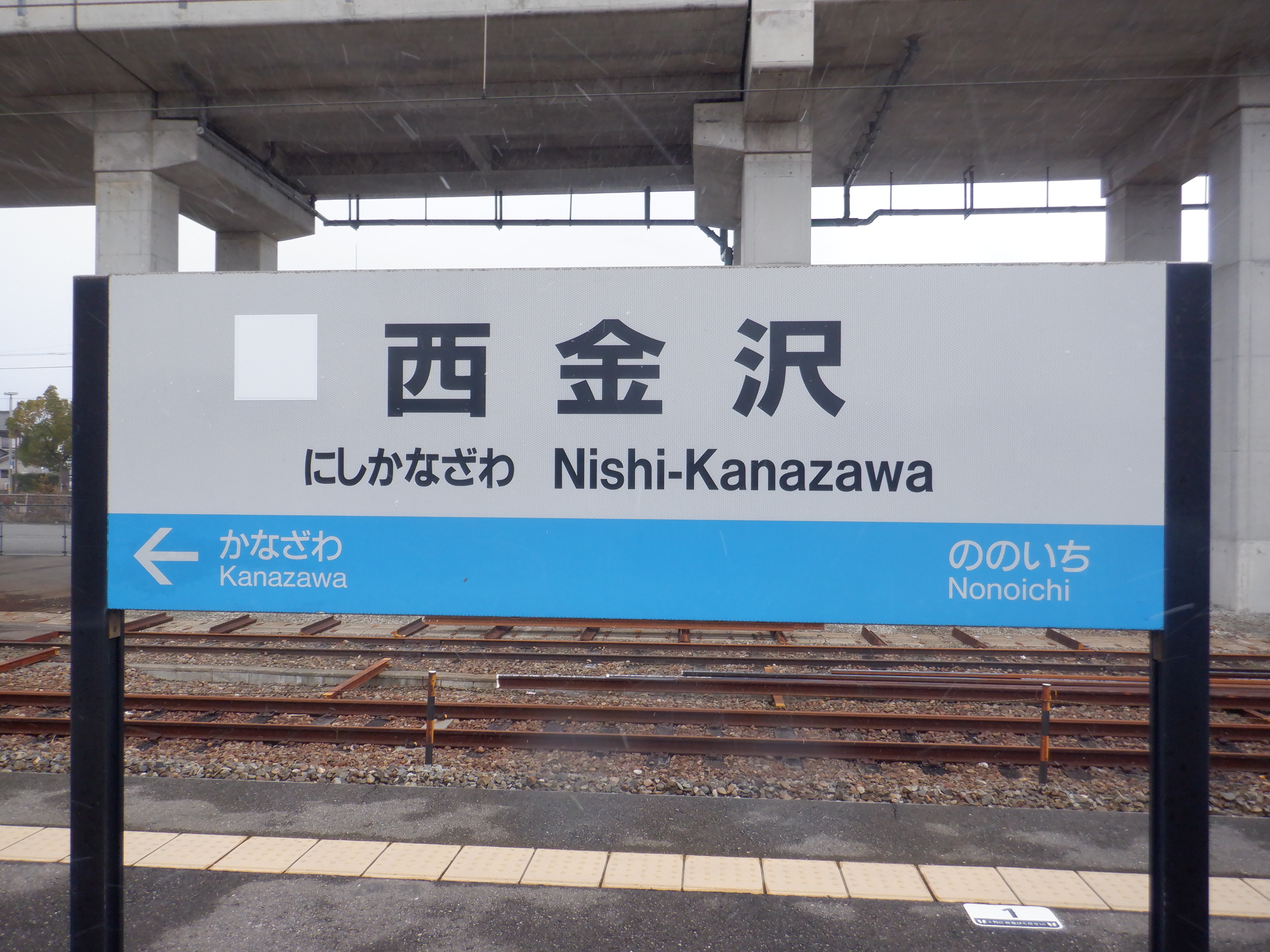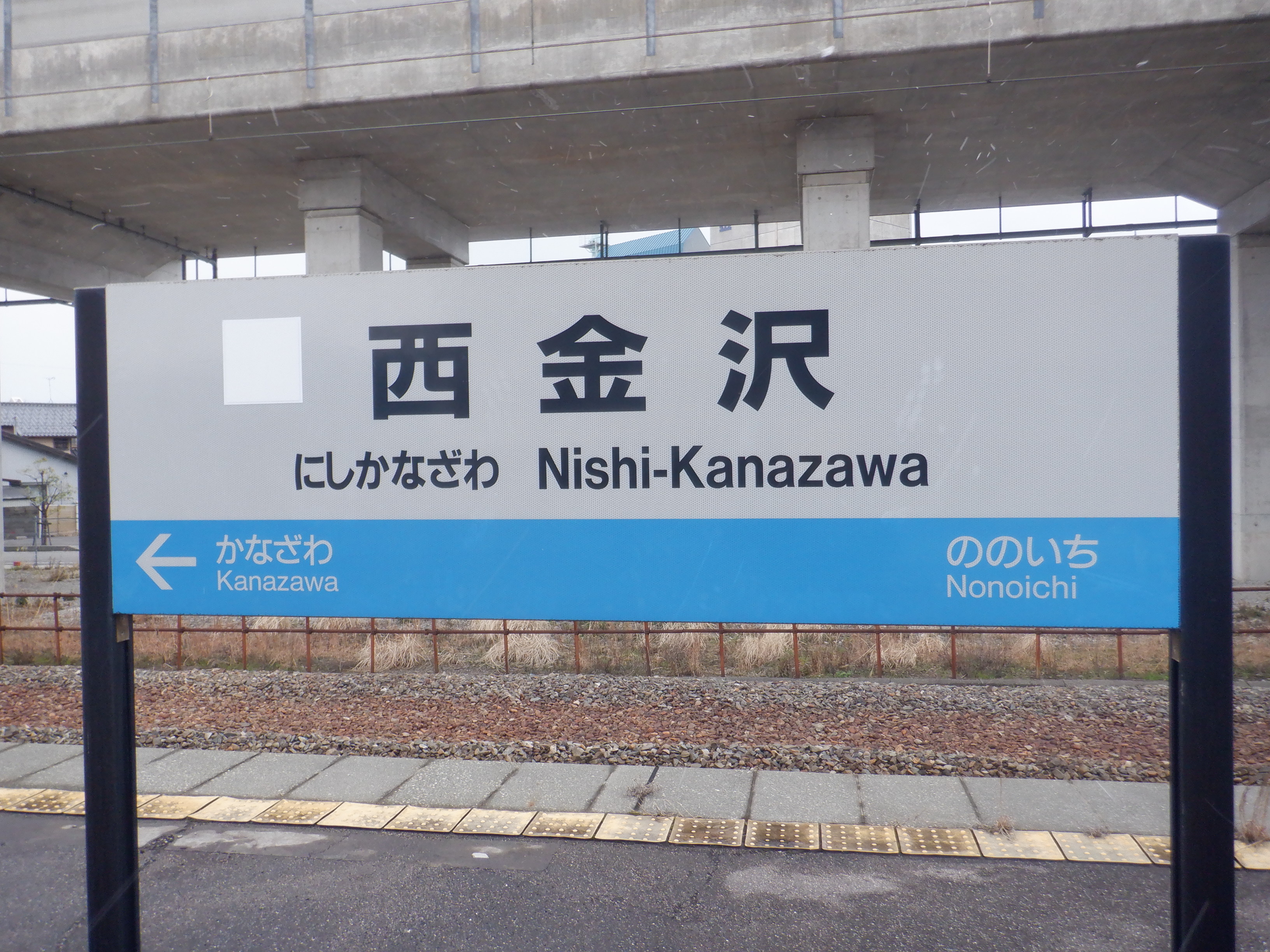 野々市駅側の駅名標。よく見るとシールの部分が二重に貼られています。