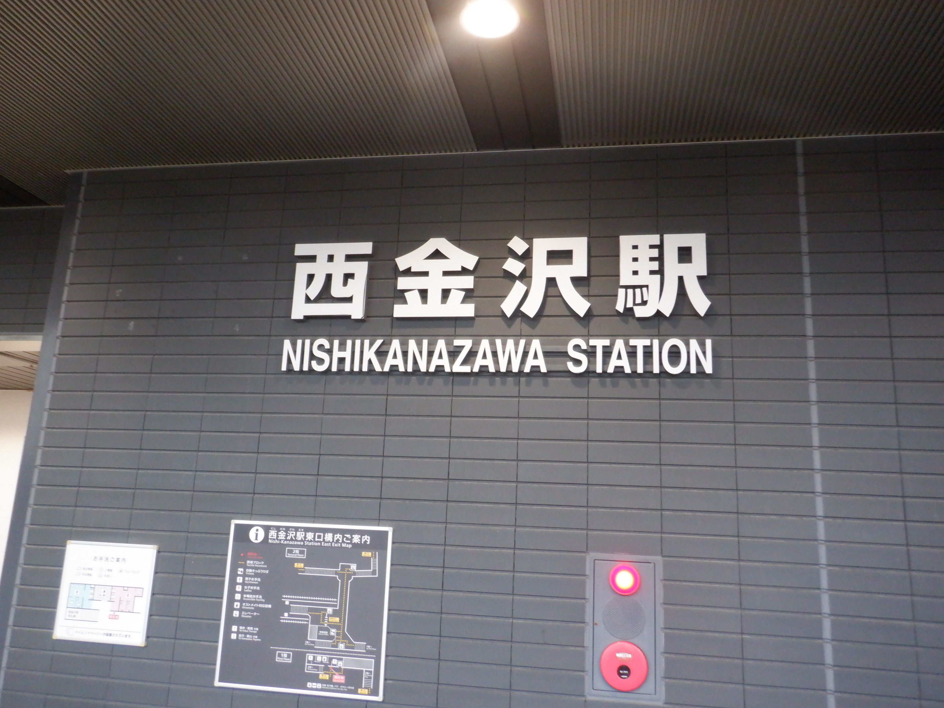 改札を出たところの新西金沢駅への案内。北鉄のカラーが使われています。