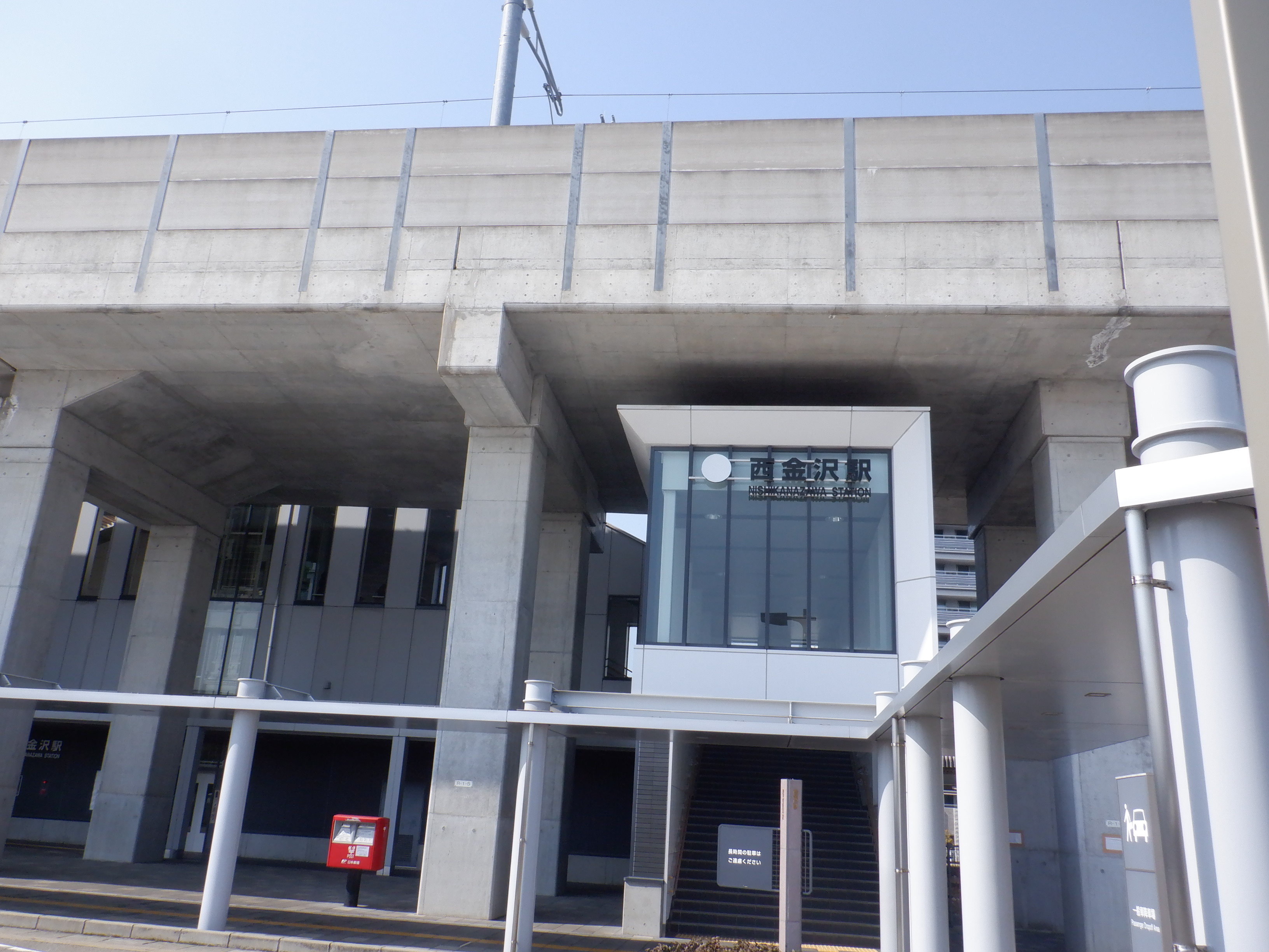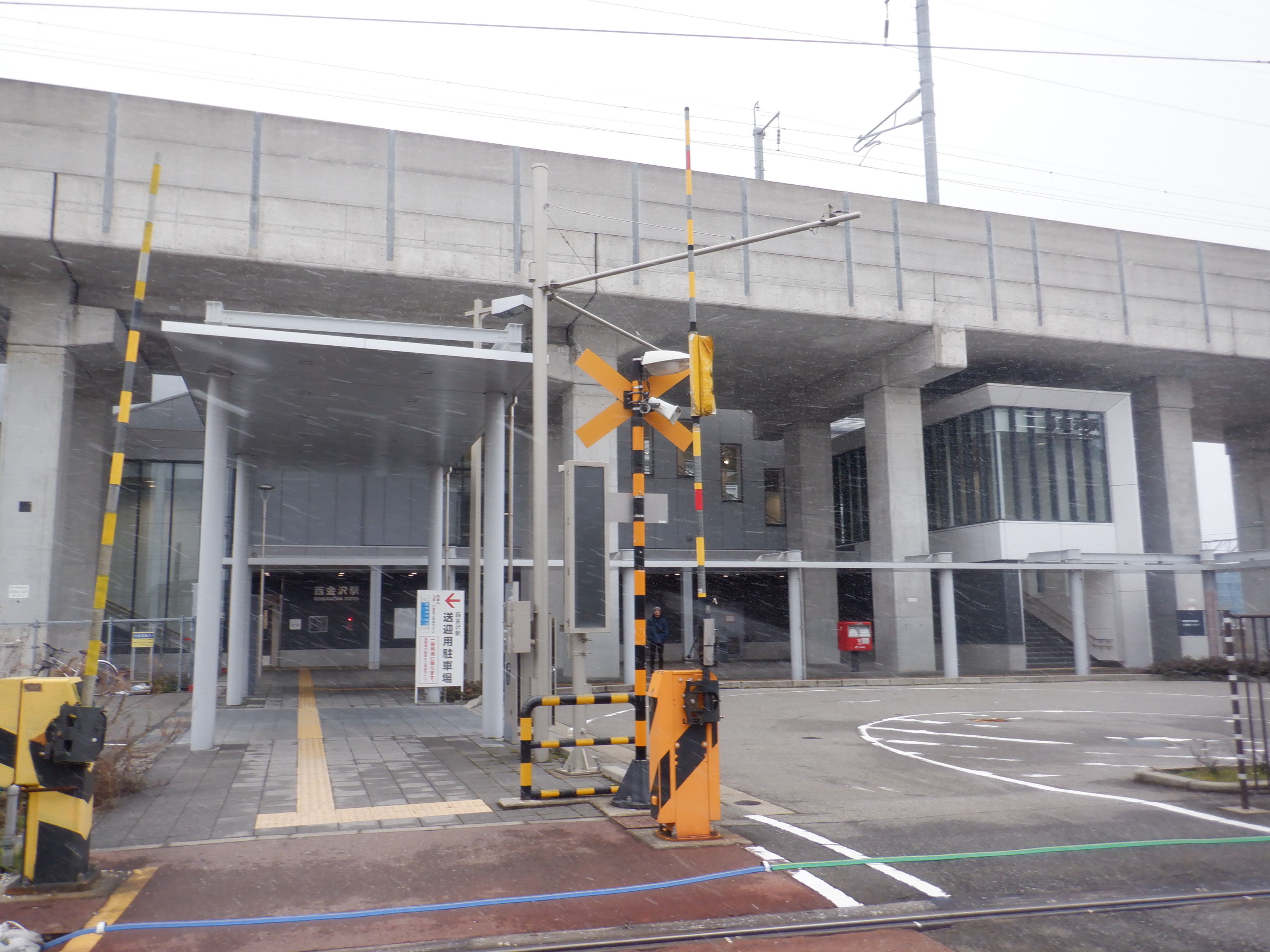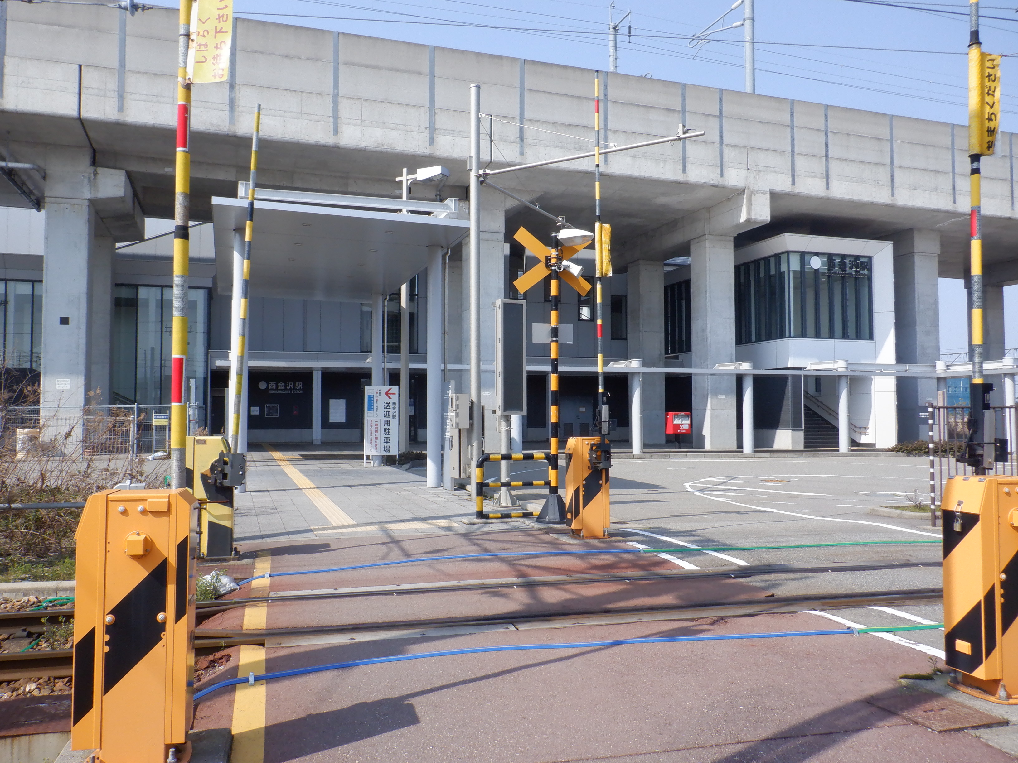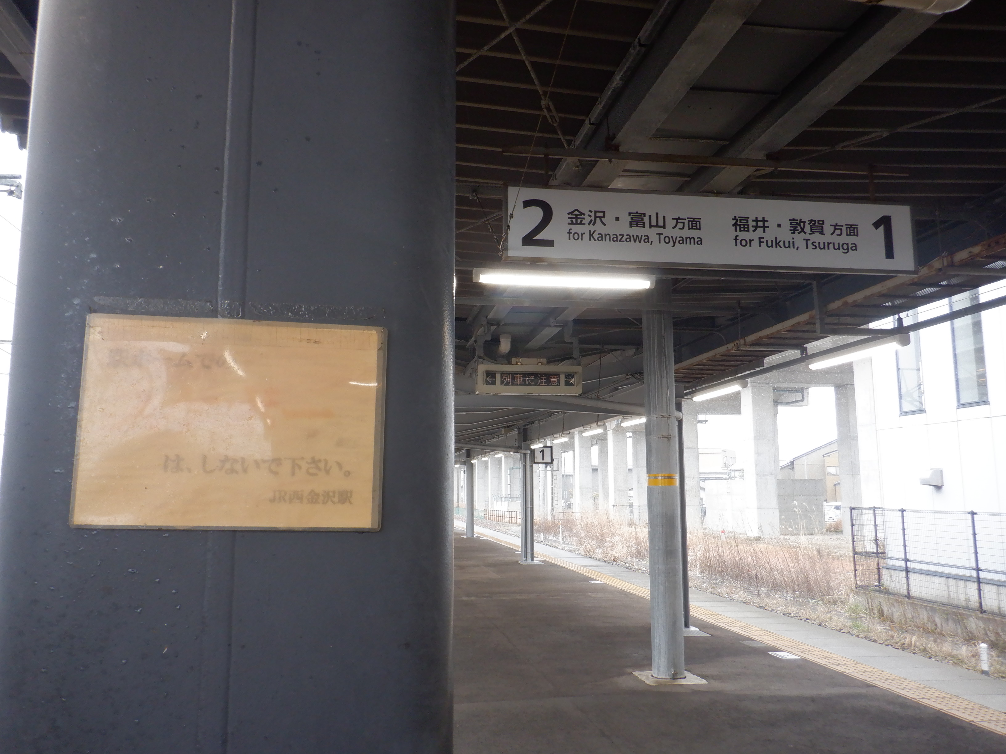 階段付近のJR西金沢駅と書かれた注意書き、スケボー禁止の表示はこの時点で残っています。