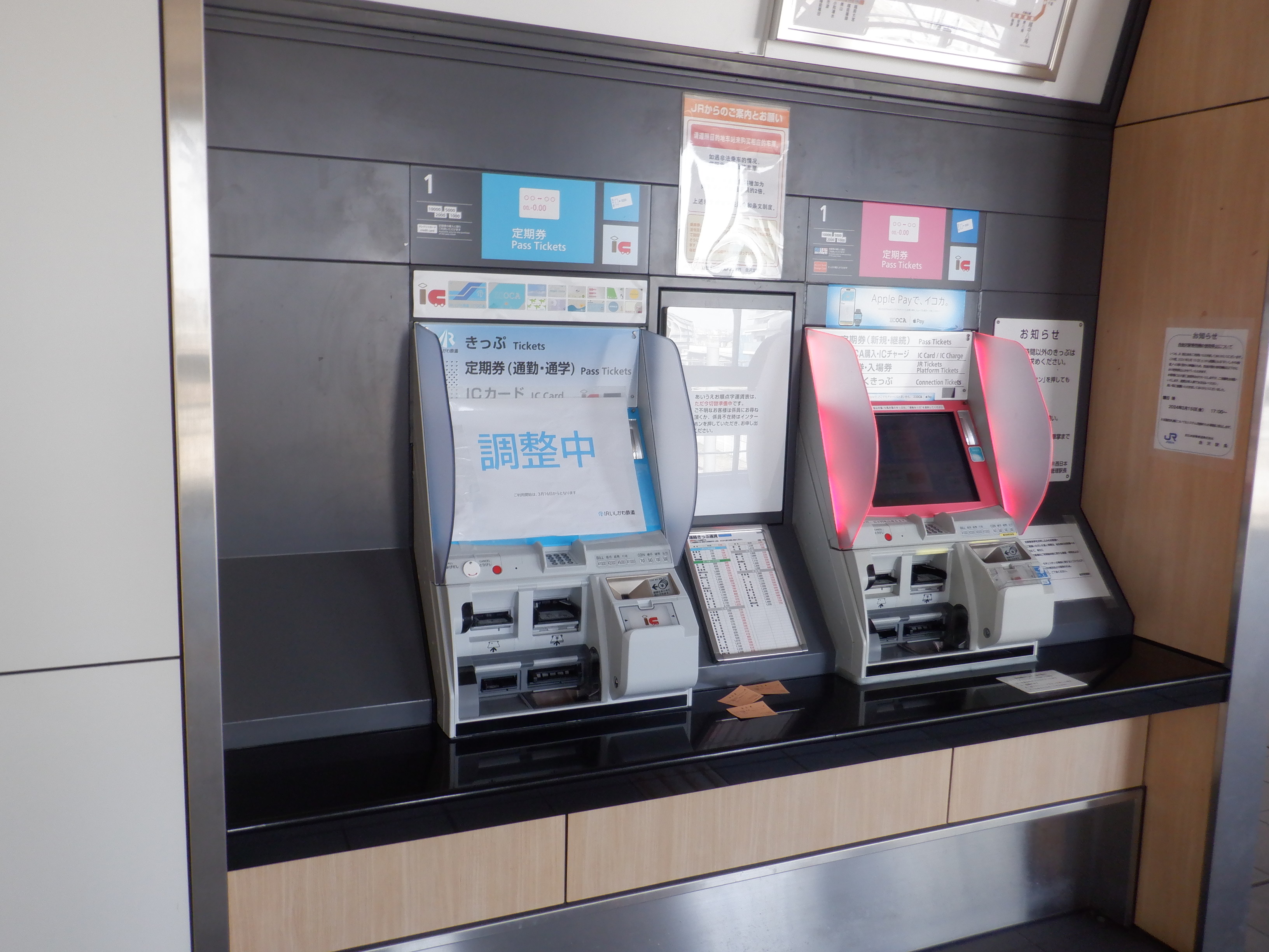 移管前日の様子で、移管前1週間の間に両側の第一種駅名標のIRロゴが付けられたようです。また、券売機もカバーが取られていました。