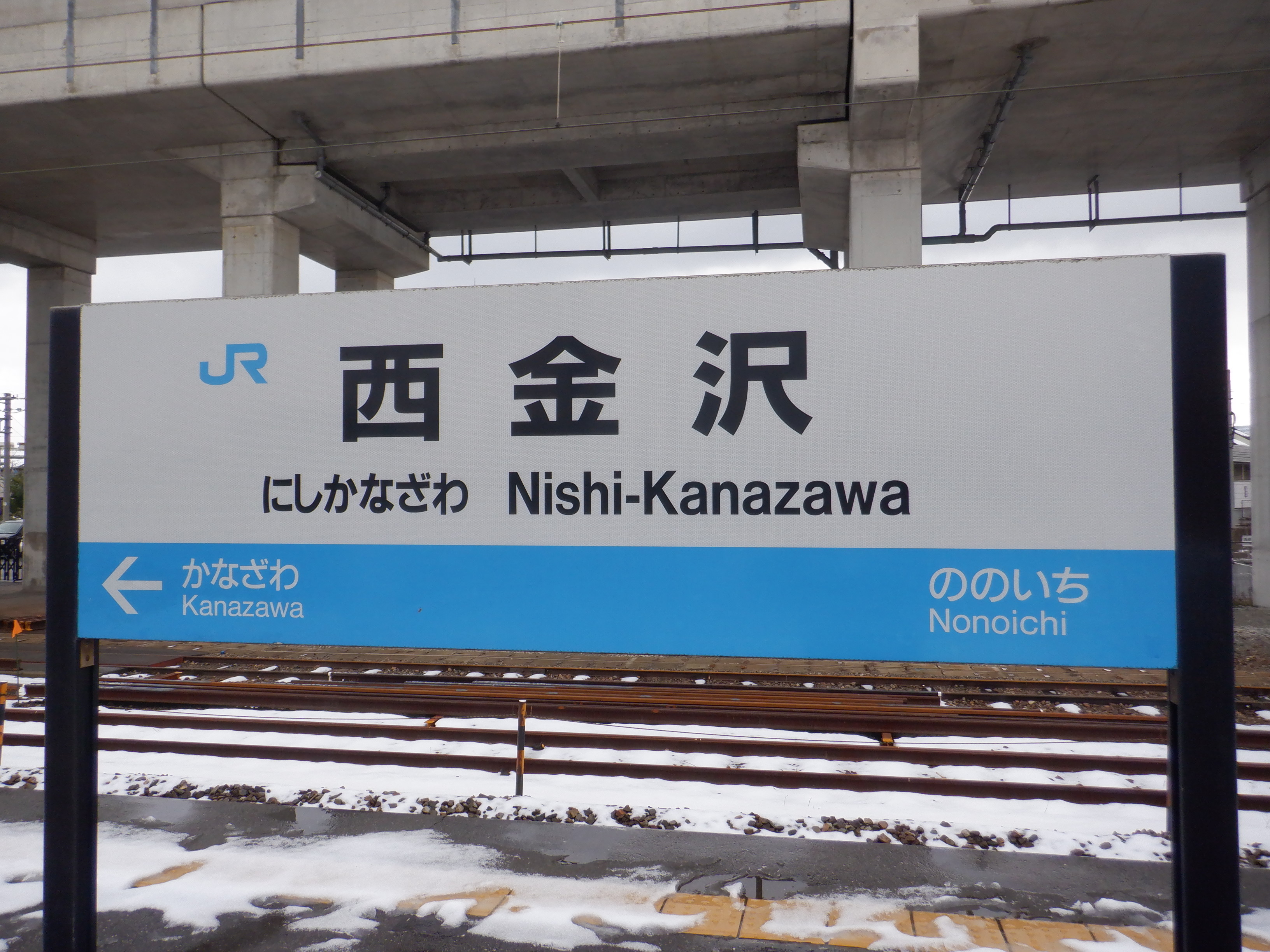 金沢駅側の駅名標。JRロゴの部分にシールが貼られています。