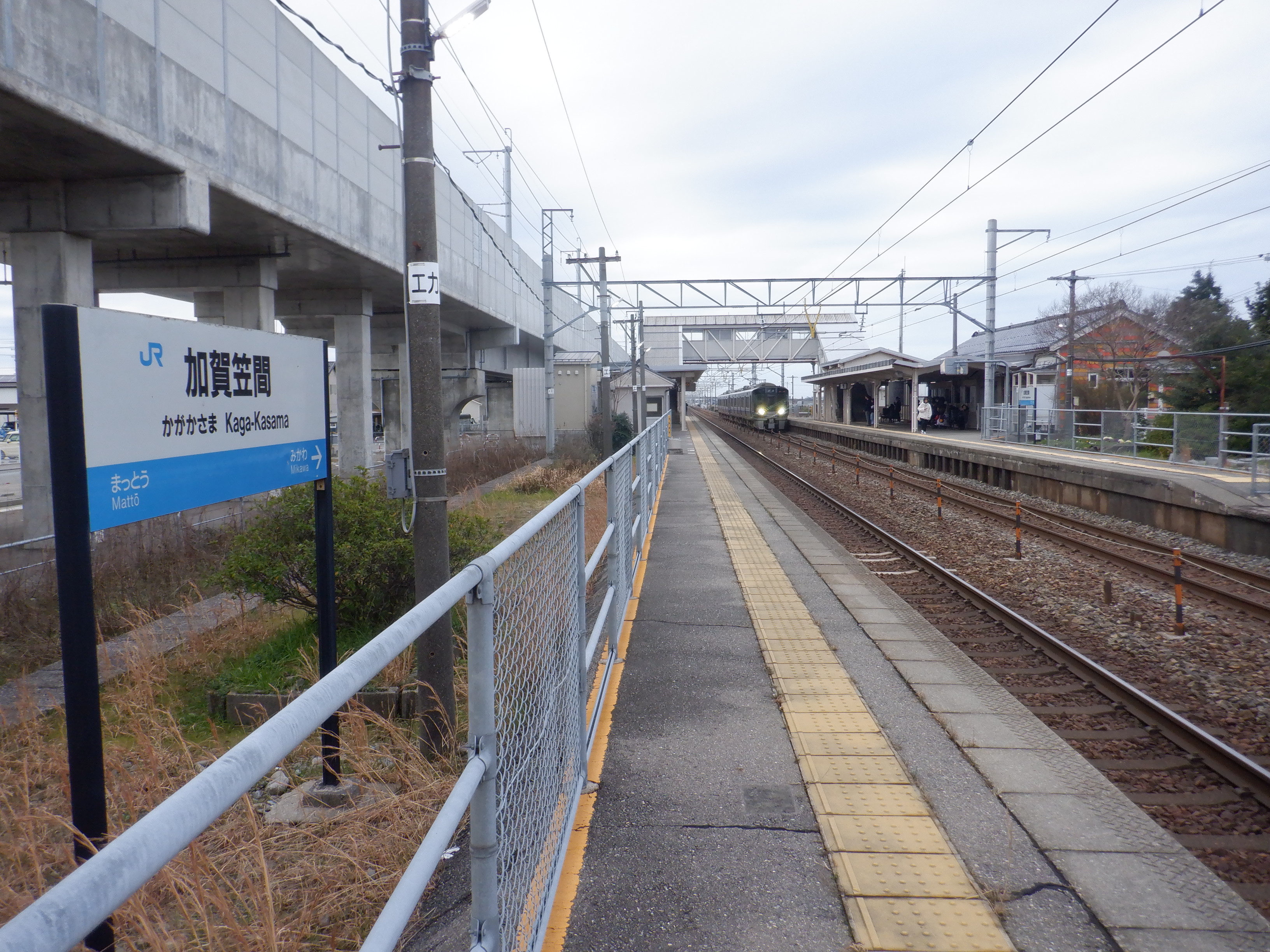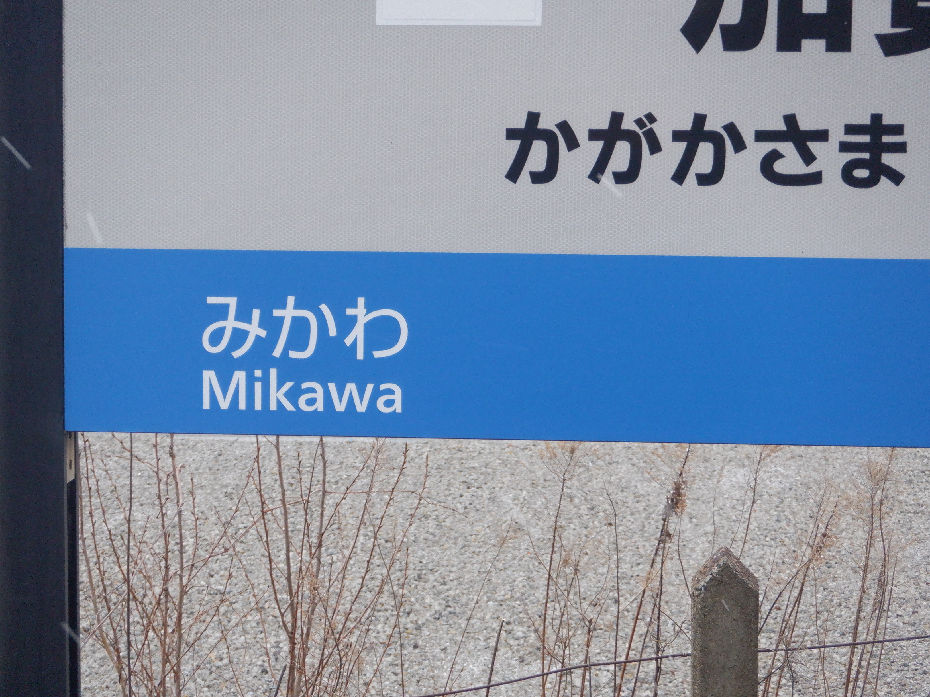 2番のりば美川駅側の駅名標。JRロゴの部分が隠されています。松任駅の表示についてはこの時点でよく分かりません。