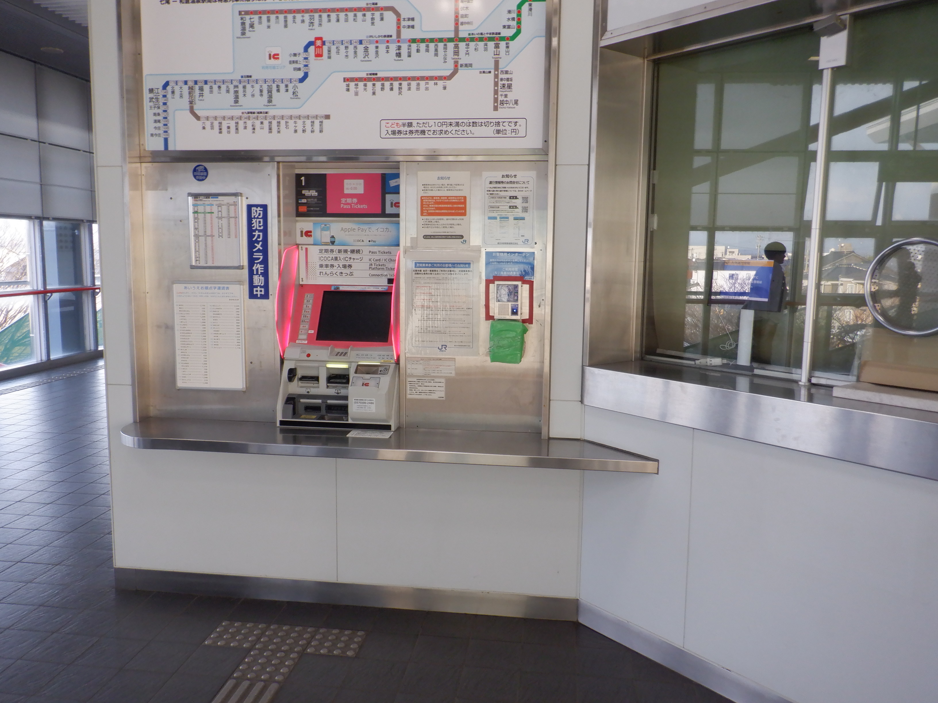 窓口が閉鎖されていました。また、同じ日に西金沢・松任駅などの第一種駅名標のJRマークが撤去されていましたが、この駅は残っていました。