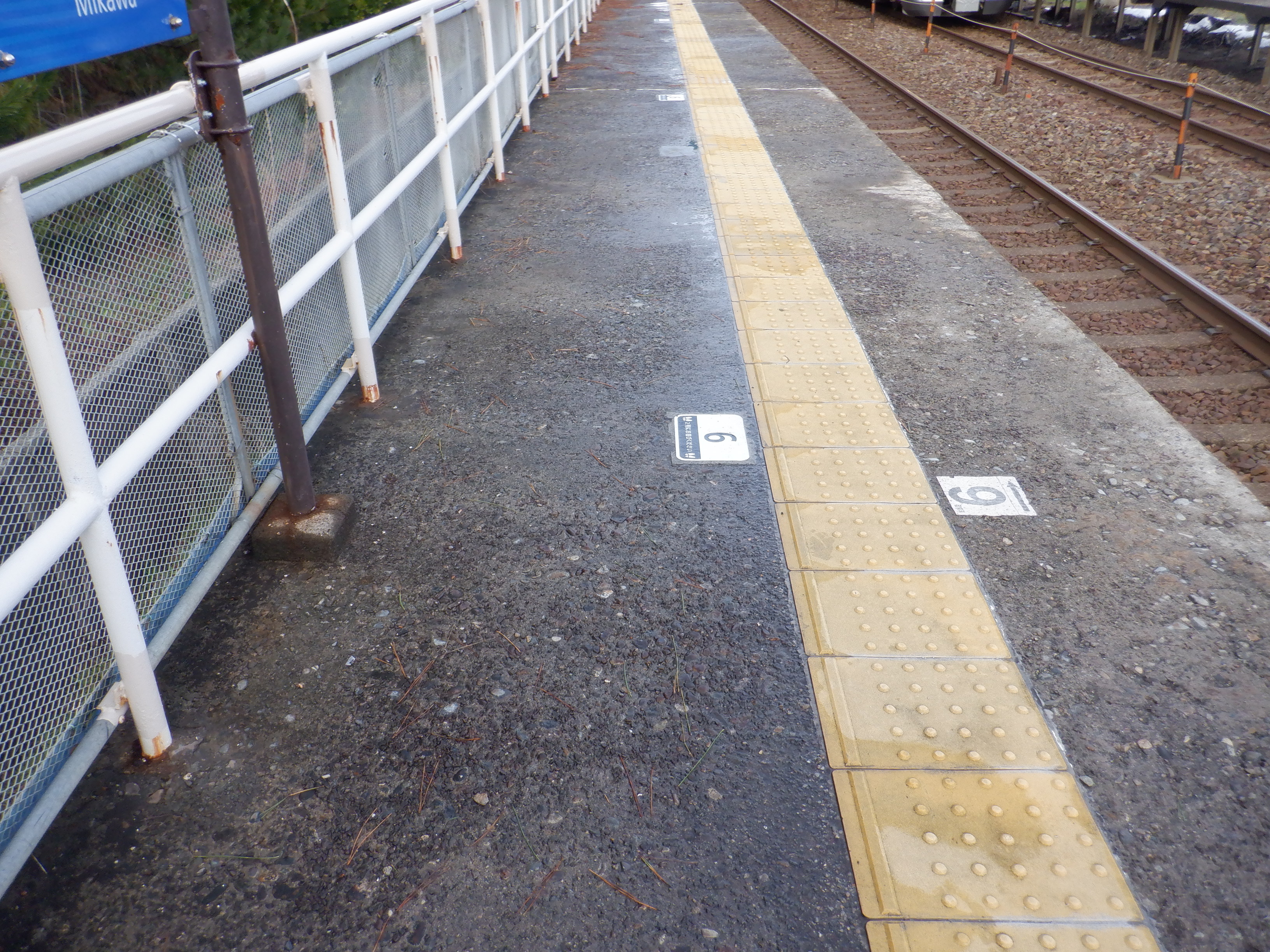 2番のりば能美根上駅側の乗車位置案内6と6両編成最後尾。