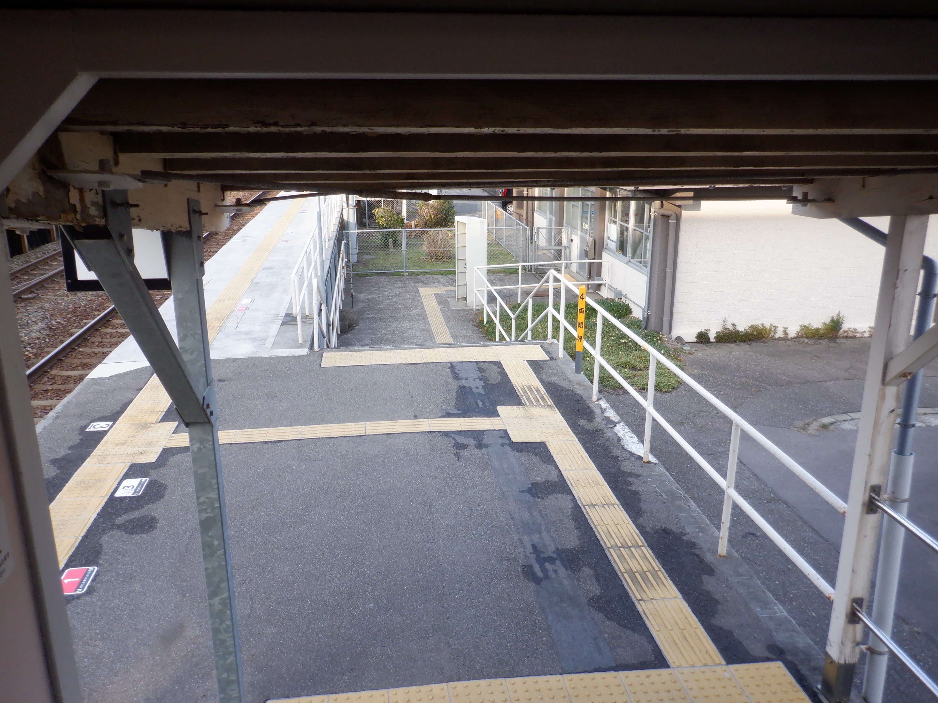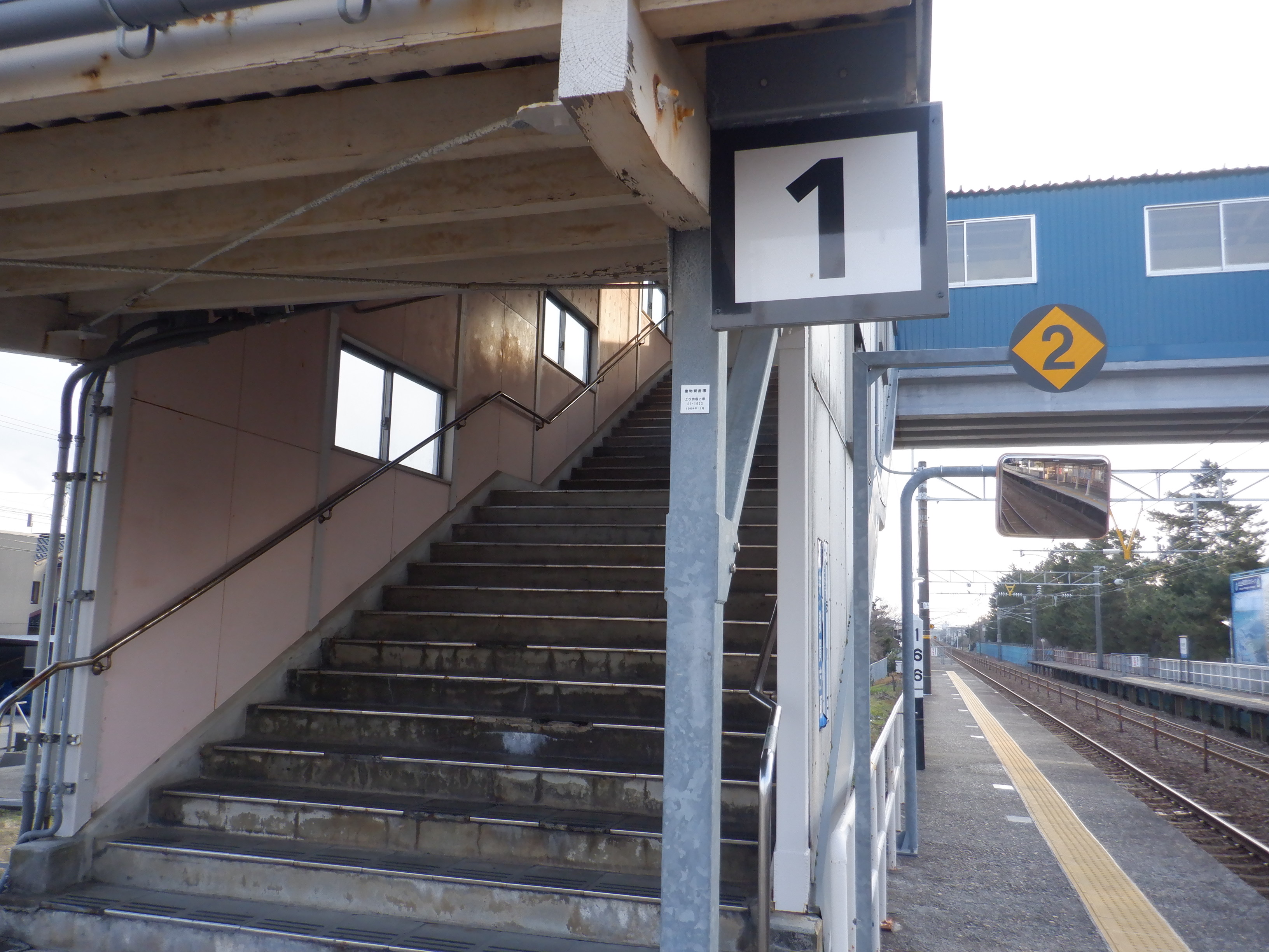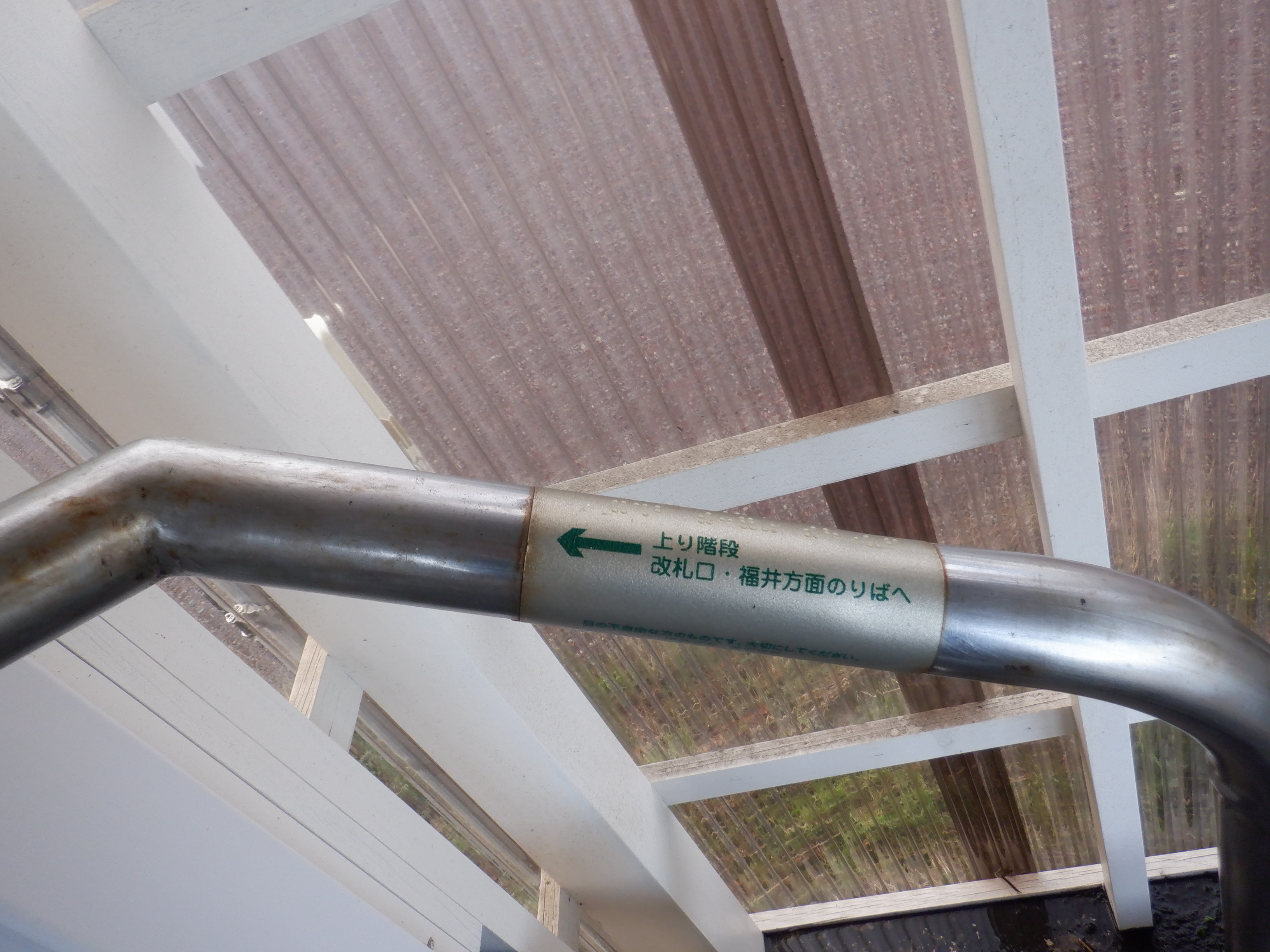 2番のりば上屋付近から。この時点で跨線橋階段の手すりの案内が新しくなったのが確認できます。