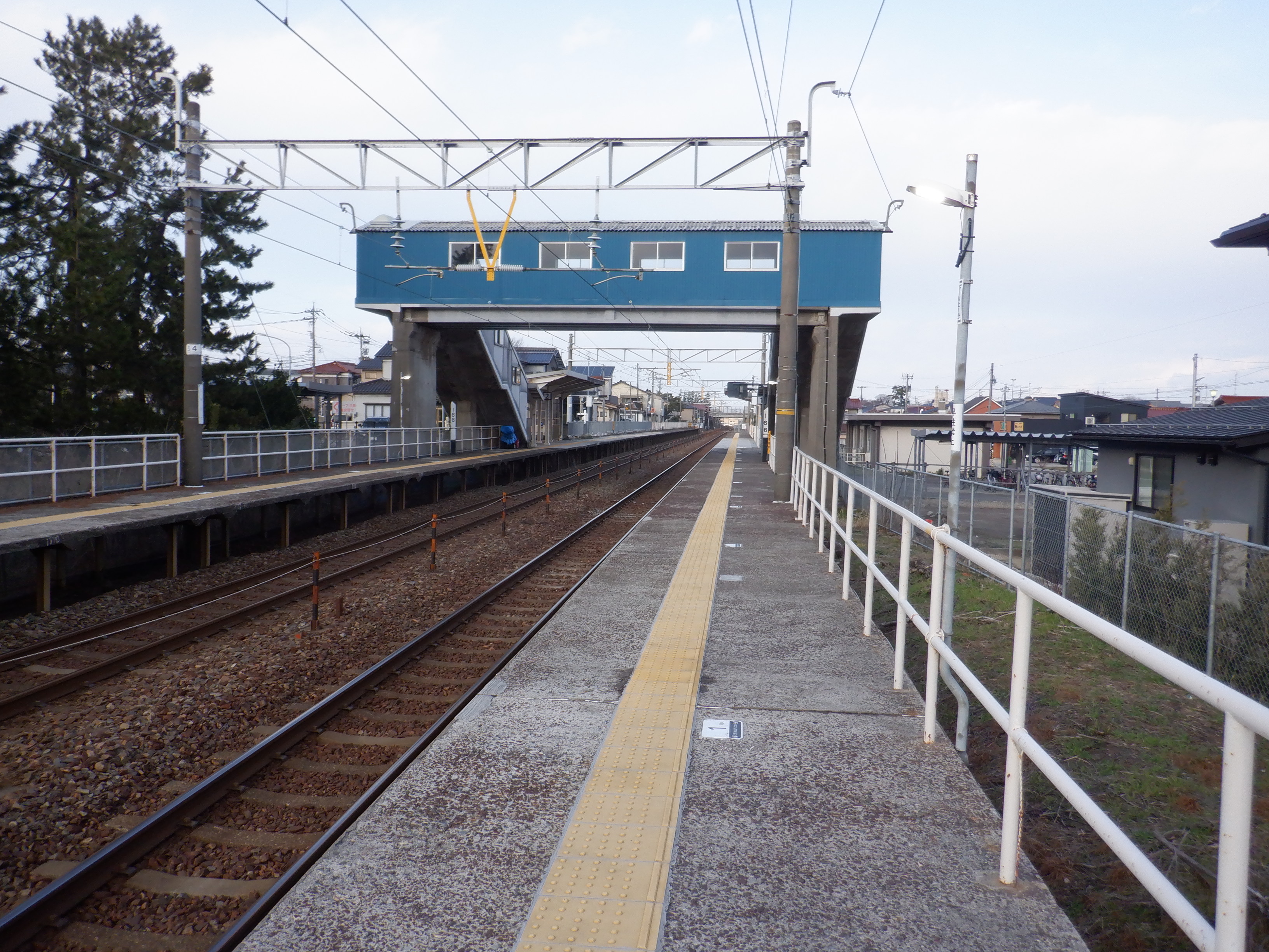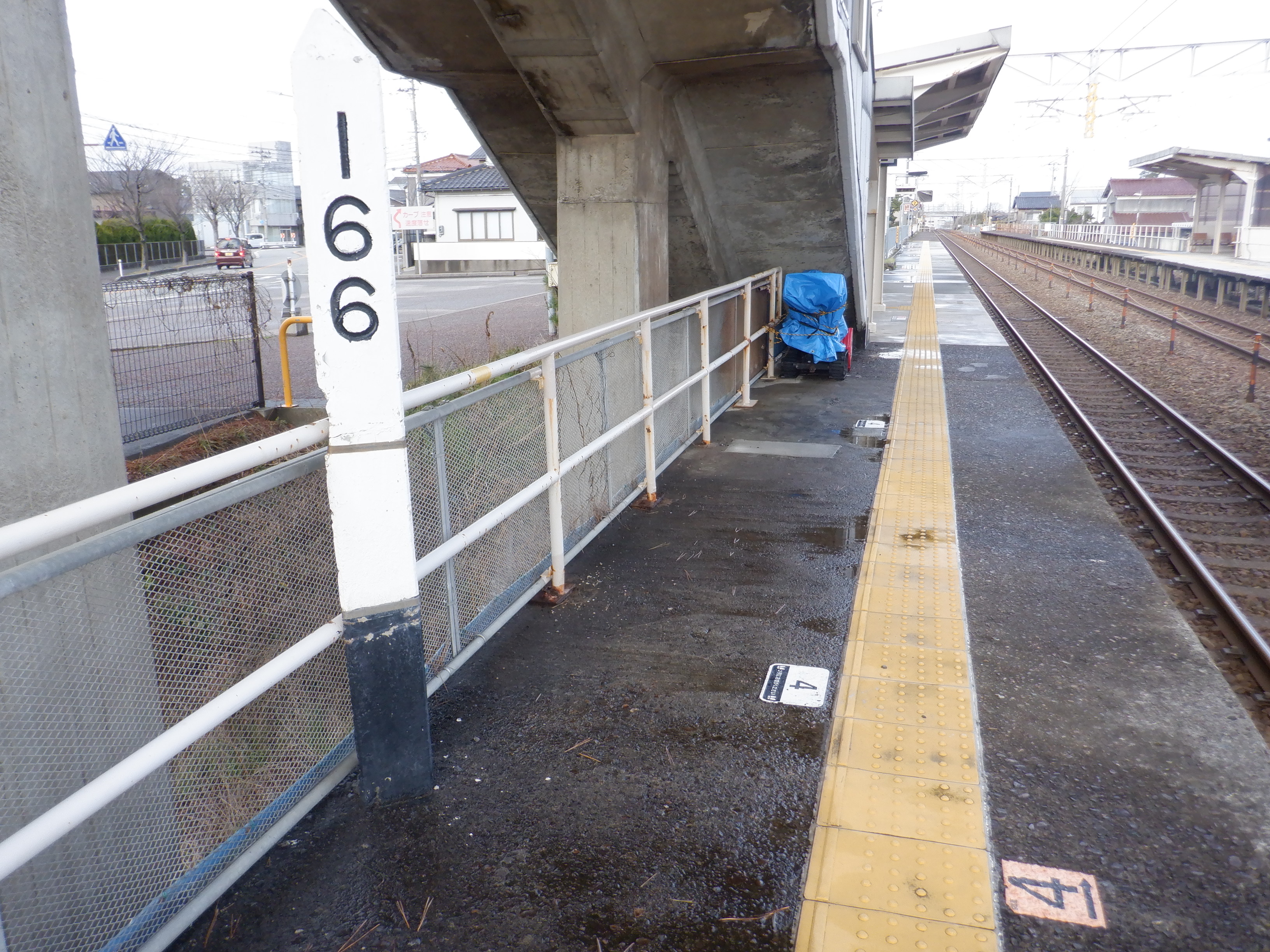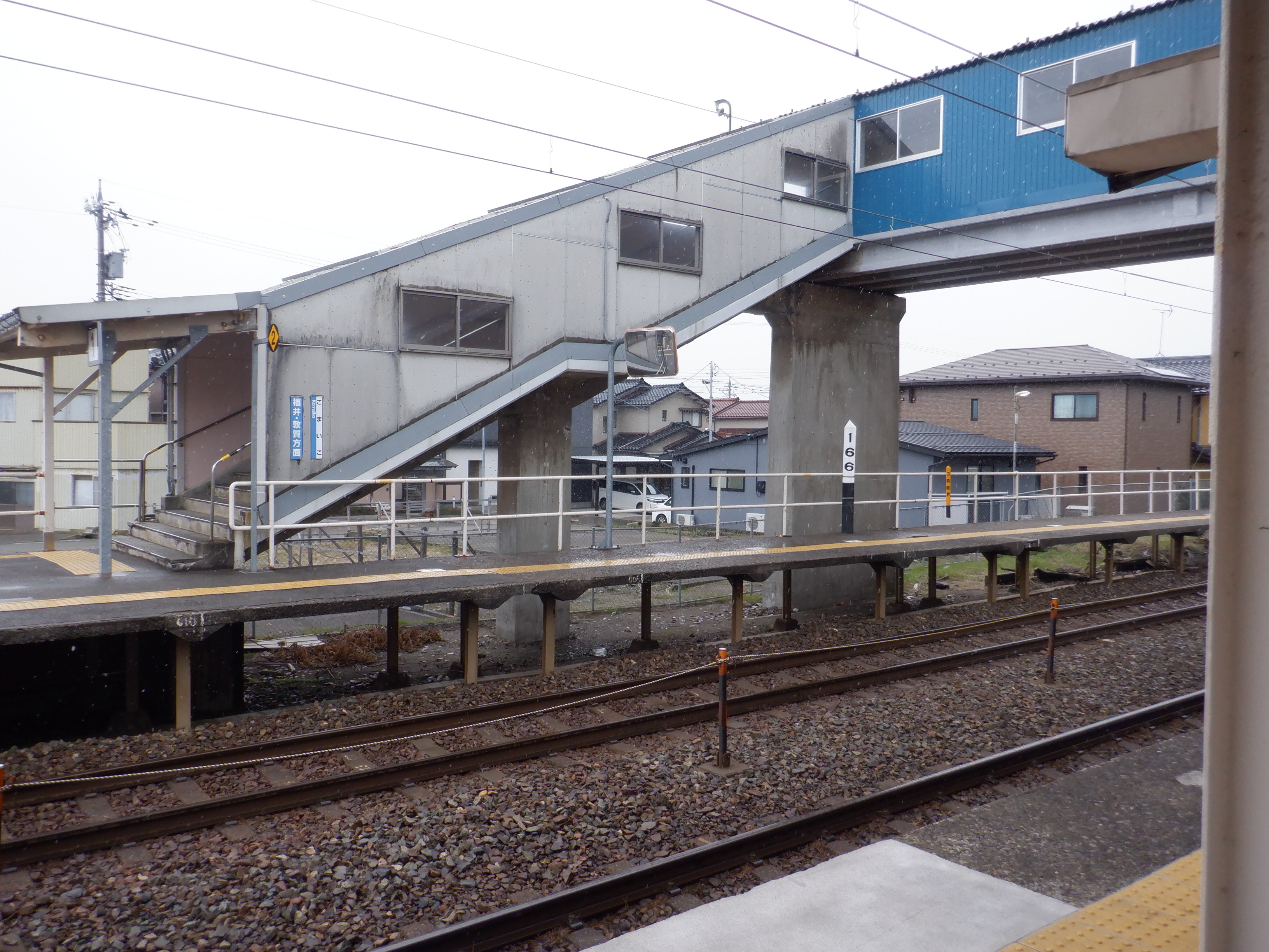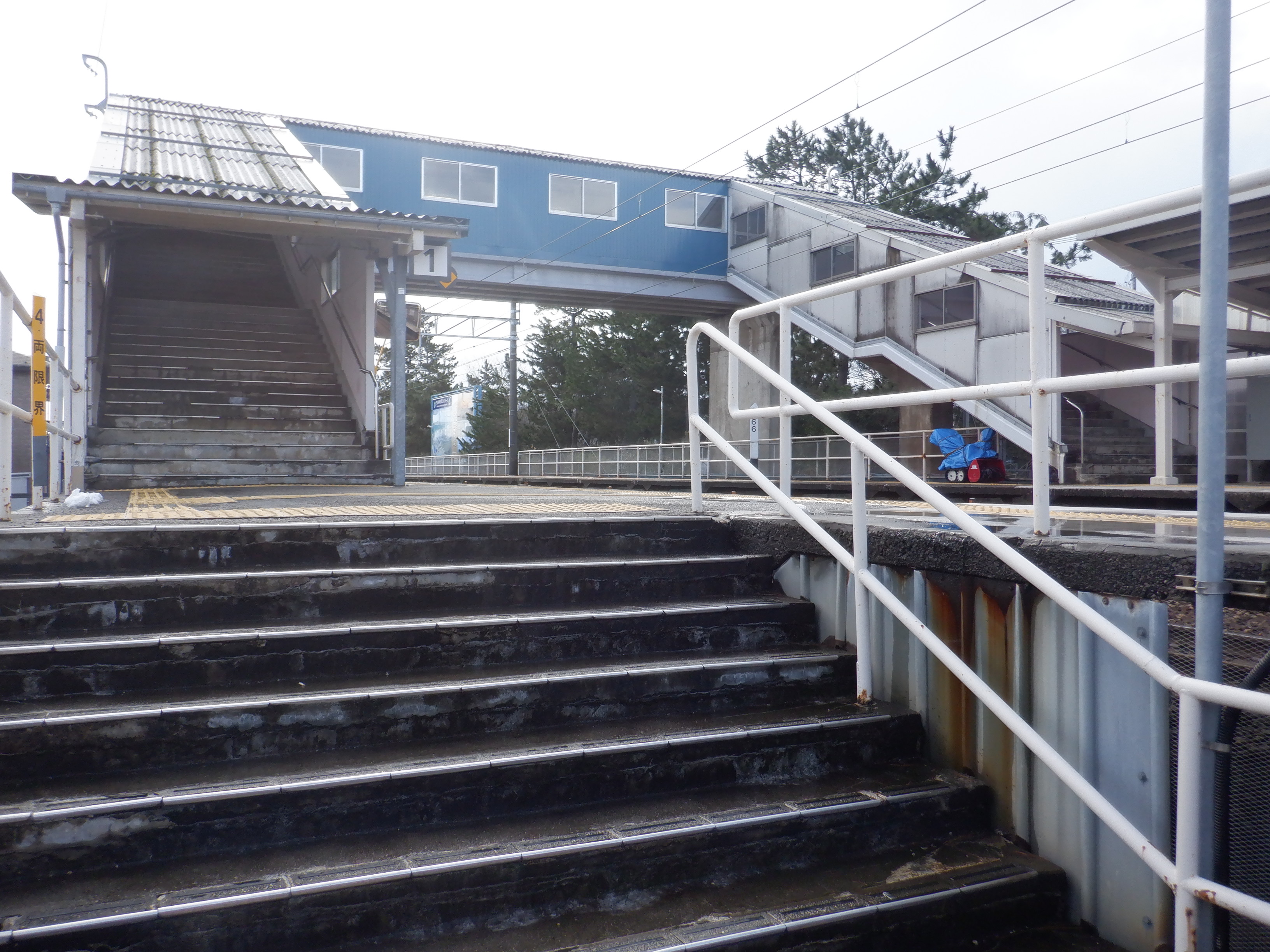 2番のりば上屋付近から。この時点で跨線橋階段の手すりの案内が新しくなったのが確認できます。