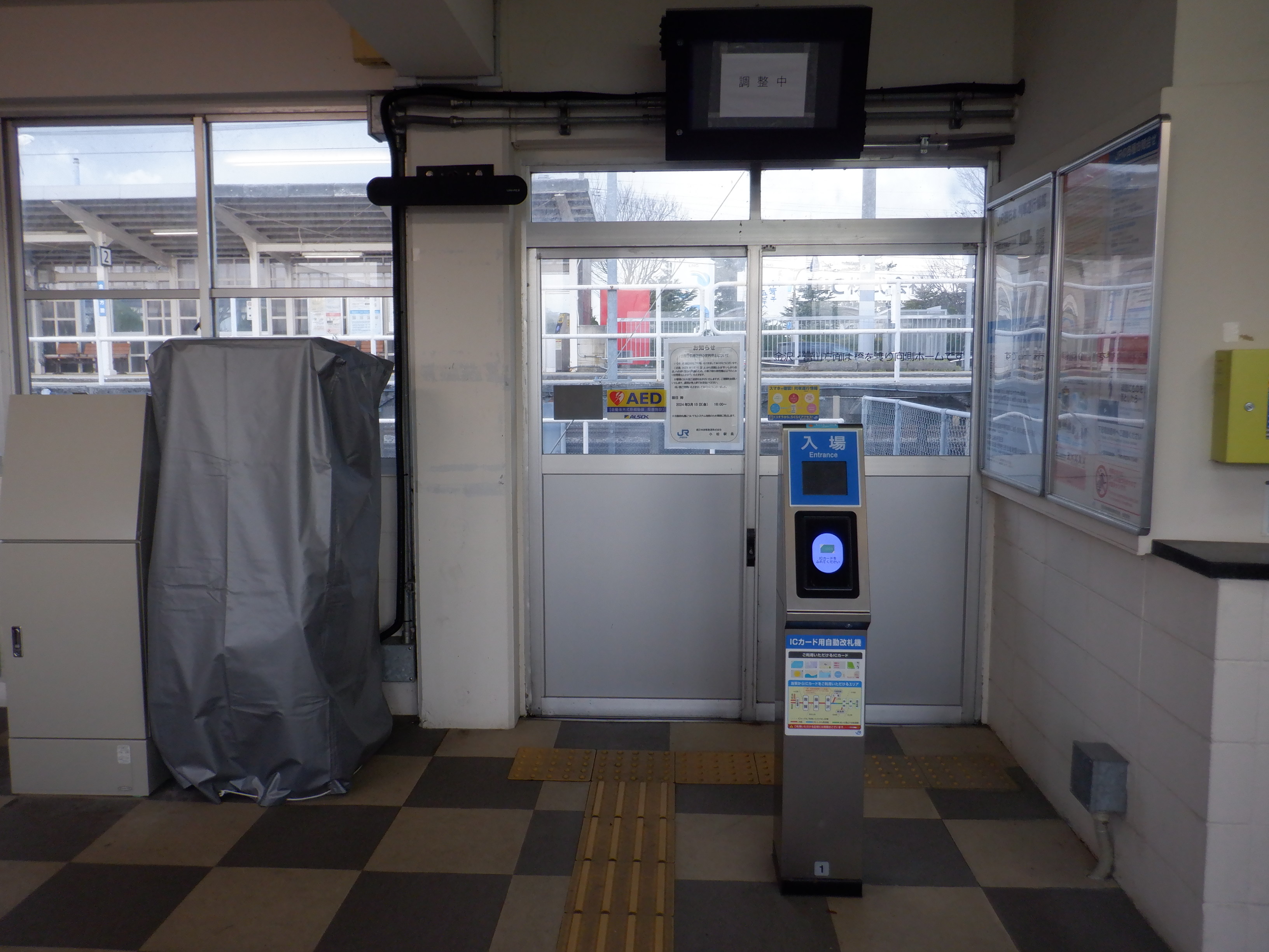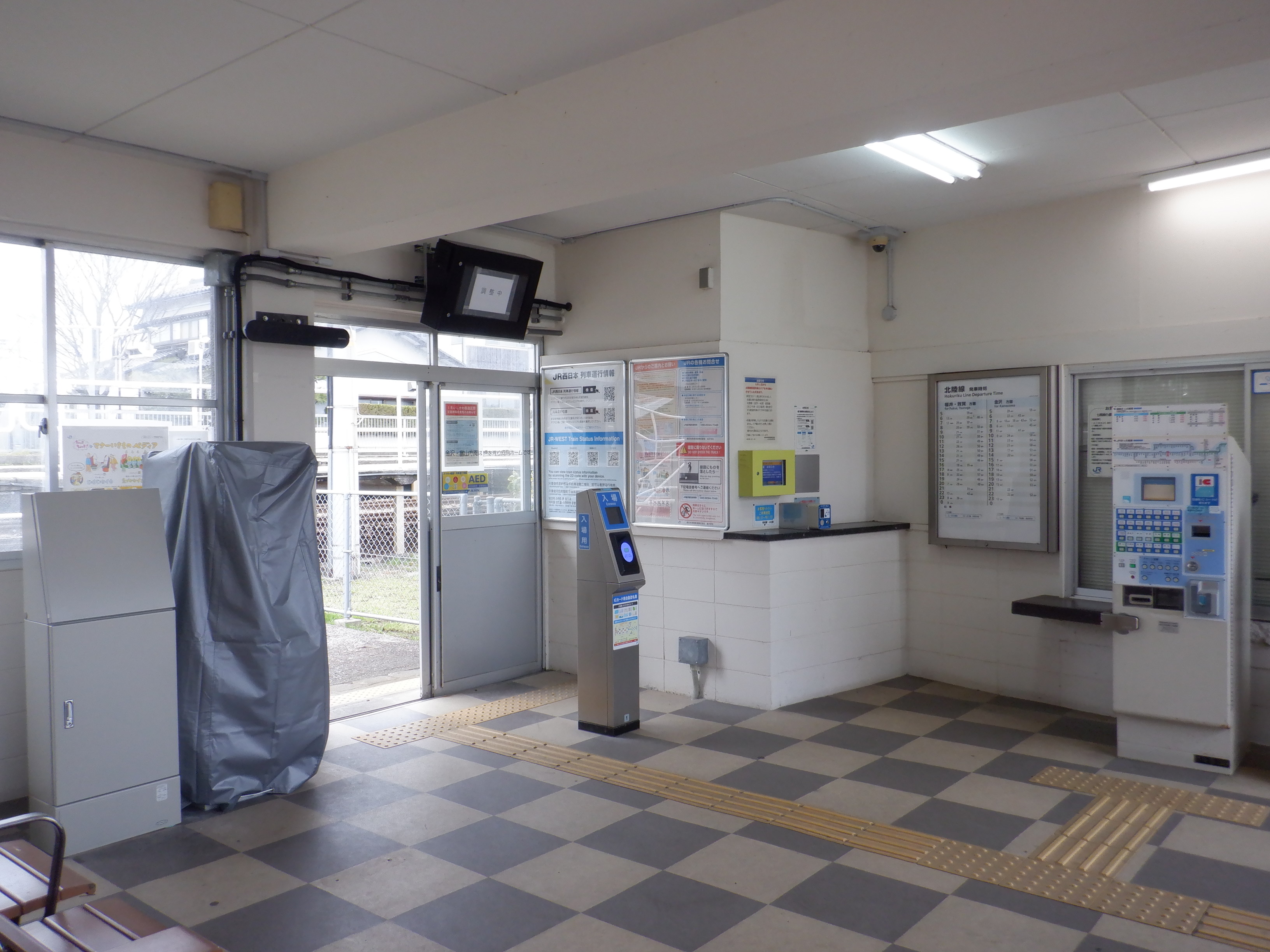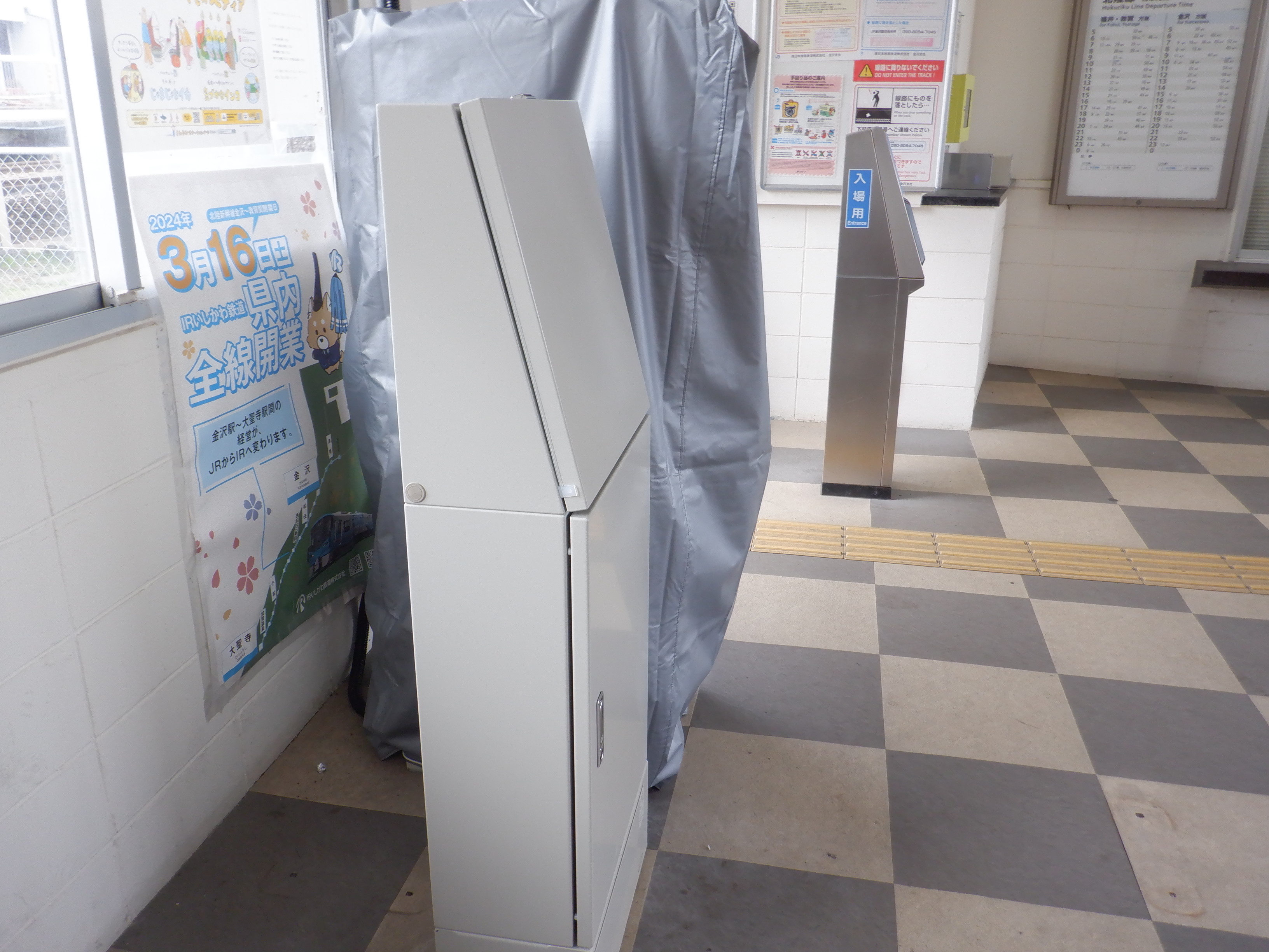 カバーを被った移管後の券売機。その後ろにIRいしかわ鉄道県内全線開業ポスターがあります。